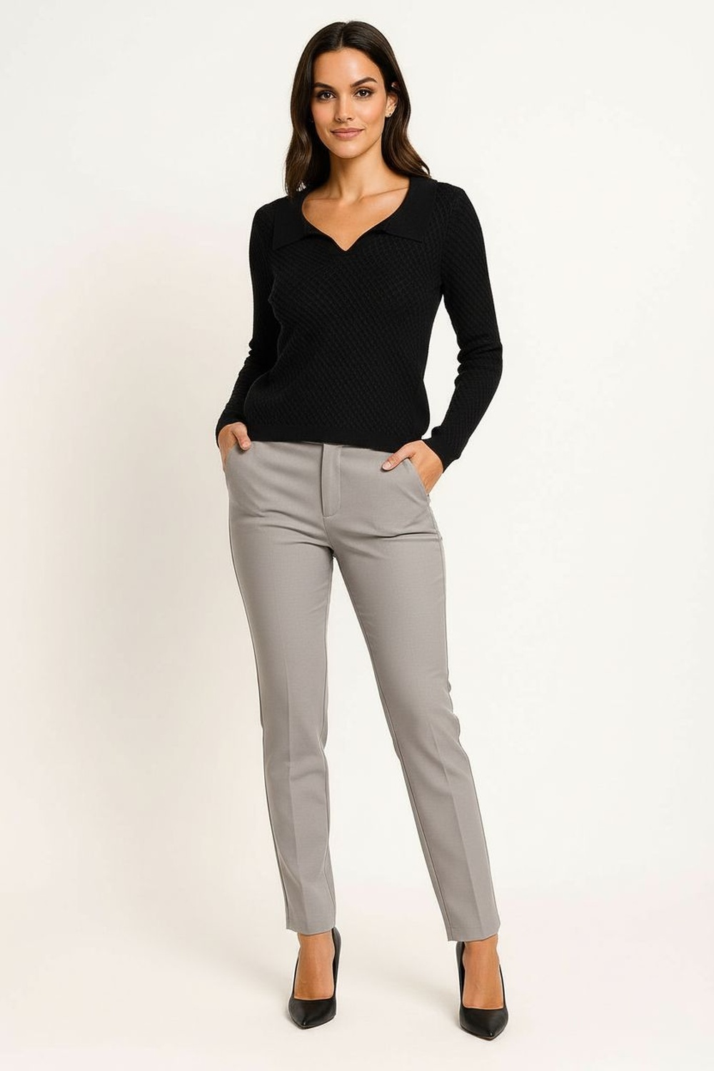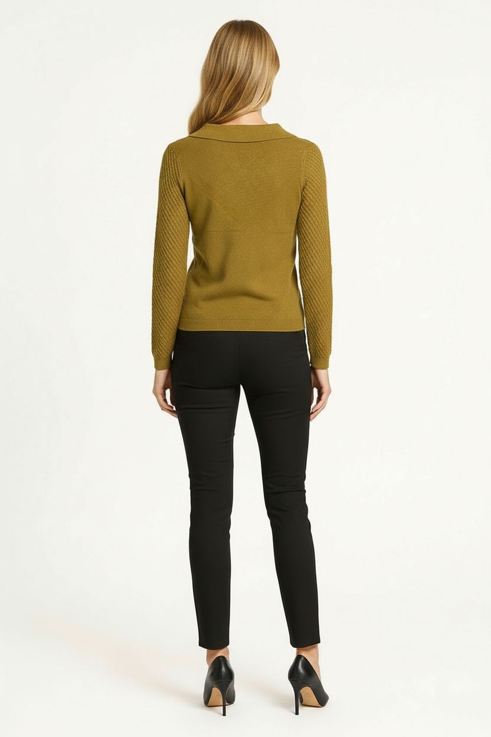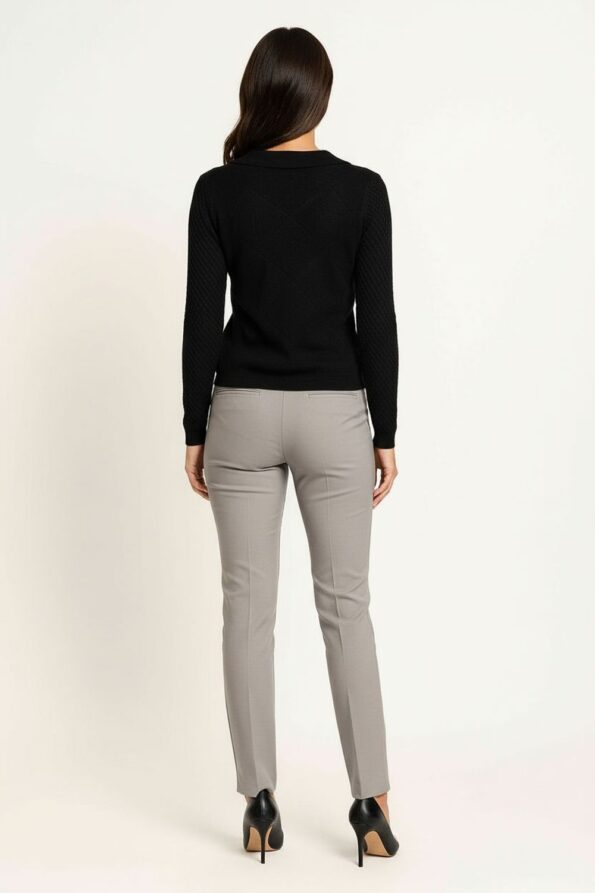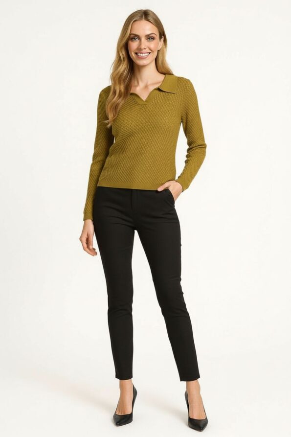 Suéter tejido de manga larga con cuello camisero que aporta un estilo moderno y versátil, diseño con aletilla media que realza el acabado clásico, confección en punto texturizado que asegura comodidad y elasticidad, puños y dobladillo reforzados que mantienen la estructura de la prenda y brindan mayor resistencia, ajuste favorecedor que resalta la silueta con un toque sofisticado