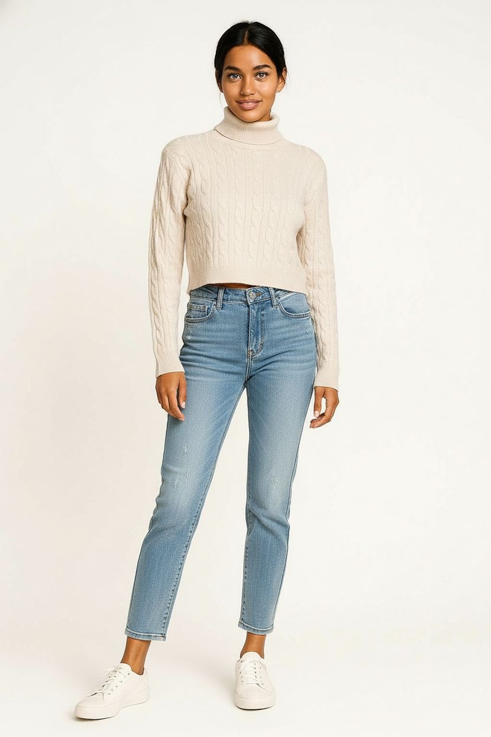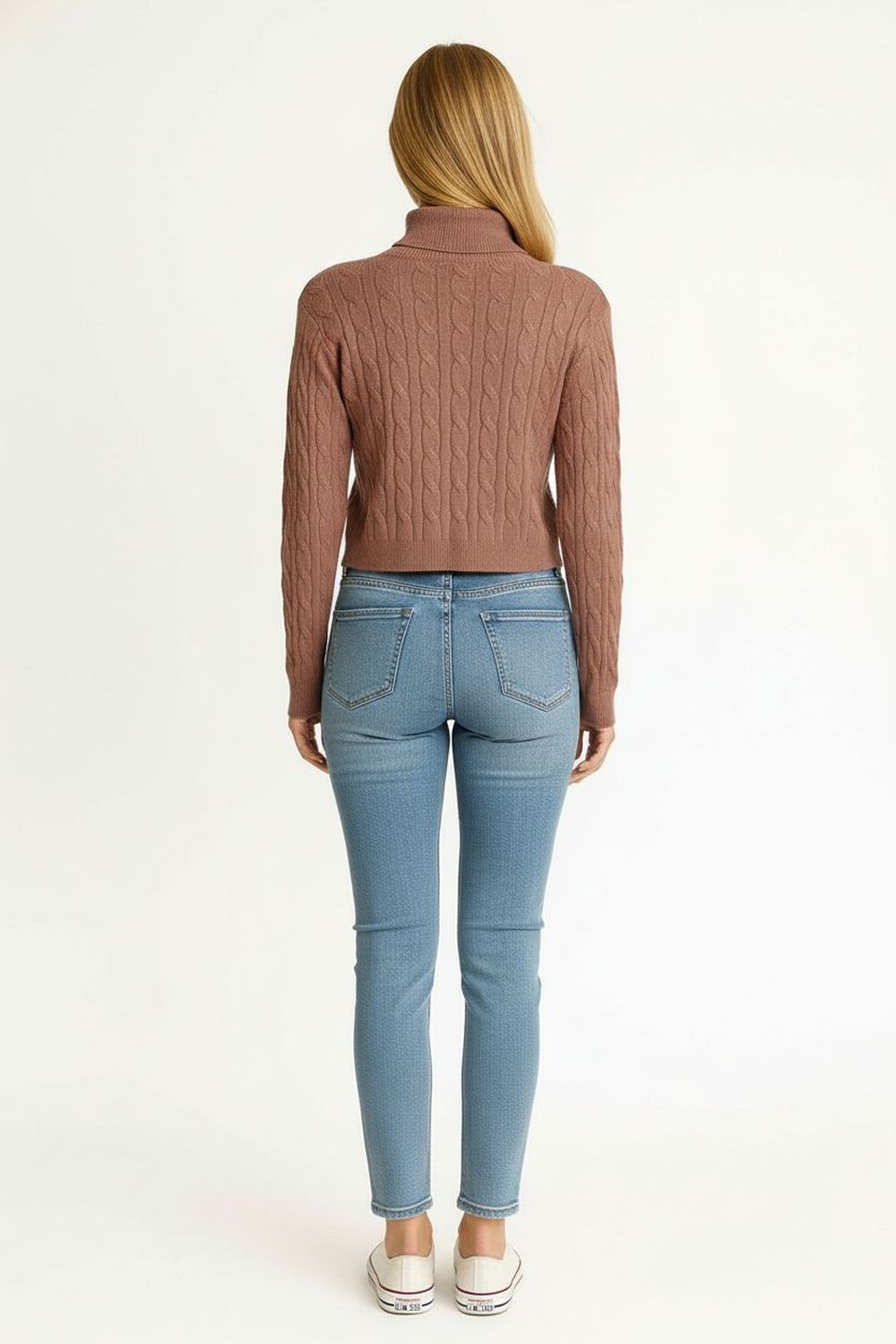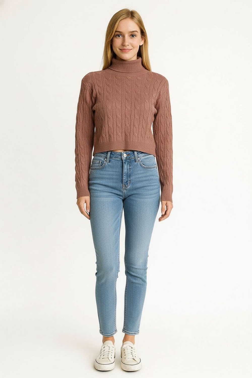 Suéter tejido con diseño de trenzas que aporta textura y estilo clásico, cuello alto que brinda abrigo y un toque sofisticado, manga larga con ajuste cómodo que favorece la movilidad, confección en punto elástico que se adapta suavemente al cuerpo ofreciendo confort y elegancia