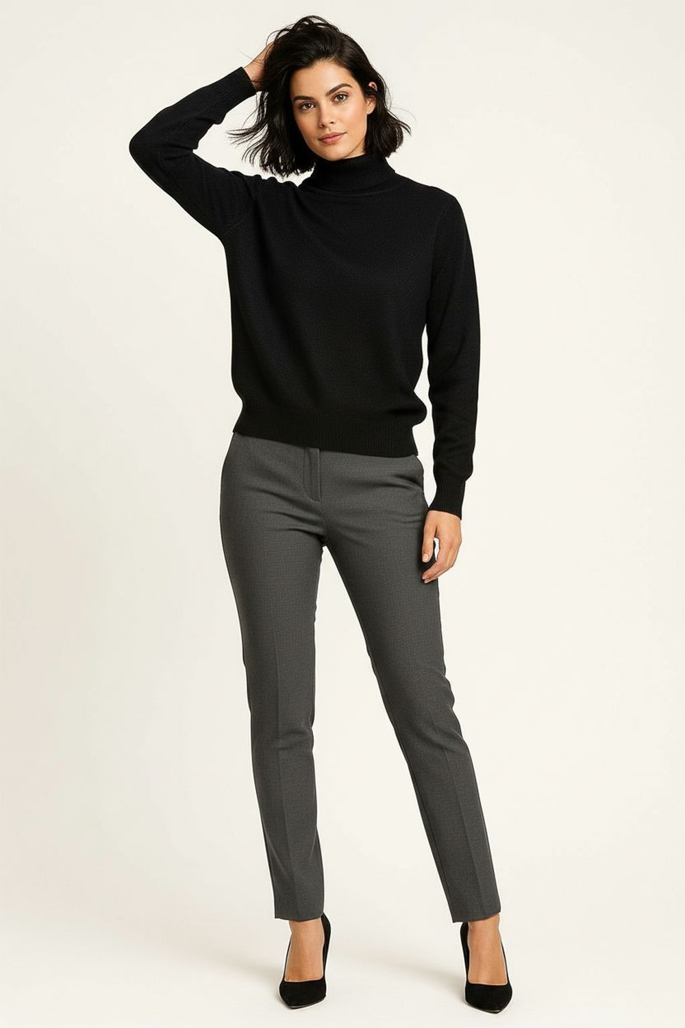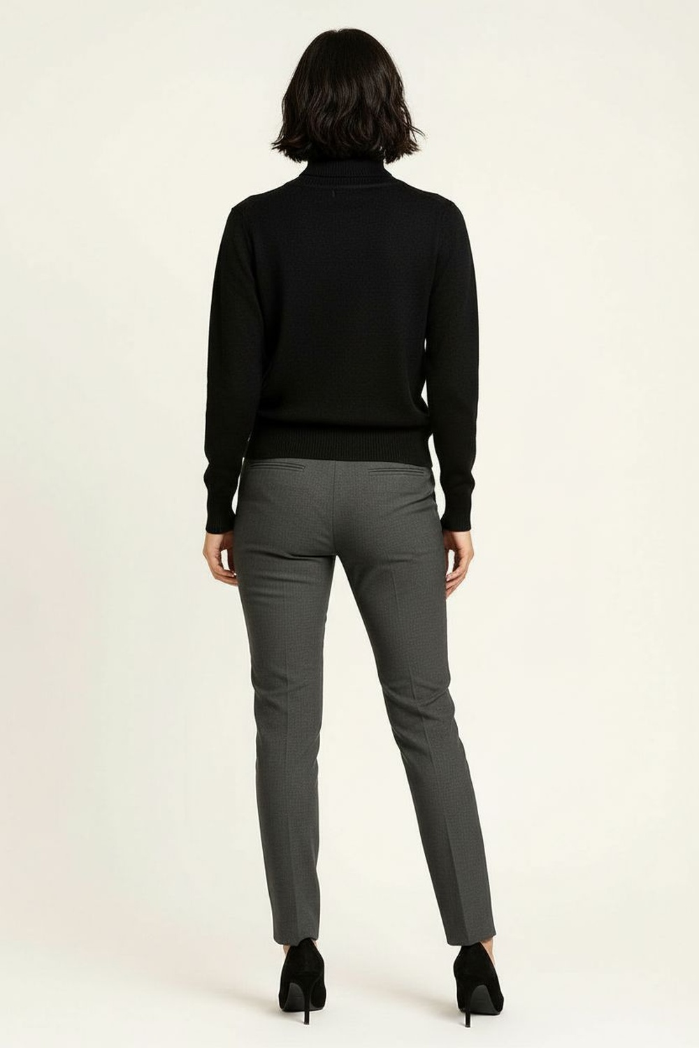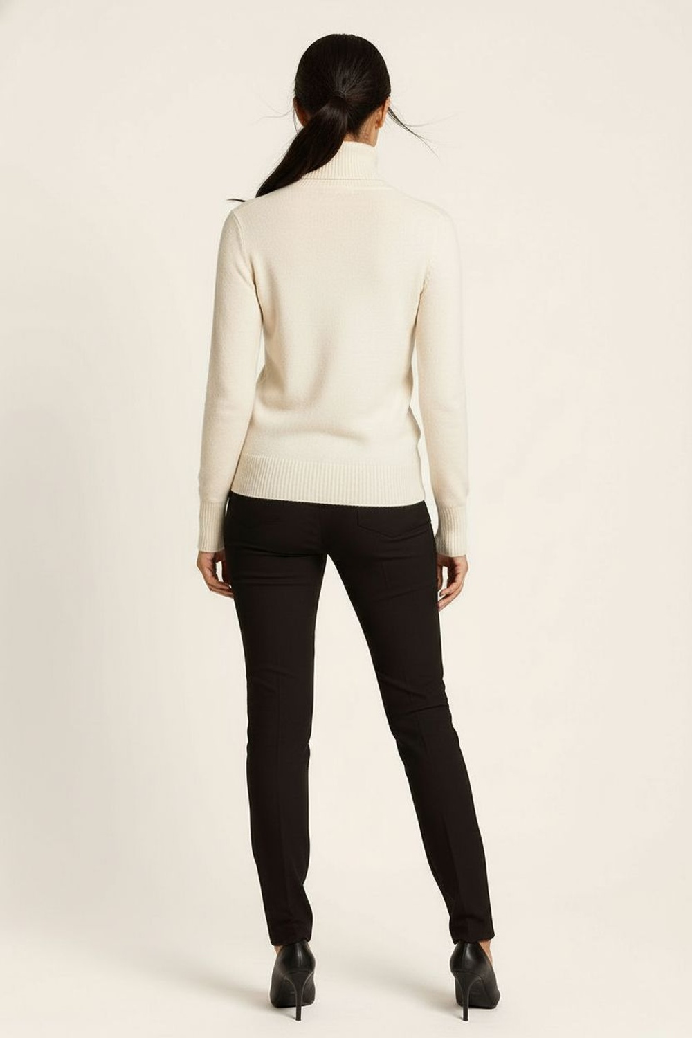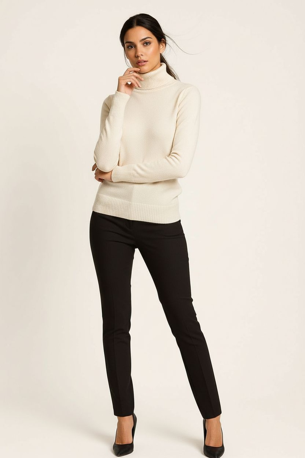 Suéter de manga larga con cuello alto ajustado, confeccionado en tejido de punto elástico que brinda suavidad y confort, diseño básico con acabado fino que permite crear múltiples combinaciones, corte entallado que favorece la figura y resalta la silueta, terminaciones reforzadas para mayor durabilidad y ajuste perfecto