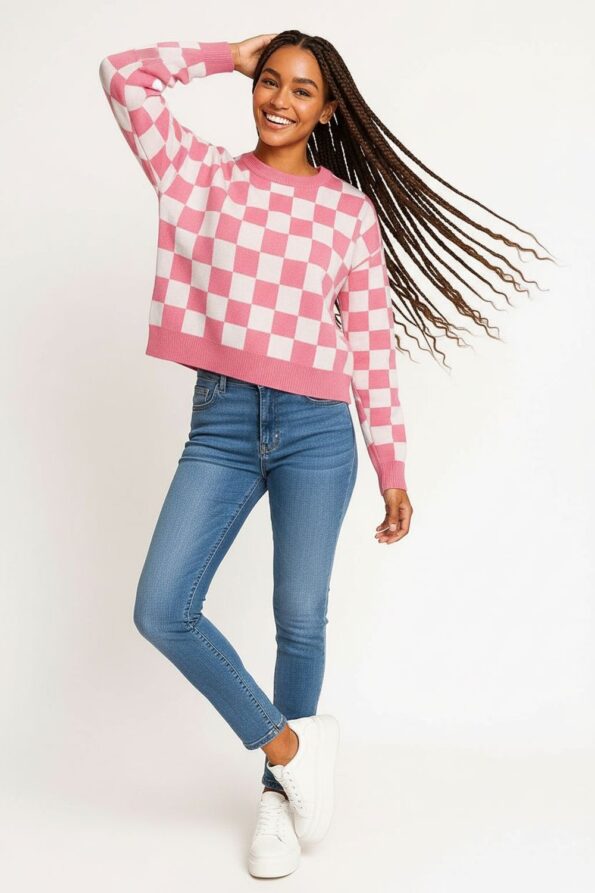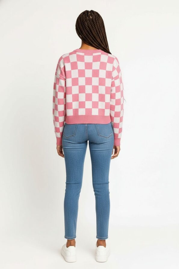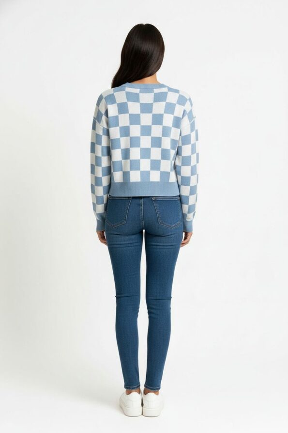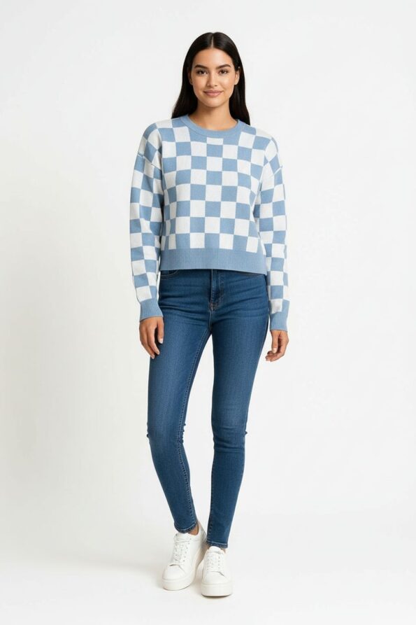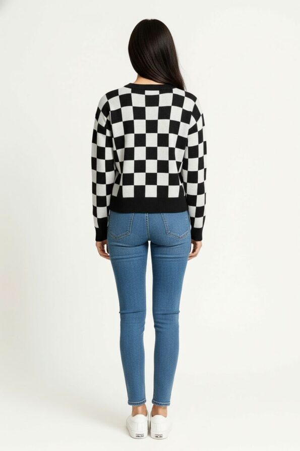 Suéter de manga larga confeccionado en tejido de viscosa suave con diseño geométrico que aporta un toque moderno, cuello redondo con acabado acanalado que brinda confort, corte corto que realza la figura y estructura ligera que permite libertad de movimiento, ideal para crear combinaciones casuales con estilo