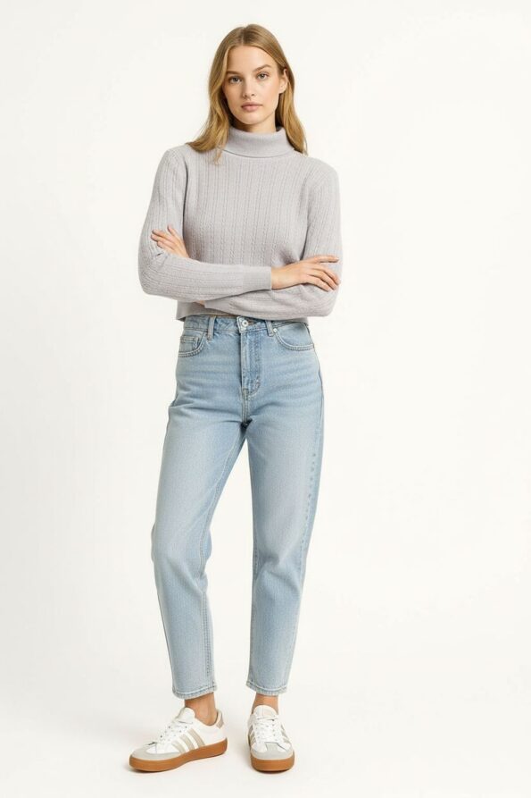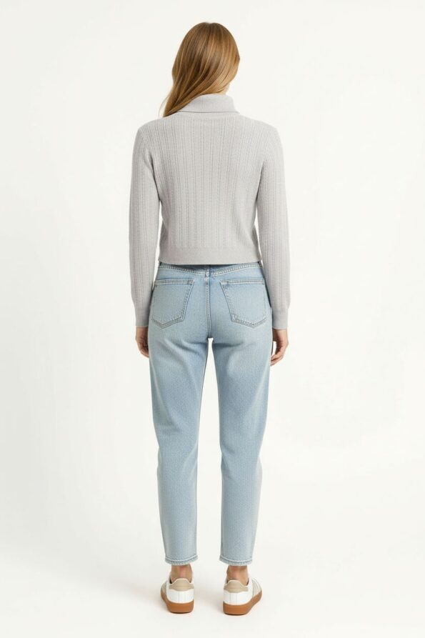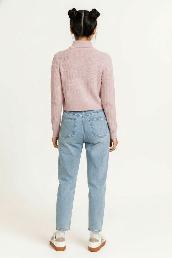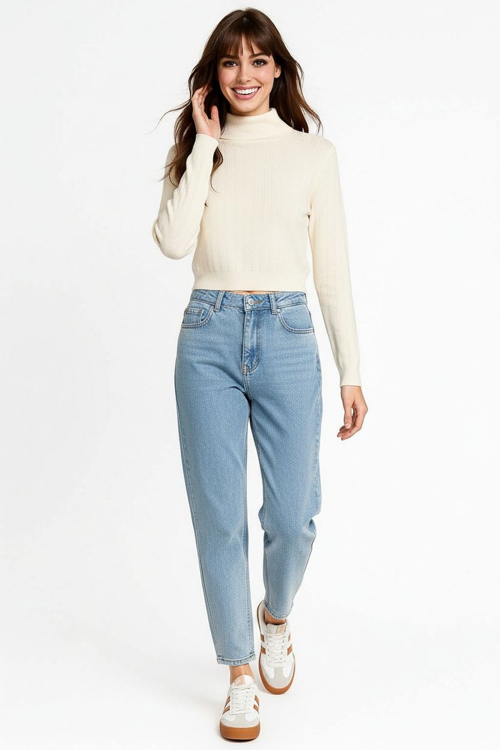 Suéter de manga larga con cuello alto ajustado que brinda estilo y protección, confección en tejido suave con textura ligera, corte crop que realza la silueta con terminación recta, costuras resistentes que aportan mayor durabilidad, prenda versátil para climas frescos