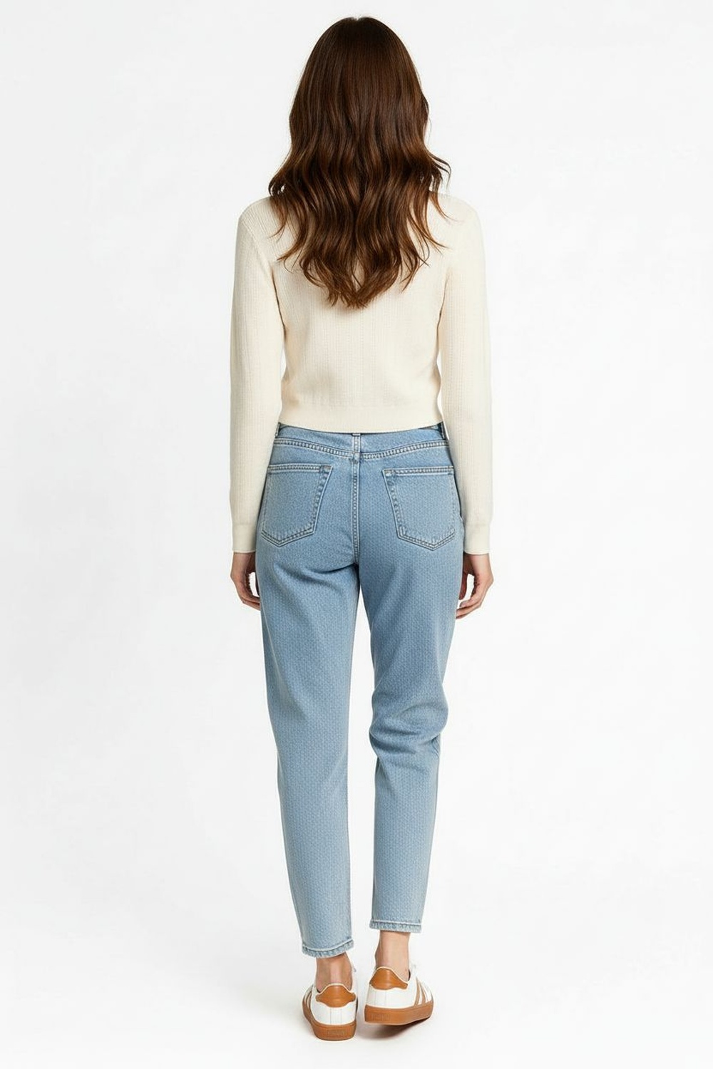 Suéter de manga larga confeccionado en tejido de viscosa suave con diseño geométrico que aporta un toque moderno, cuello redondo con acabado acanalado que brinda confort, corte corto que realza la figura y estructura ligera que permite libertad de movimiento, ideal para crear combinaciones casuales con estilo