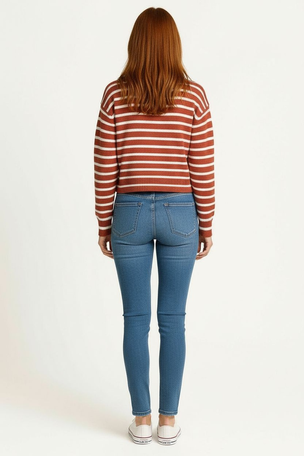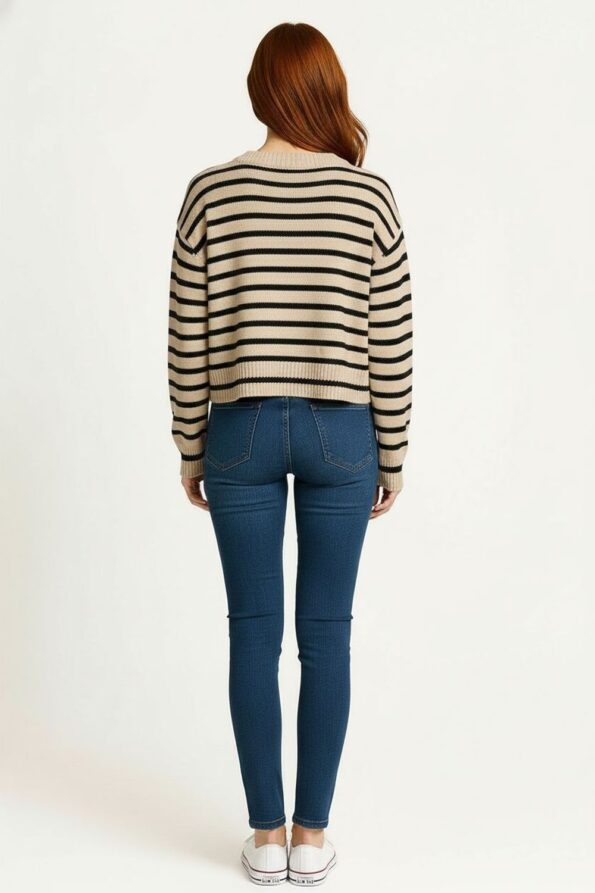 Suéter tejido con pretina ancha que define la silueta y brinda un ajuste favorecedor, escote en V que estiliza el cuello y aporta un toque femenino, manga larga con terminación ajustada que ofrece comodidad, confección en punto suave y elástico que proporciona abrigo y libertad de movimiento