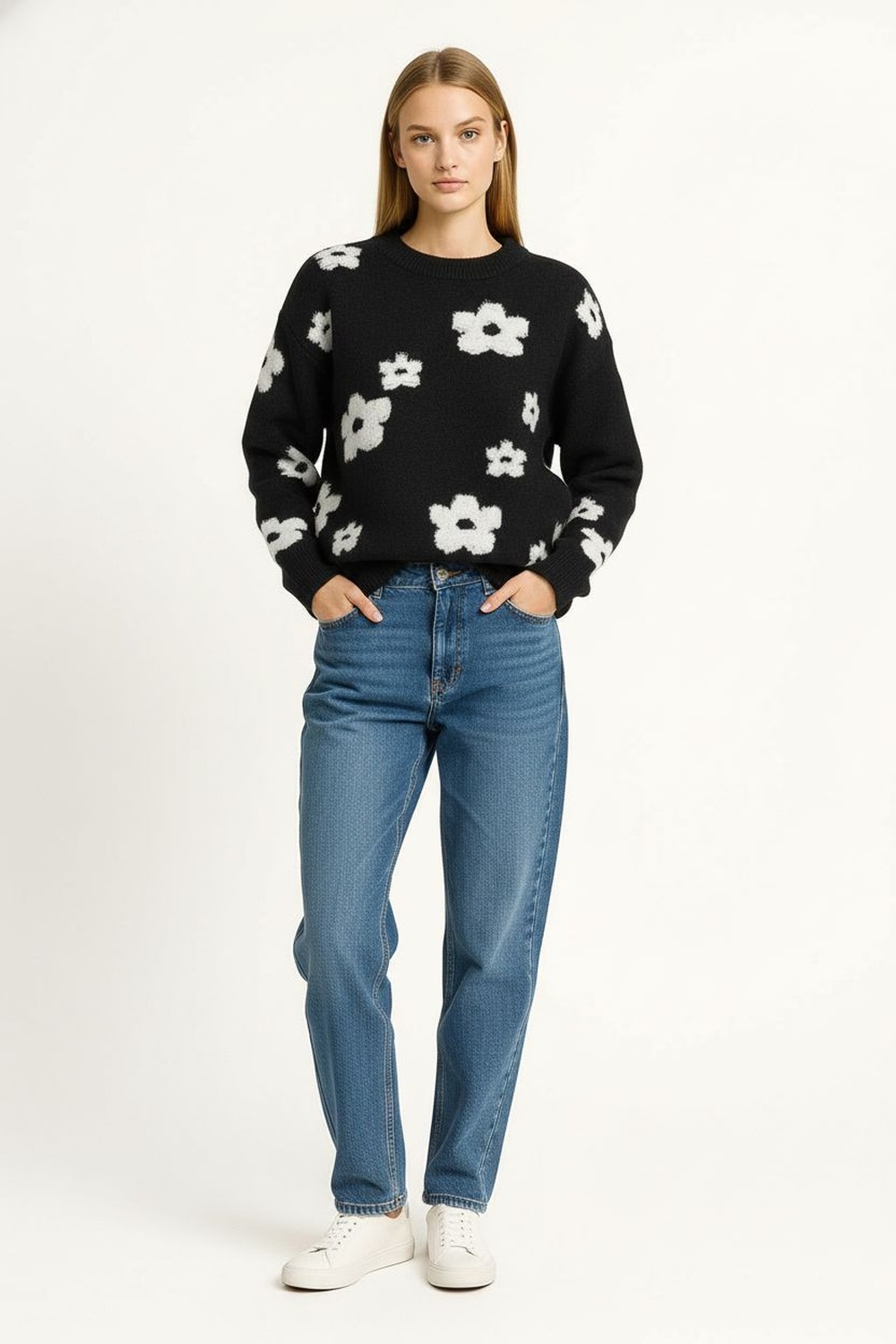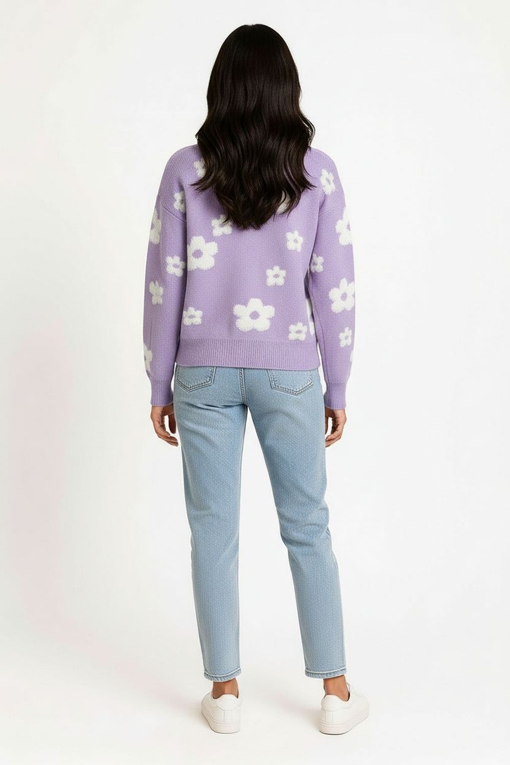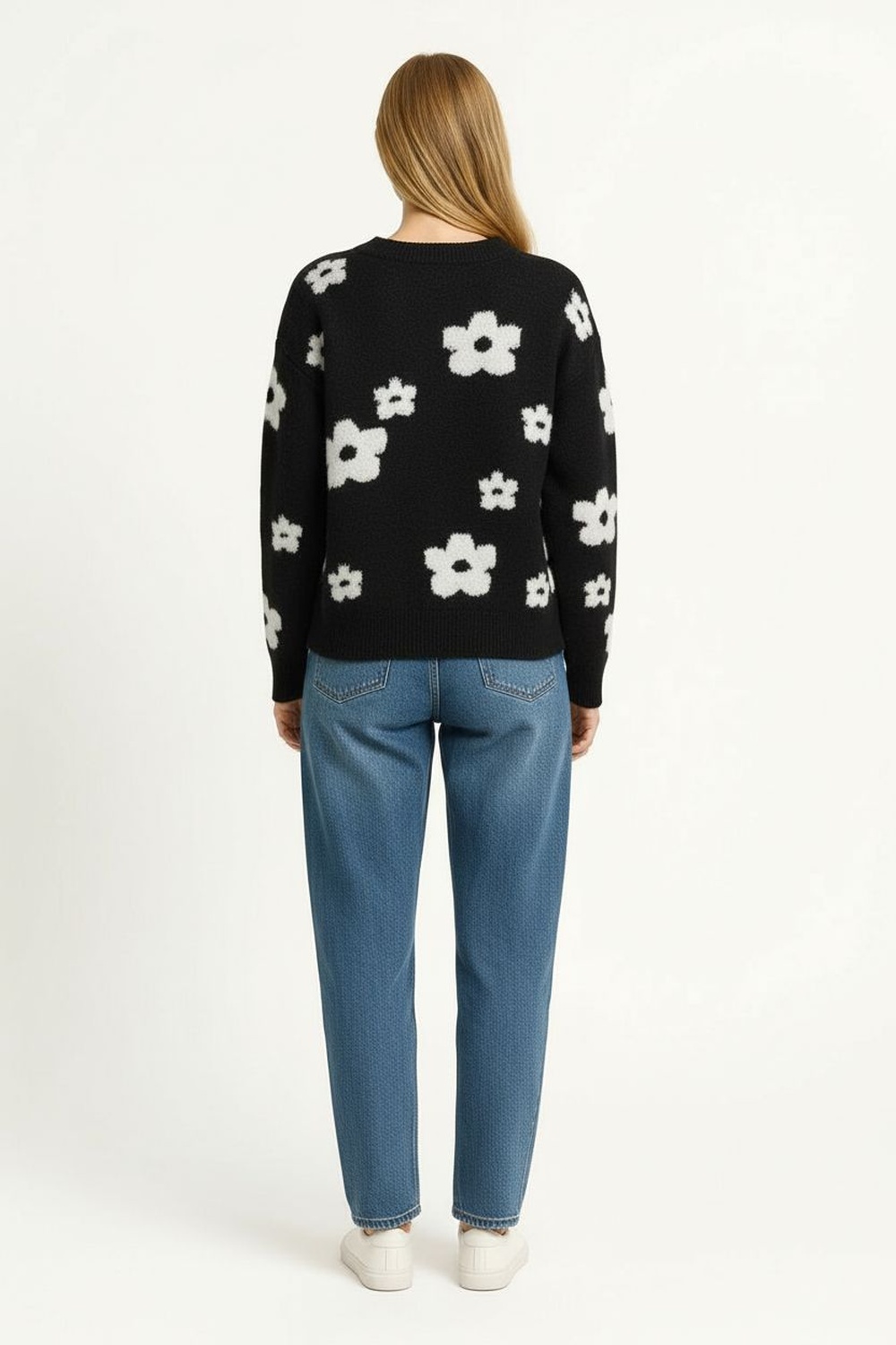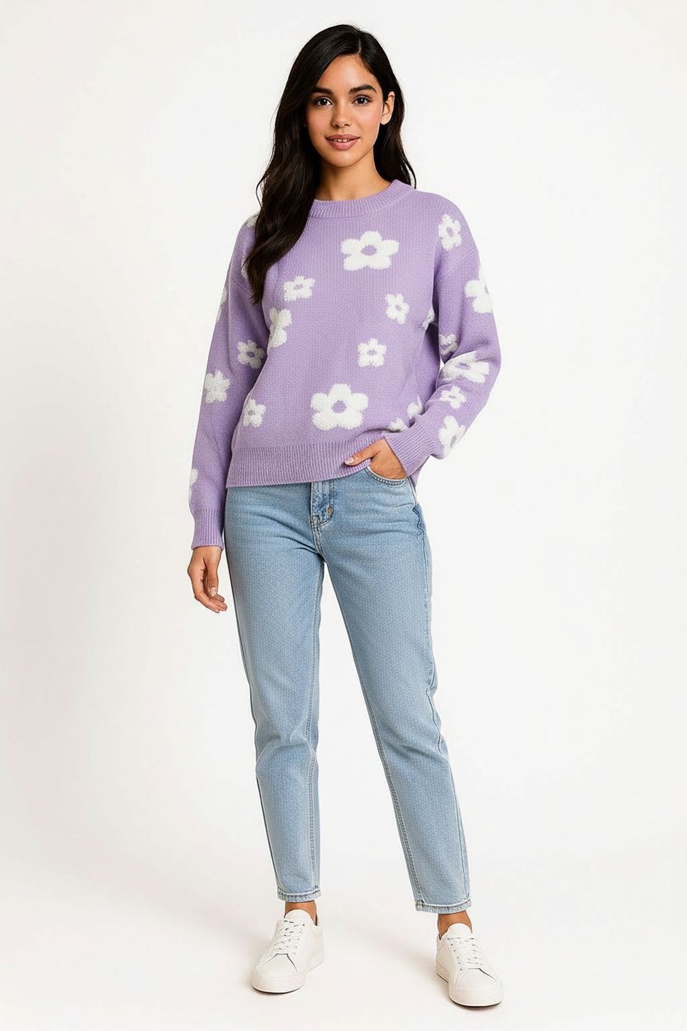 Sueter tejido grueso con textura suave, diseño con flores en relieve que aporta volumen, cuello redondo y terminaciones elásticas que garantizan ajuste y comodidad en el uso diario