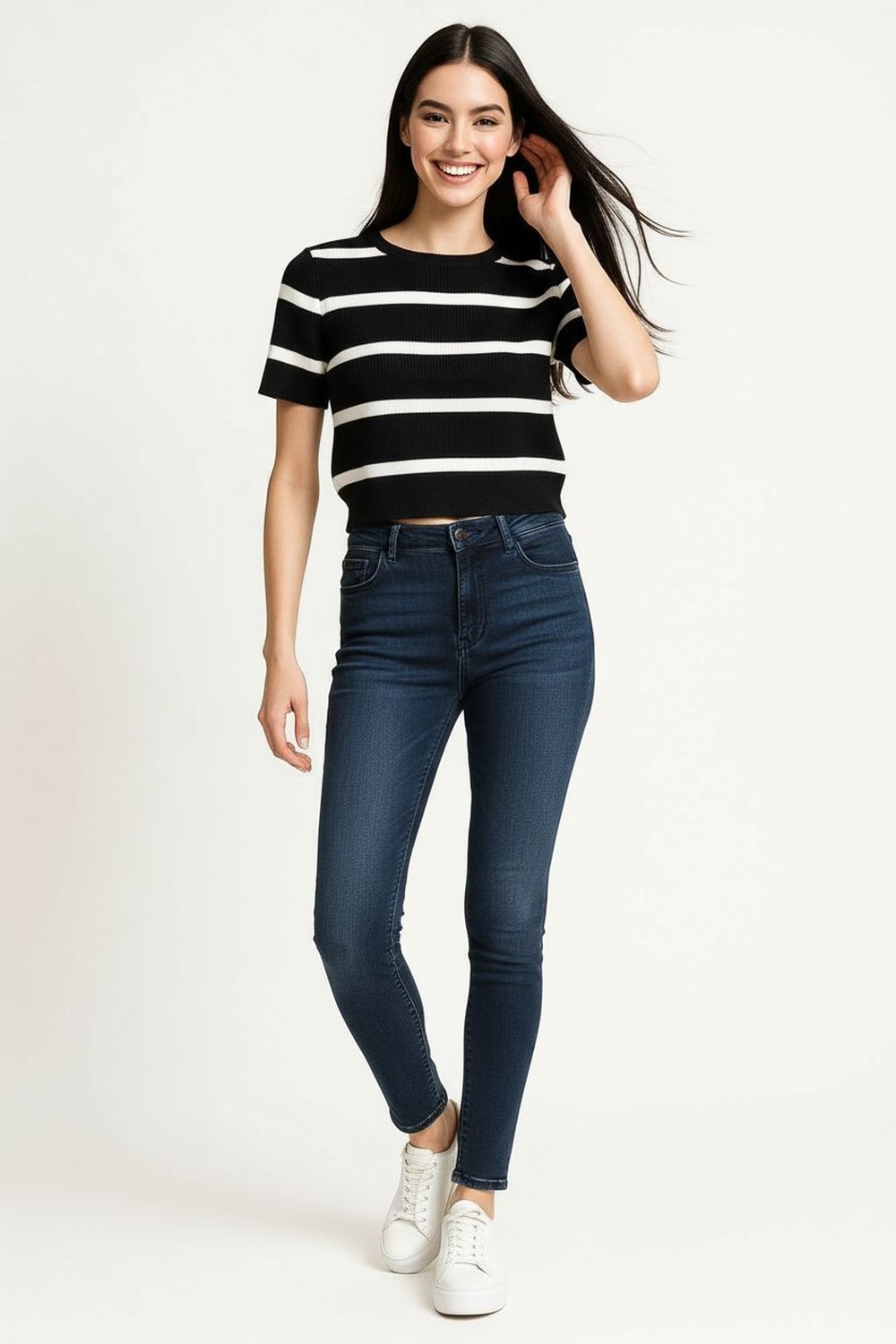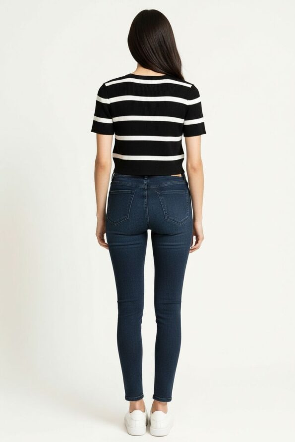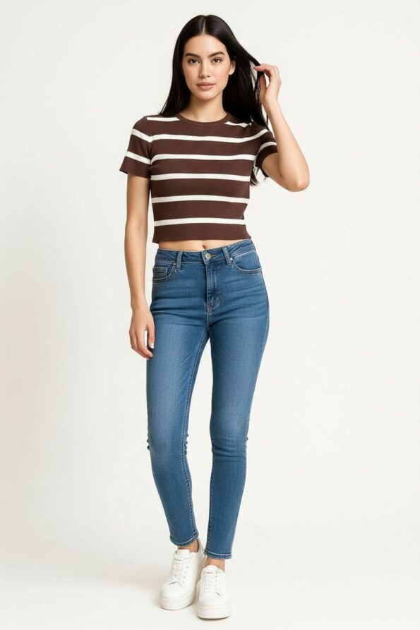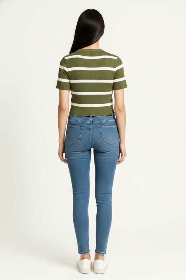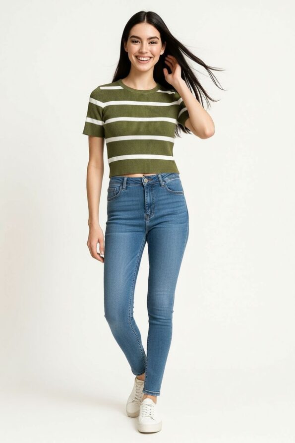 Suéter ligero de manga corta confeccionado en tejido de viscosa con textura acanalada que aporta suavidad y flexibilidad, cuello redondo con terminado limpio que enmarca el rostro, corte ajustado que realza la figura, diseño cómodo y versátil ideal para crear looks casuales con un toque moderno
