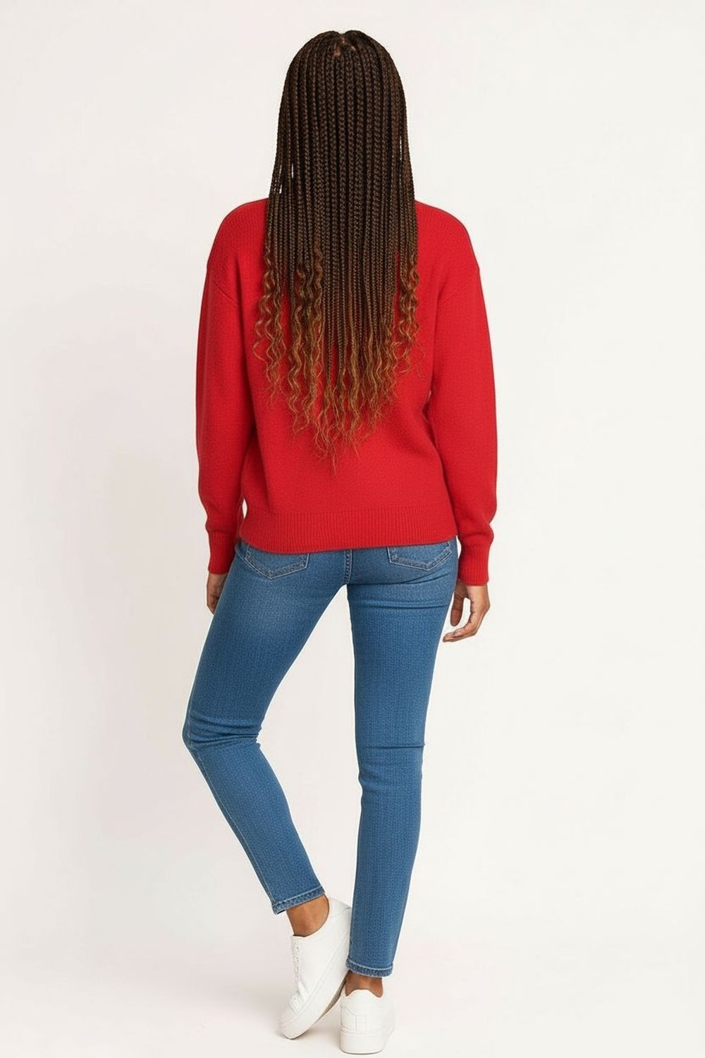 Suéter tejido con diseño aplicado de temática estacional al frente, acabado suave que brinda sensación cómoda durante el uso, cuello redondo de estructura clásica, mangas largas con ajuste sutil en puños, confección de punto que aporta estructura ligera y mantiene buena caída en la prenda