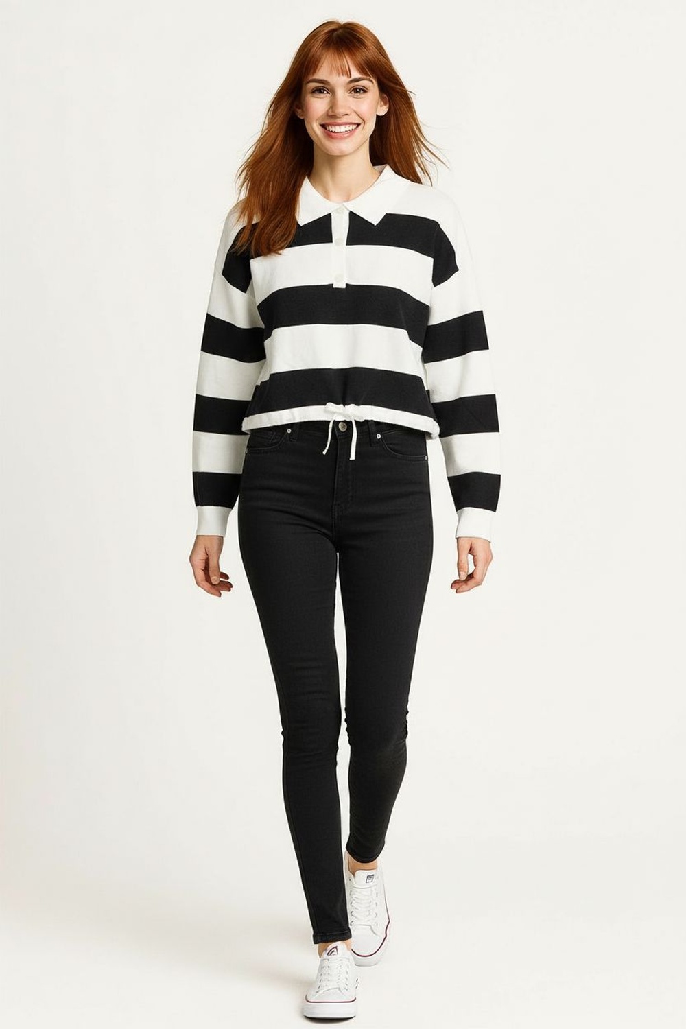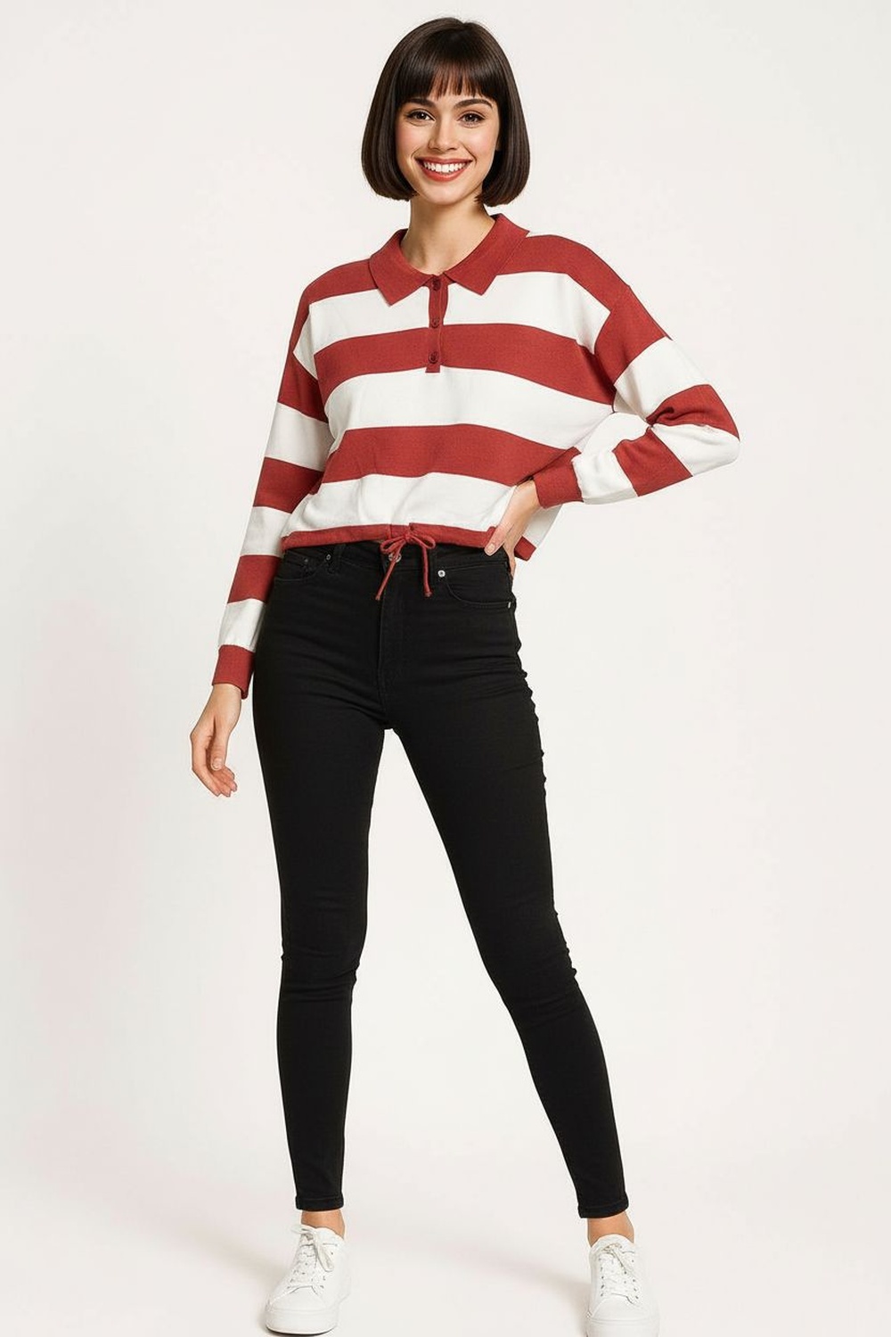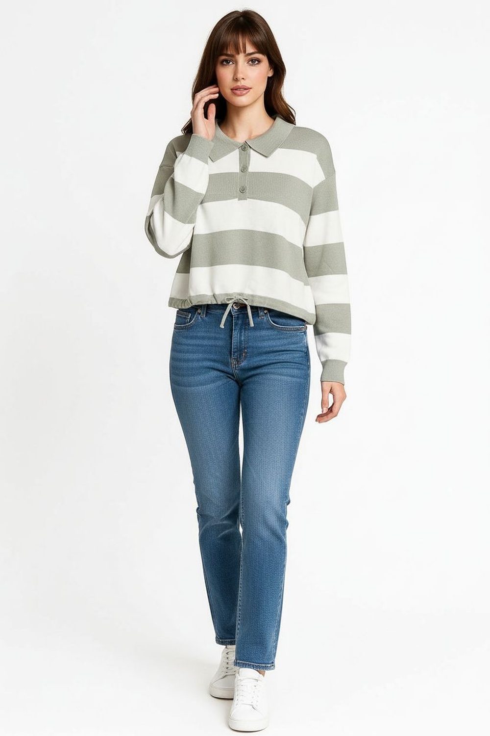 Suéter tipo polo con cuello abierto y escote en V, confeccionado en tejido de punto con textura ligera que ofrece comodidad y frescura, diseño con jareta ajustable en cintura que permite personalizar el entalle, mangas largas con puño ceñido que aportan un acabado limpio y moderno
