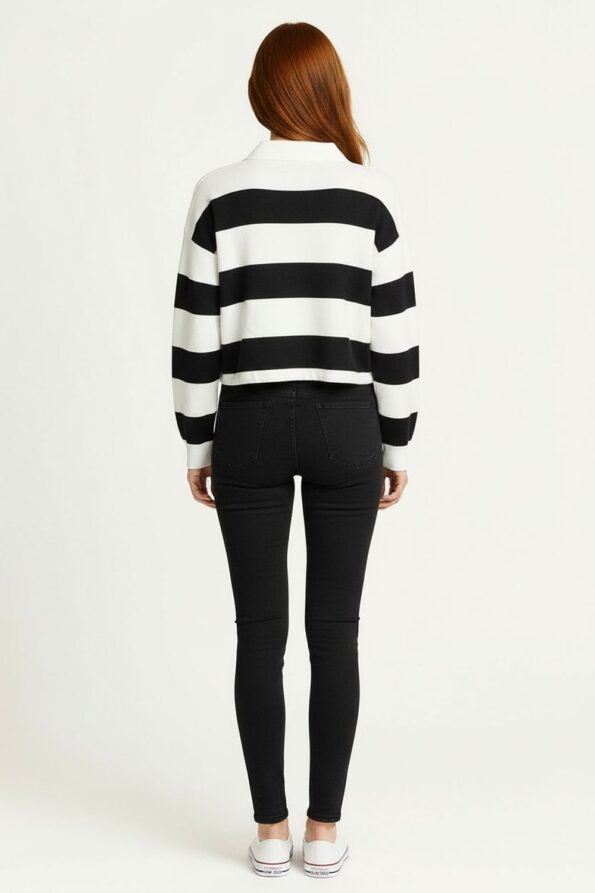 Suéter de manga larga confeccionado en tejido de viscosa suave con diseño geométrico que aporta un toque moderno, cuello redondo con acabado acanalado que brinda confort, corte corto que realza la figura y estructura ligera que permite libertad de movimiento, ideal para crear combinaciones casuales con estilo