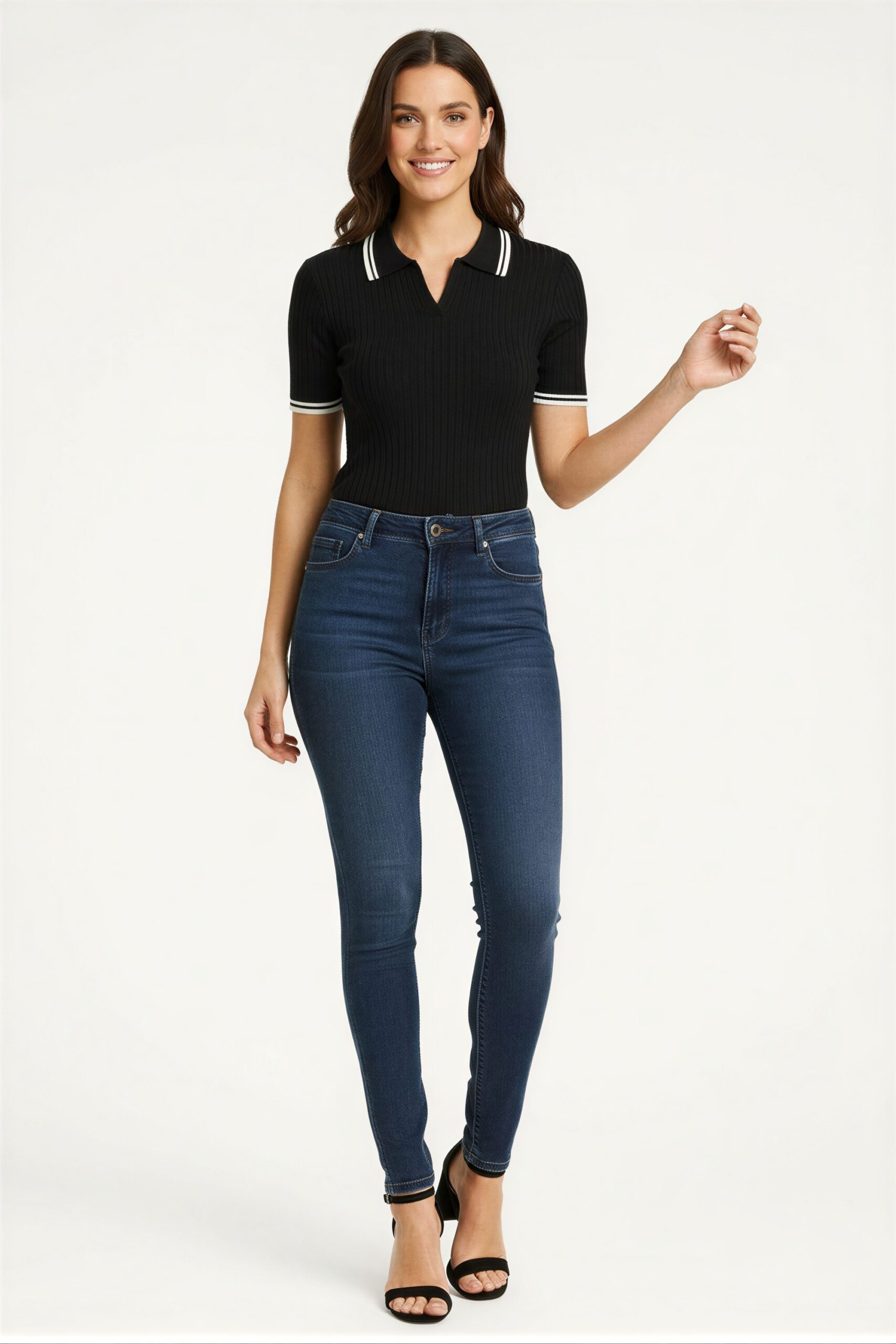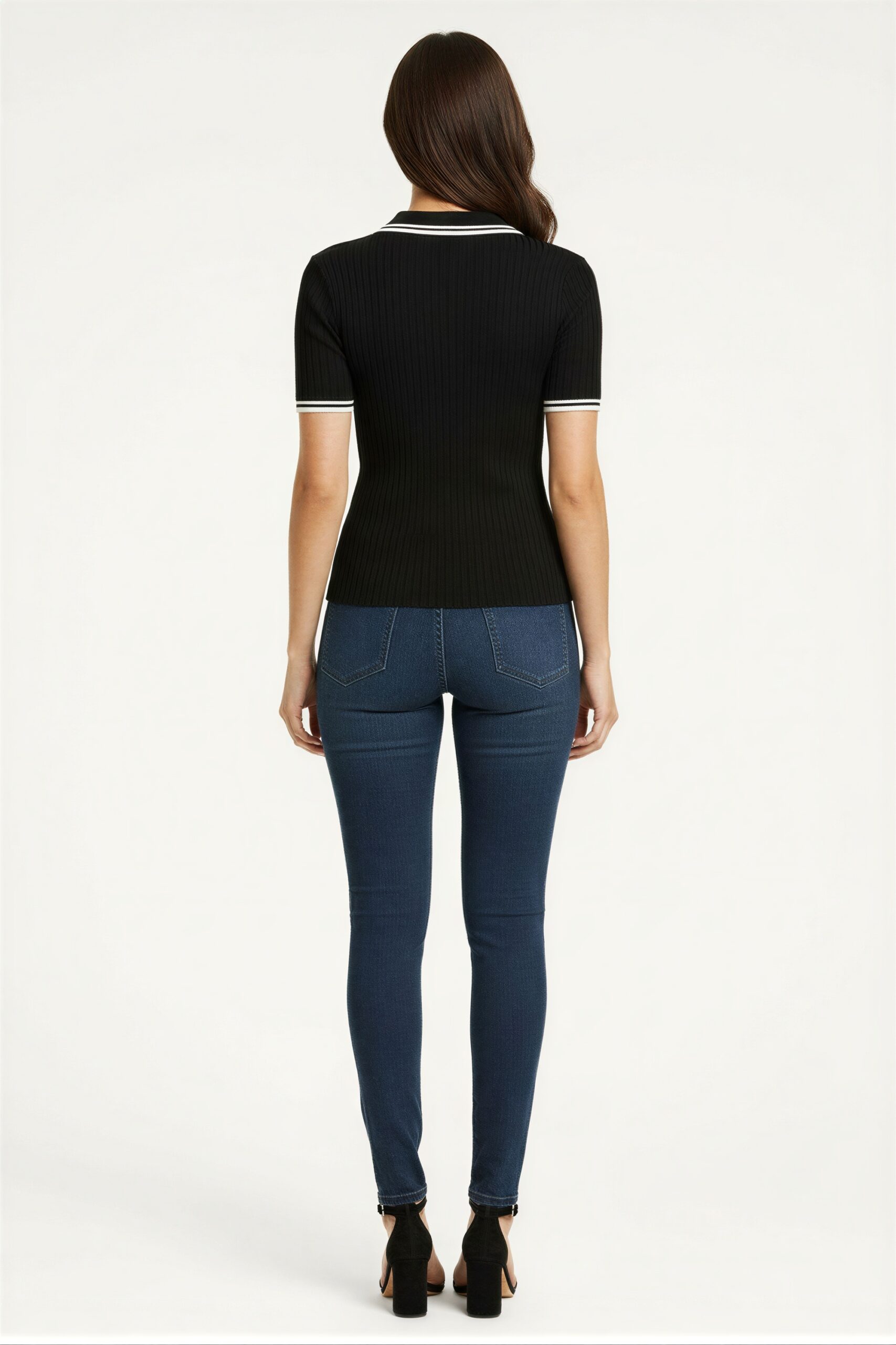 Suéter de manga corta con cuello tipo polo, tejido acanalado, ajuste al cuerpo, terminado recto, diseño ligero