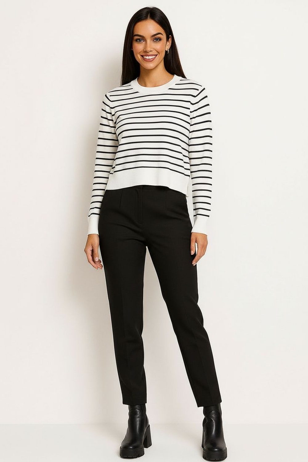 Suéter corto de manga larga con cuello redondo clásico, corte recto que brinda confort térmico, largo arriba de la cintura que aporta practicidad, confección en tejido de punto suave y flexible, terminados firmes que conservan la forma