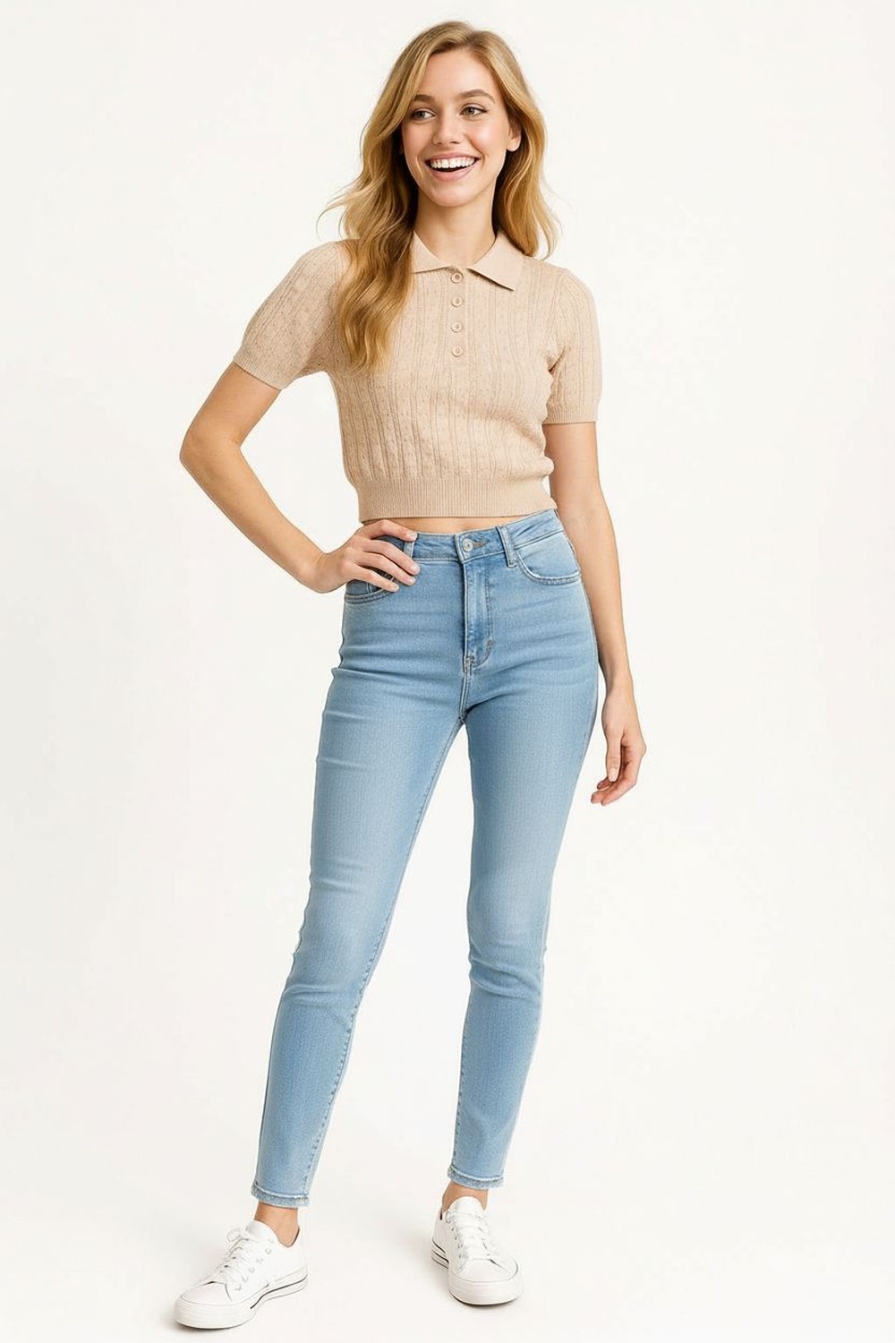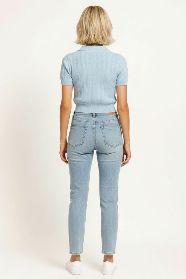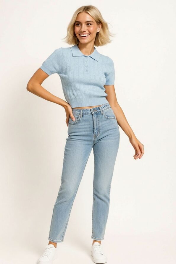 Suéter tejido de ajuste favorecedor con textura acanalada que aporta estilo y comodidad, cuello tipo polo con botonadura parcial que ofrece un acabado moderno y versátil, manga corta que brinda frescura y libertad de movimiento, dobladillo recto que mantiene la forma de la prenda en cada uso, confección en tejido elástico que asegura durabilidad y confort prolongado