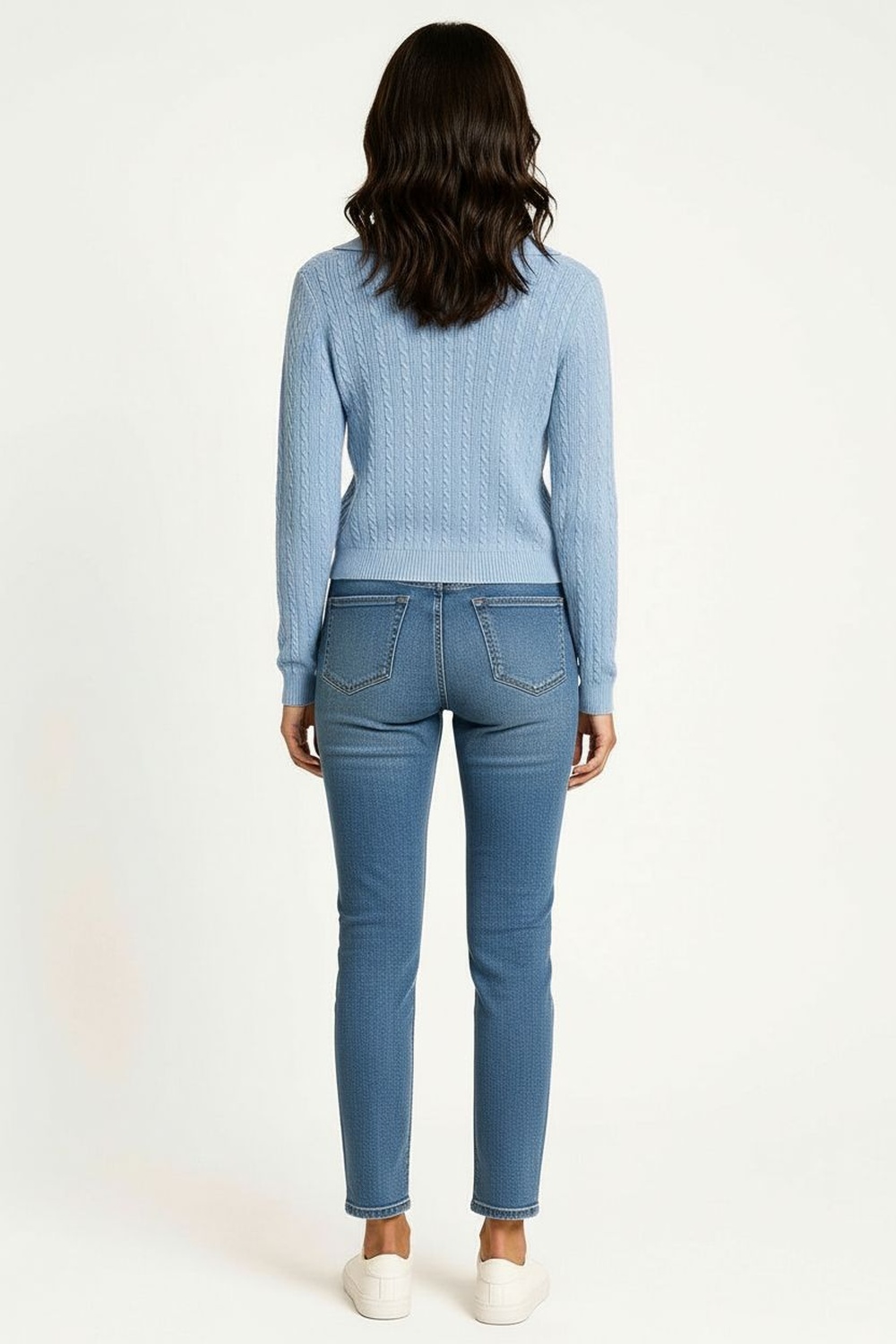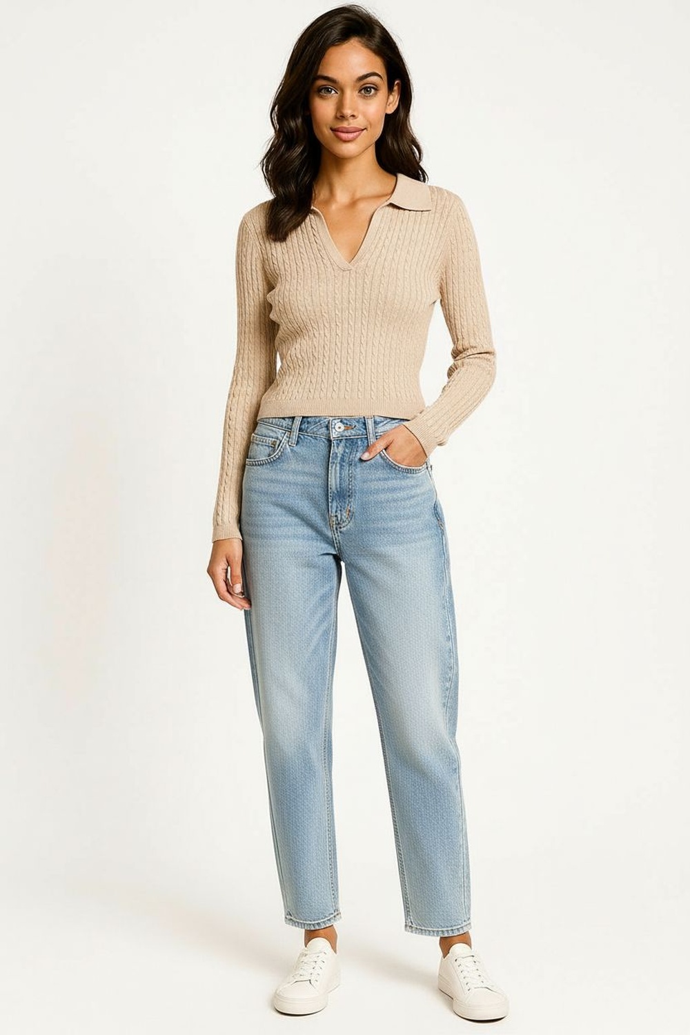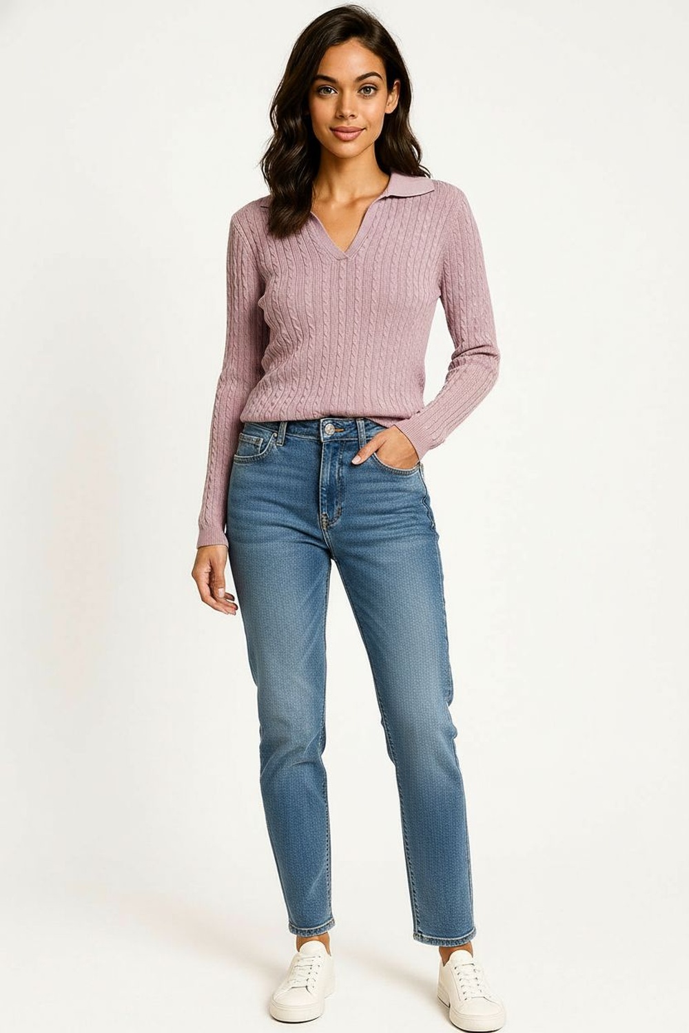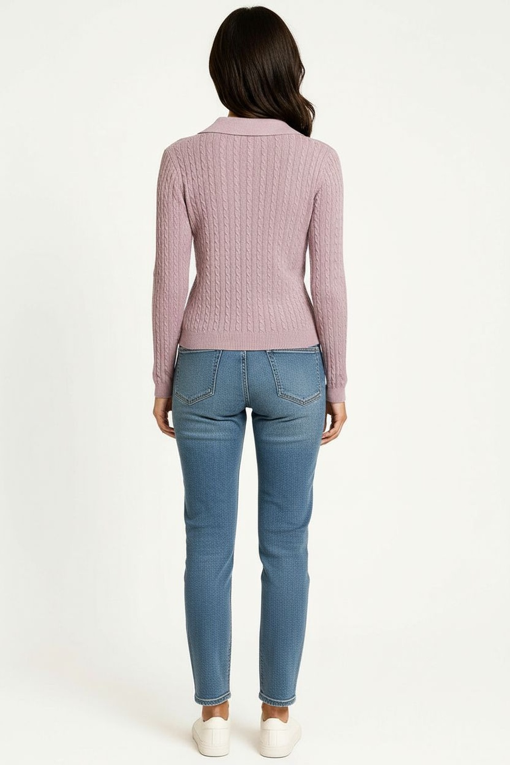 Suéter de punto fino con diseño de grecas tejidas, cuello tipo polo con escote en V que estiliza el cuello, manga larga ajustada y dobladillo a la cadera, tejido elástico que aporta comodidad y libertad de movimiento