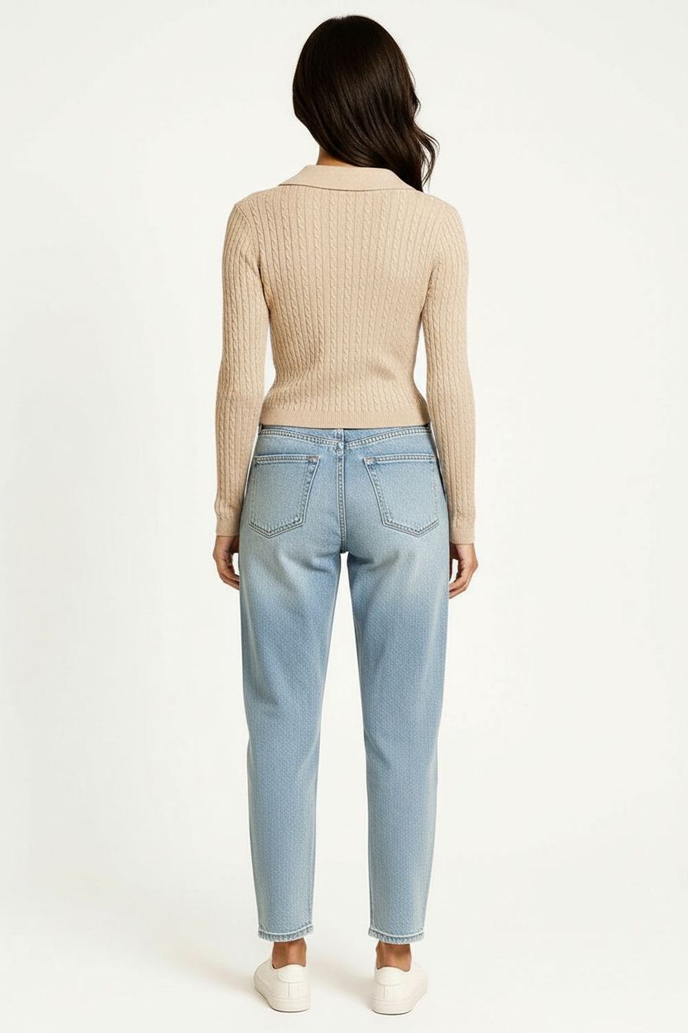 Suéter tejido con diseño de trenzas que aporta textura y estilo clásico, cuello alto que brinda abrigo y un toque sofisticado, manga larga con ajuste cómodo que favorece la movilidad, confección en punto elástico que se adapta suavemente al cuerpo ofreciendo confort y elegancia