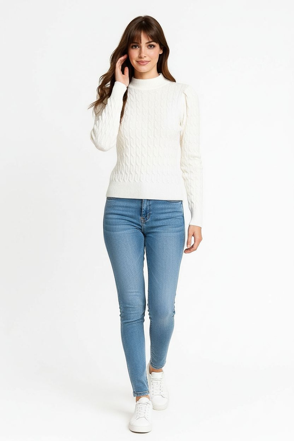 Suéter de manga larga con tejido de grecas trenzadas que aporta textura y estilo, cuello semi alto acanalado que brinda estructura, pretina y puños ajustados que definen la silueta, confección en punto elástico de tacto suave que ofrece comodidad, ajuste favorecedor y apariencia moderna para el día a día