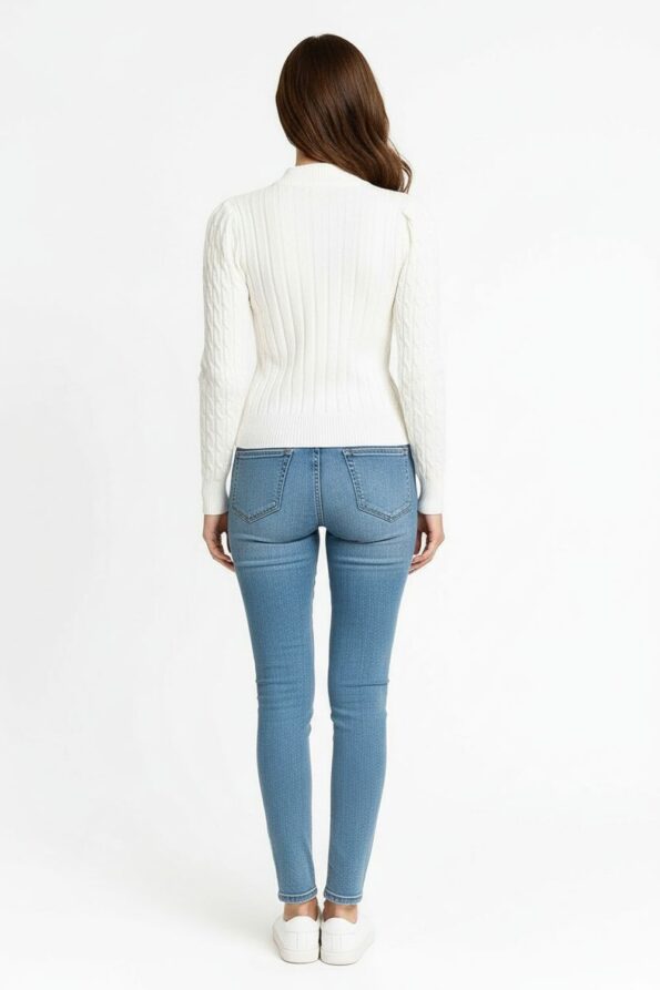 Suéter de tejido rib con textura acanalada que aporta elasticidad y confort, cuello alto que brinda calidez y estilo sofisticado, manga larga con ajuste ceñido que favorece la silueta, confección suave y ligera que ofrece comodidad y un acabado moderno ideal para la temporada