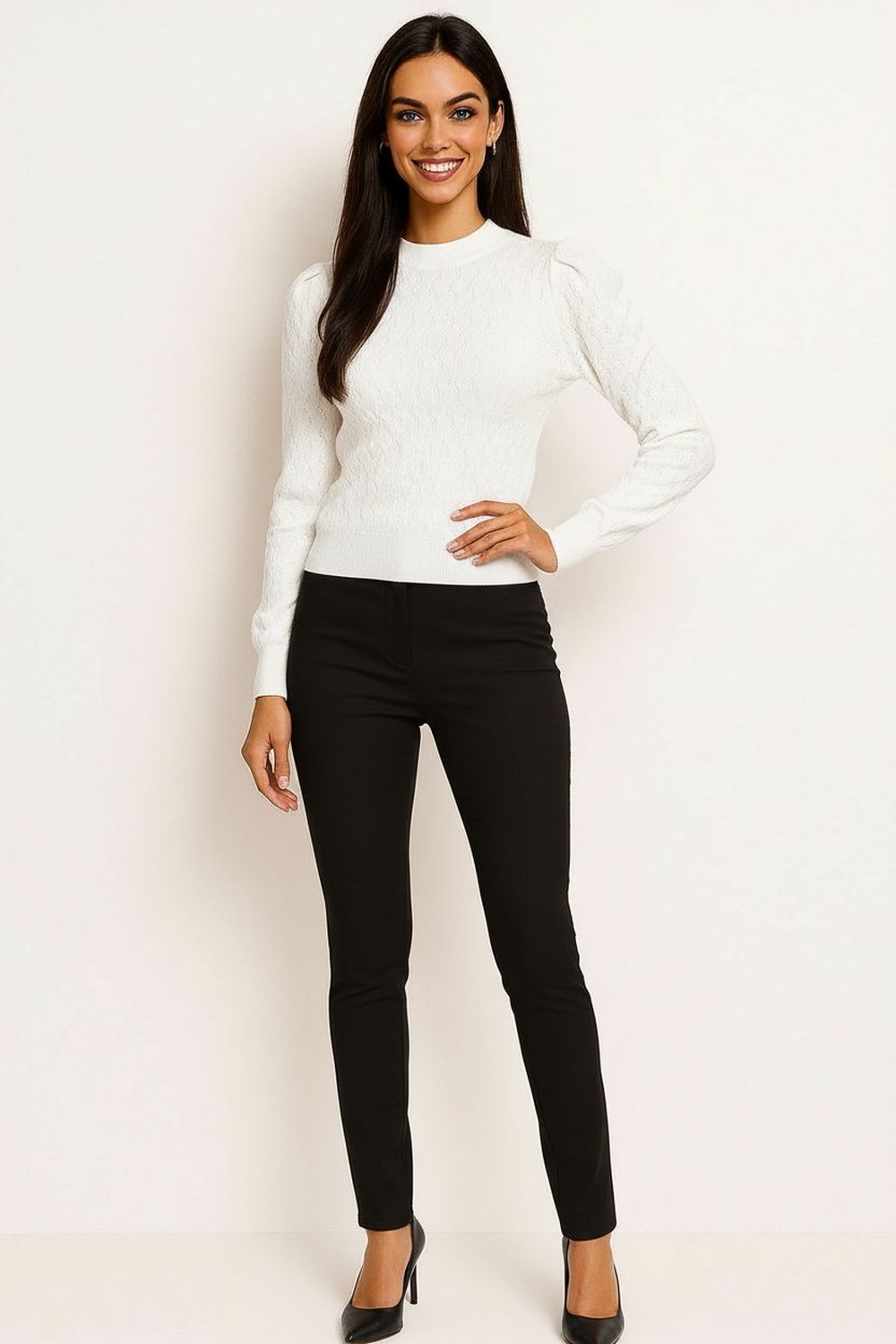 Suéter de manga larga con diseño calado que aporta textura y ligereza, aplicación de pequeñas tachuelas decorativas que añaden brillo sutil, cuello redondo con acabado limpio, hombros ligeramente fruncidos que aportan volumen, confeccionado en tejido suave y elástico que brinda confort y estilo moderno