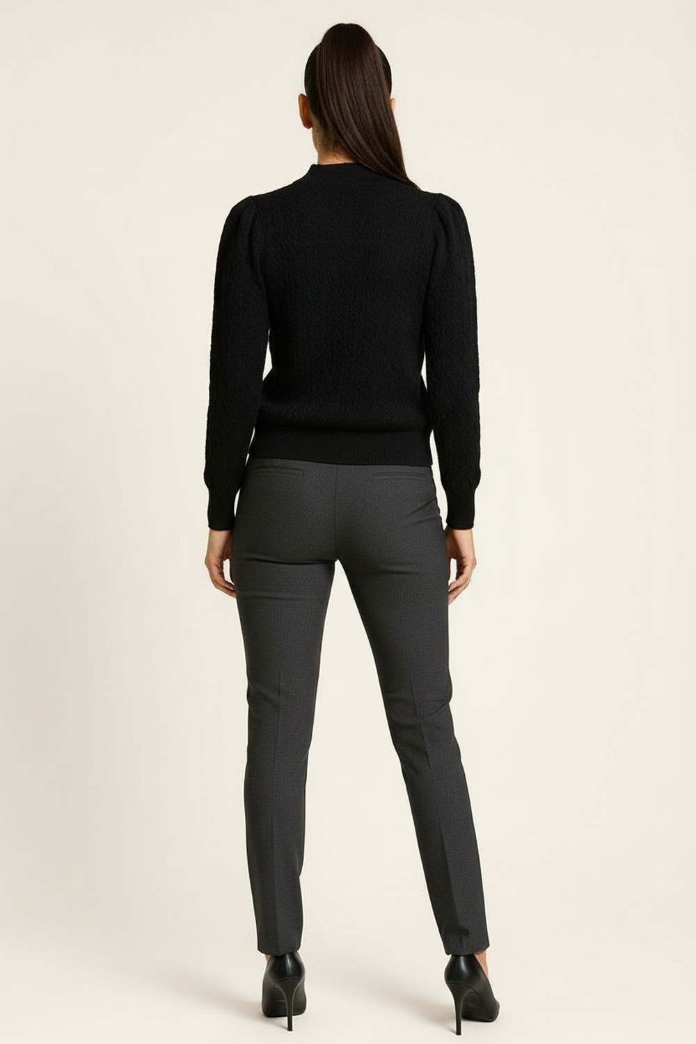 Suéter tejido con cuello alto que brinda cobertura adicional y confort térmico, diseño de líneas caladas que aportan textura y detalle visual, hombros ligeramente marcados que realzan la forma, puños y basta ajustados que mantienen la estructura de la prenda y garantizan un buen ajuste