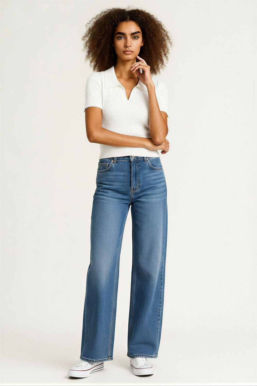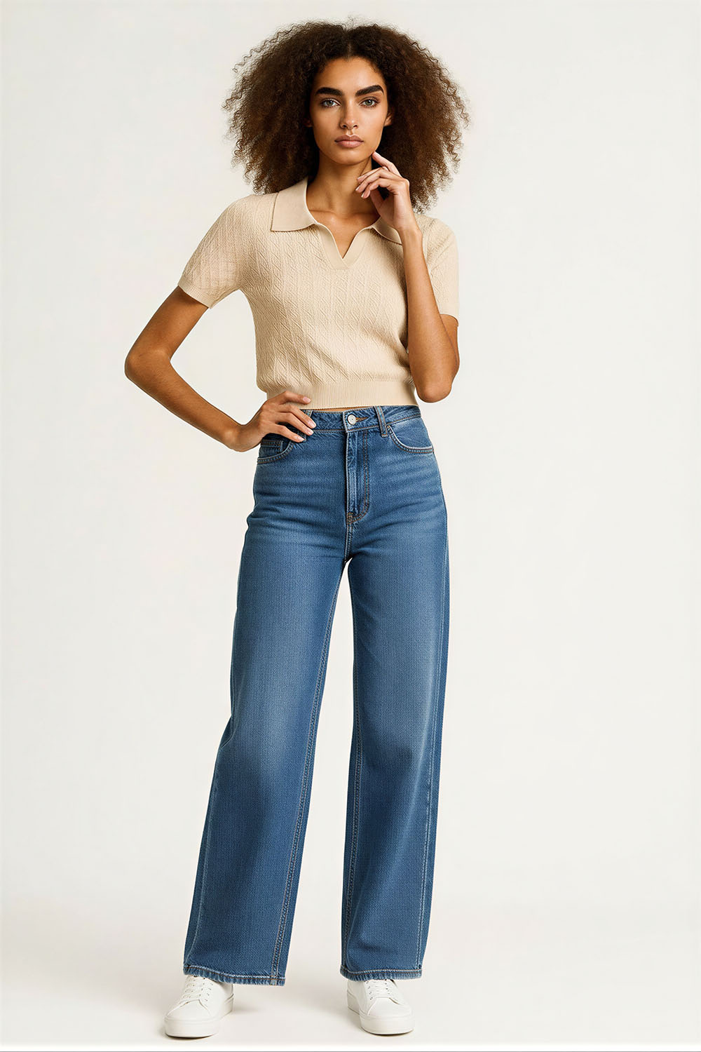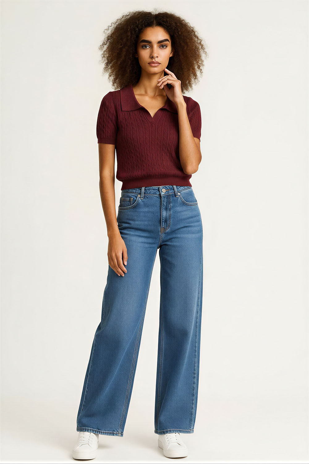 Suéter de tejido ligero con cuello camisero que aporta estructura, manga corta con terminación ajustada que brinda mejor caída, diseño con textura discreta que eleva el acabado, corte a la cintura que estiliza la figura y permite un ajuste cómodo