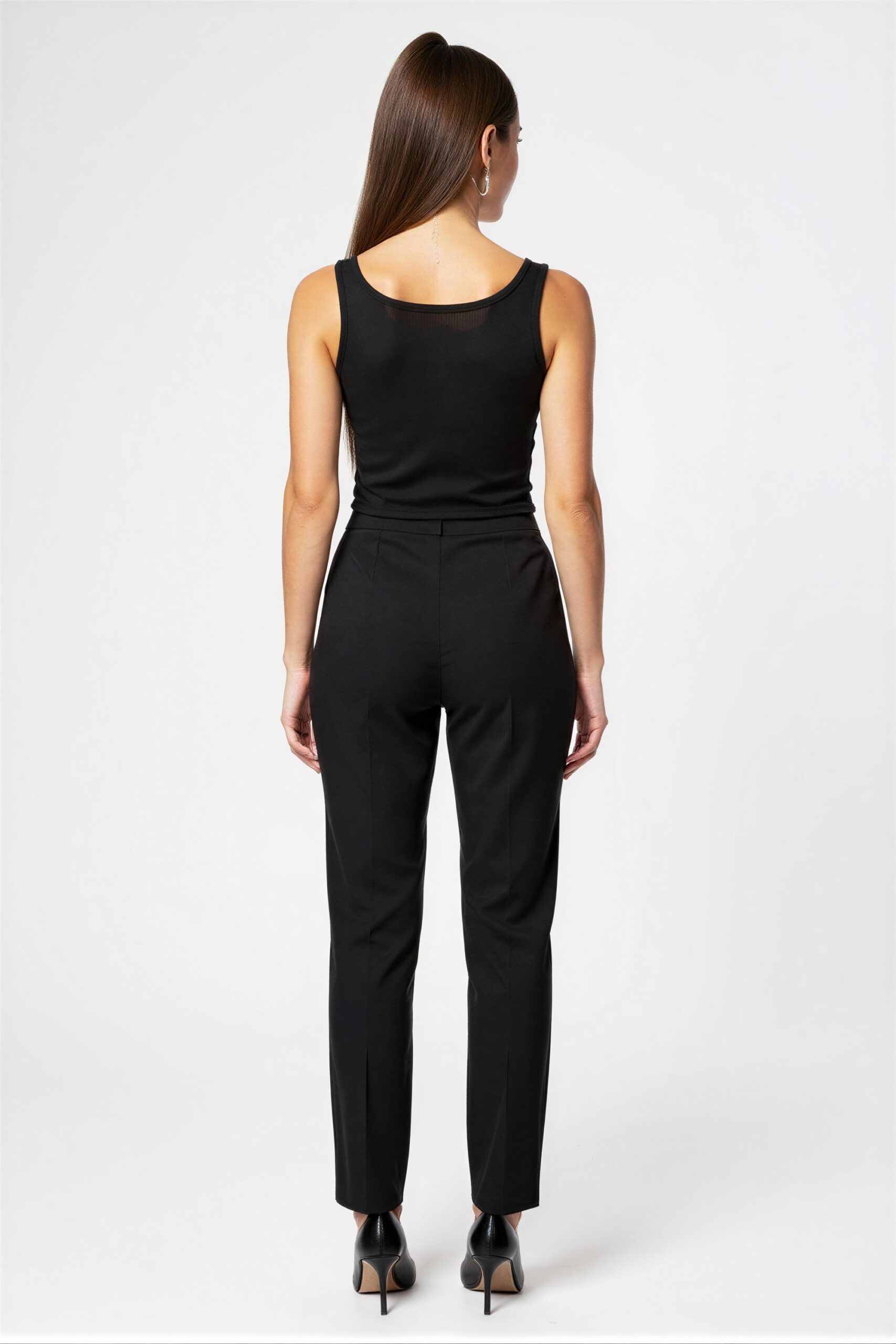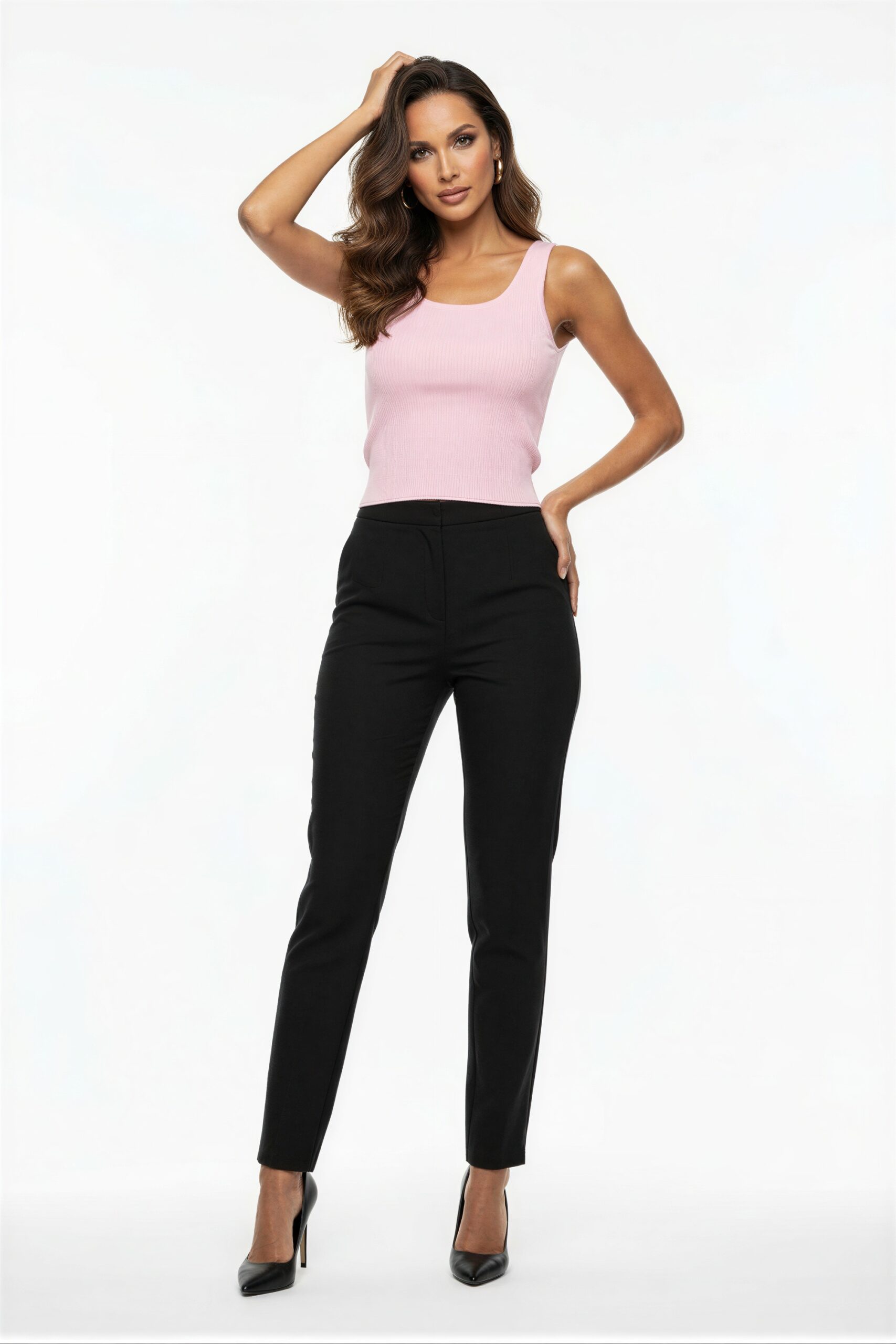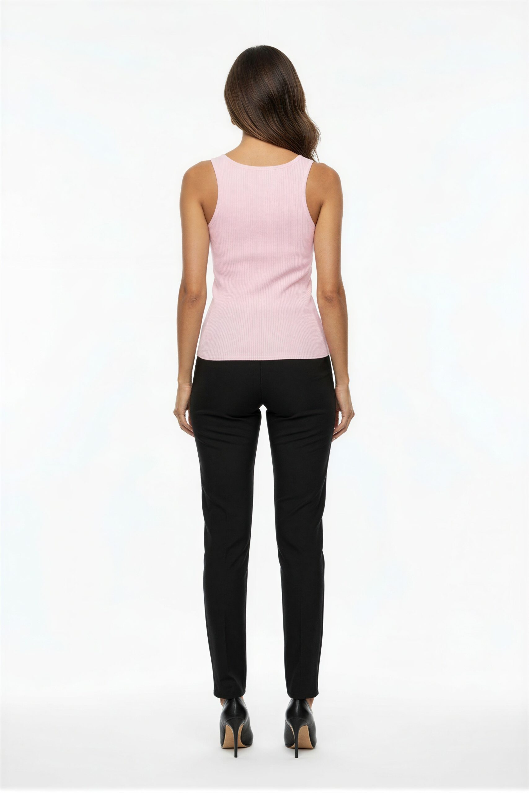 Suéter tejido sin mangas con cuello redondo, textura acanalada y ajuste al cuerpo, terminado limpio en bordes y estructura flexible