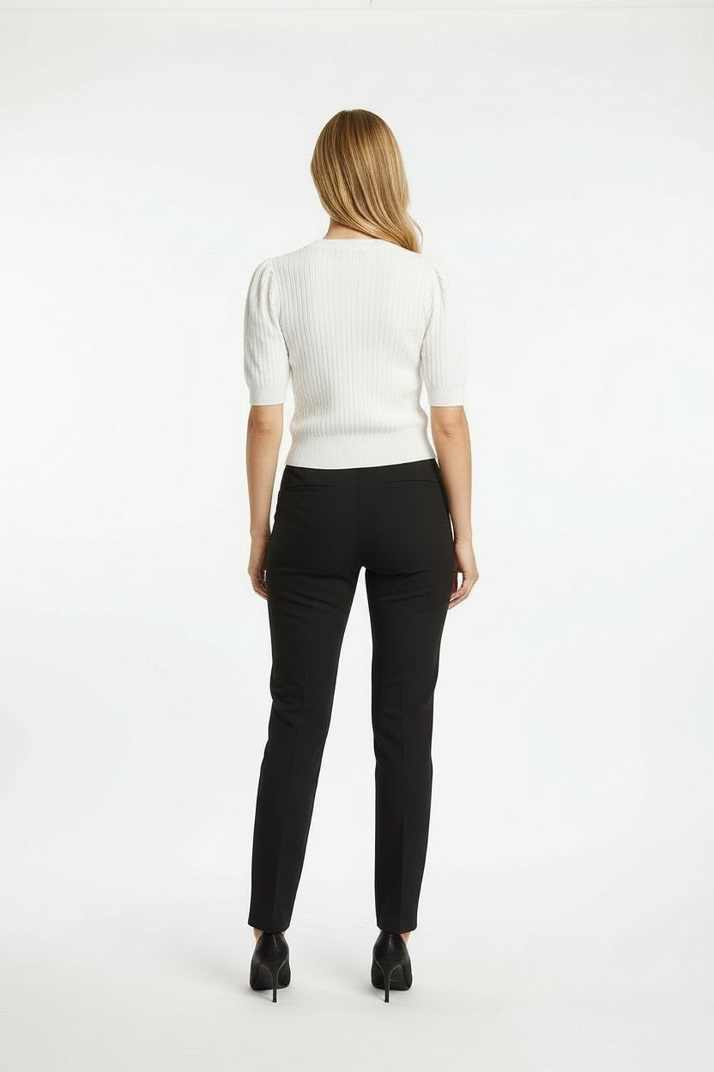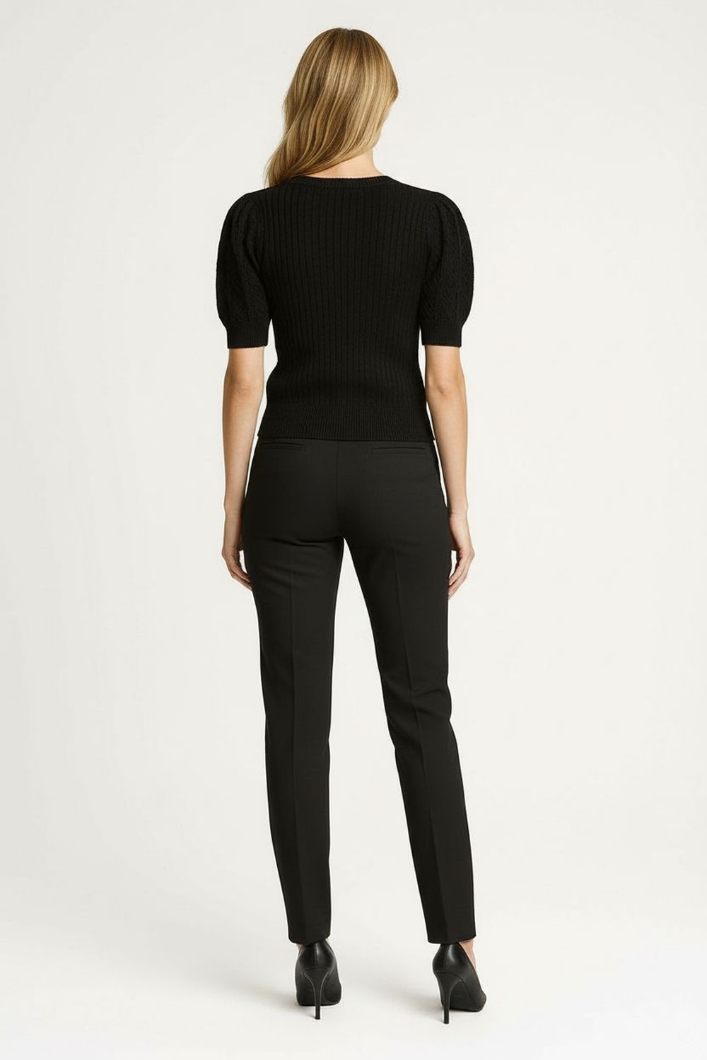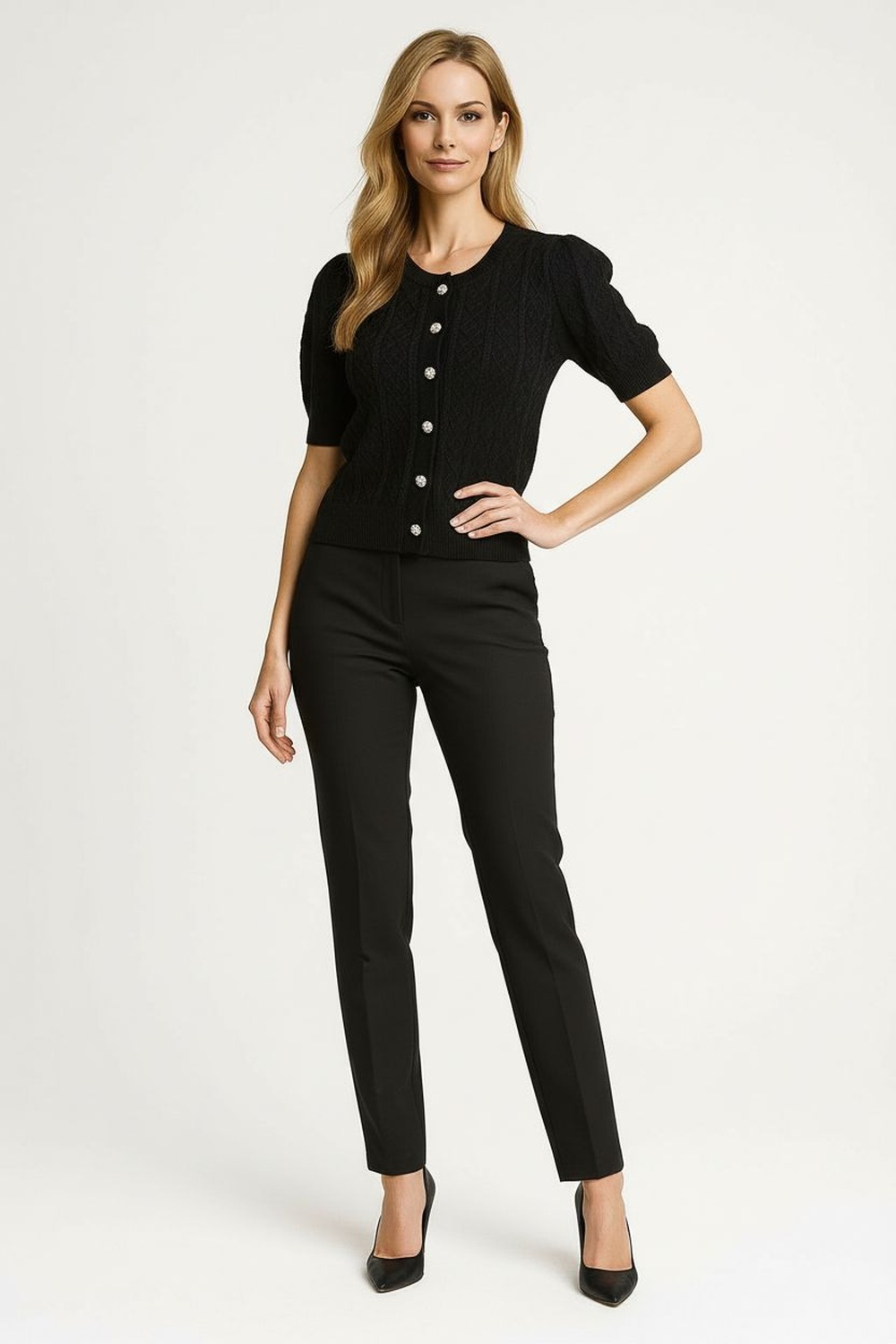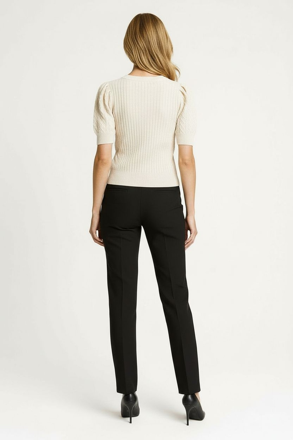 Suéter de punto con diseño trenzado al frente y escote en V profundo con botones funcionales, manga corta ajustada que define hombros, confección en tejido elástico que se adapta al cuerpo, terminados acanalados en bajo y mangas que mejoran la estructura y largo a la cadera que aporta equilibrio visual