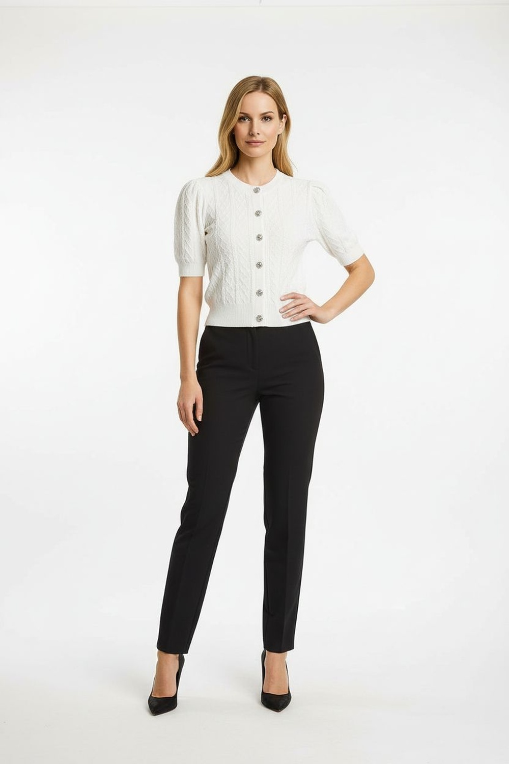 Suéter tejido con manga corta y botones frontales, textura definida y acabado estructurado, ajuste cómodo que brinda suavidad al contacto con la piel