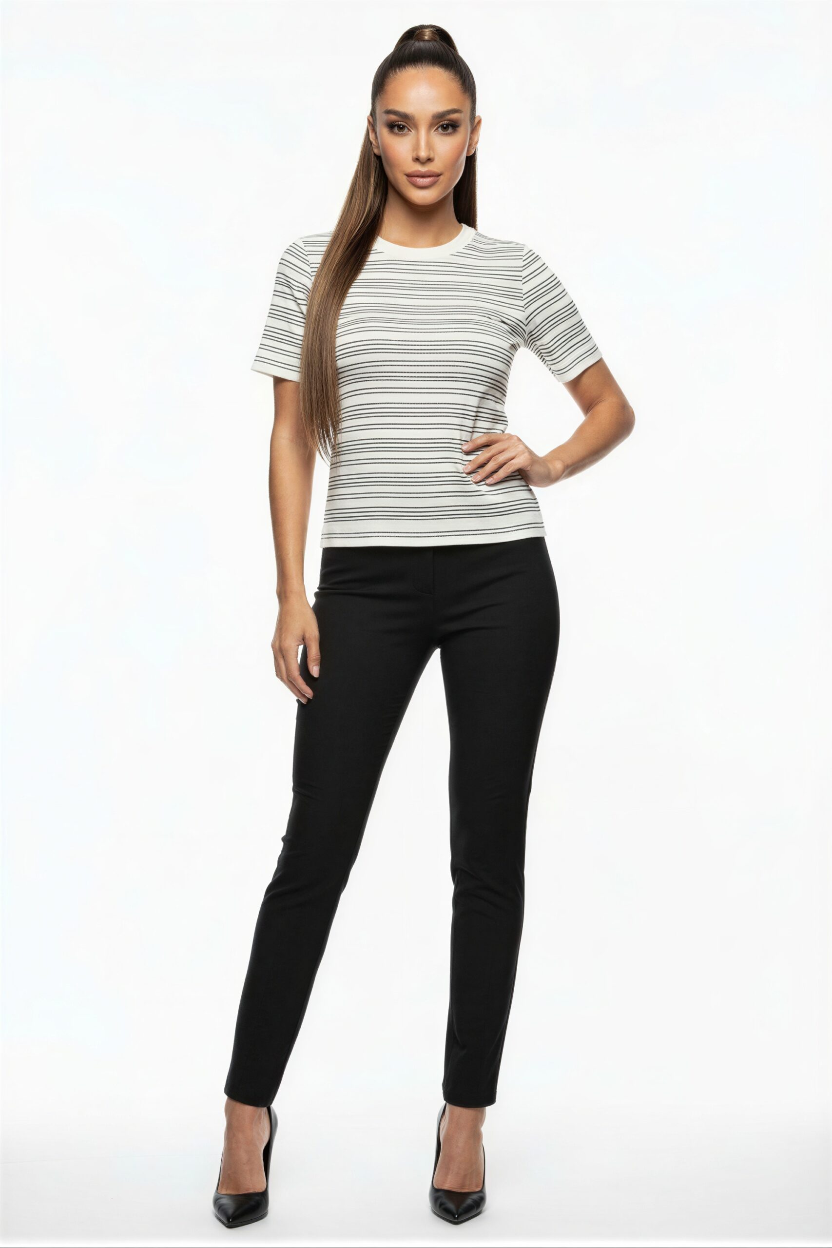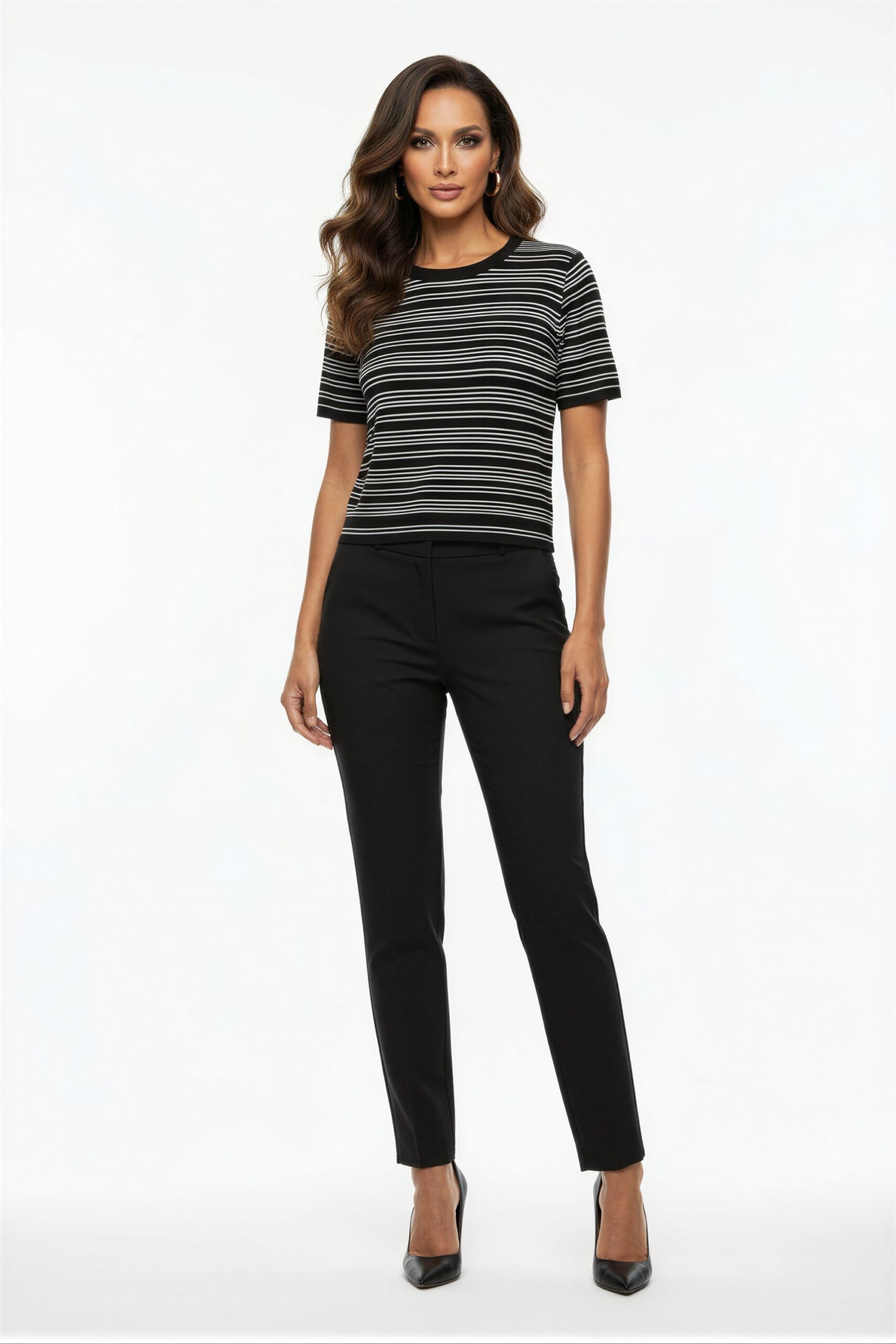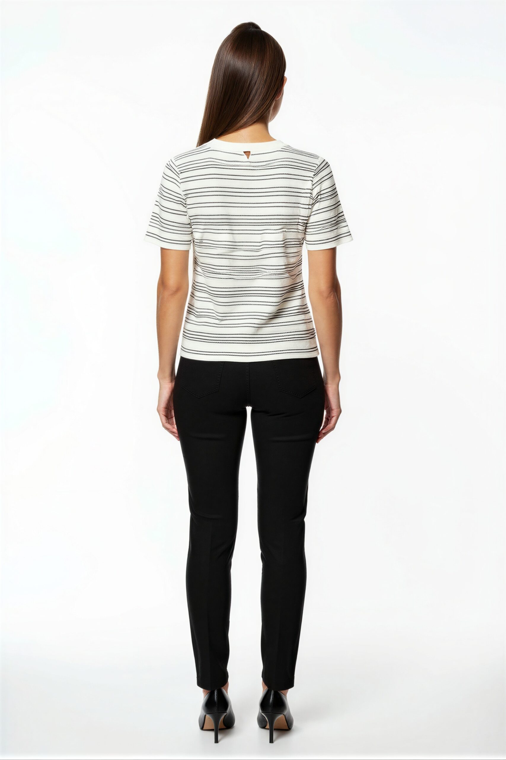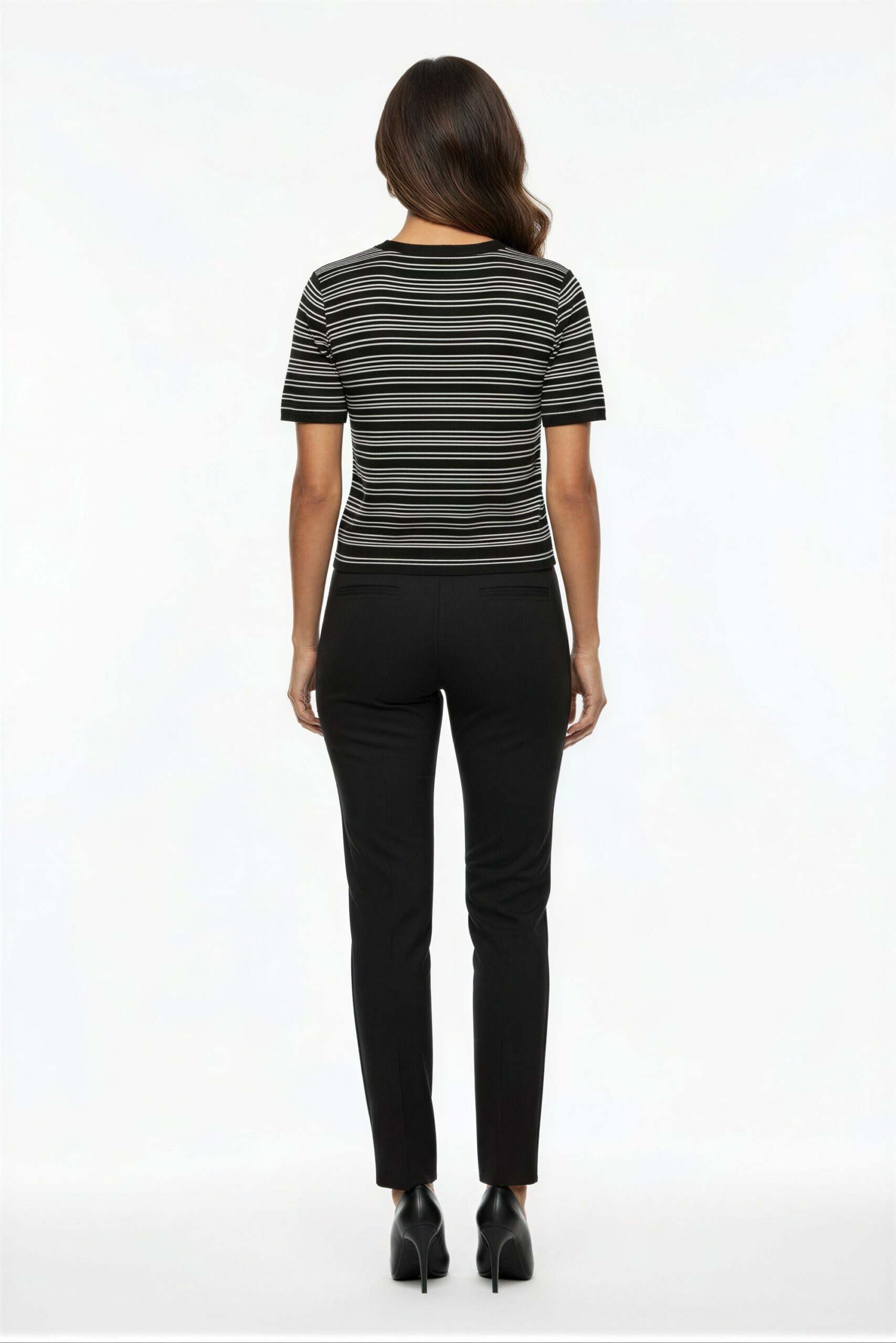 Suéter tejido de manga corta con cuello redondo, textura ligera y ajuste cómodo, terminado uniforme en bordes y estructura adaptable