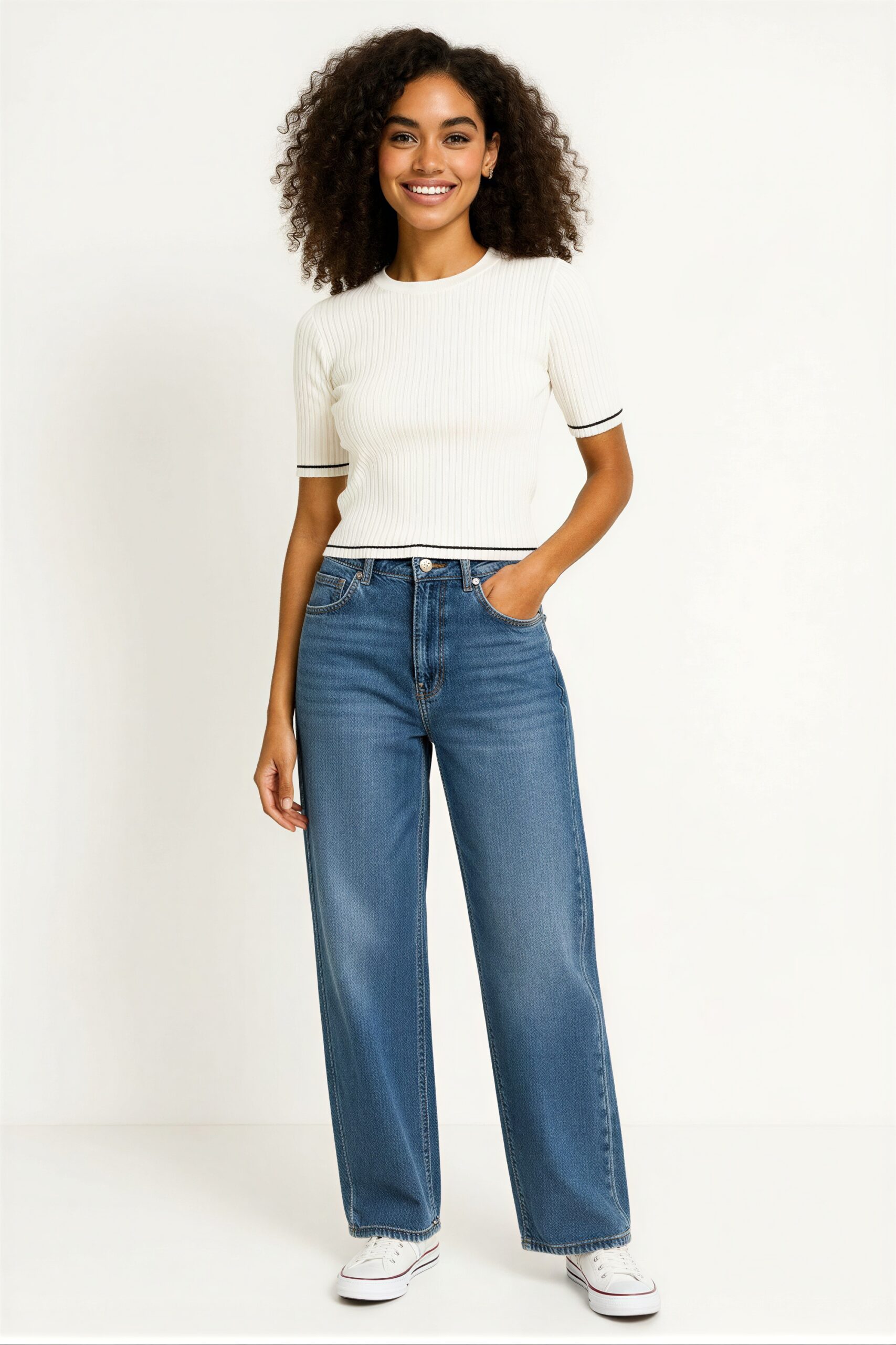 Suéter tejido de manga corta con cuello redondo, acabado acanalado en toda la prenda y terminaciones definidas en mangas y bajo, ajuste cómodo al cuerpo y tacto suave