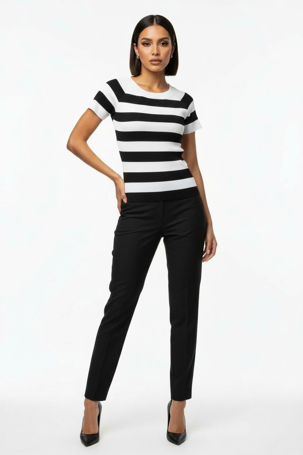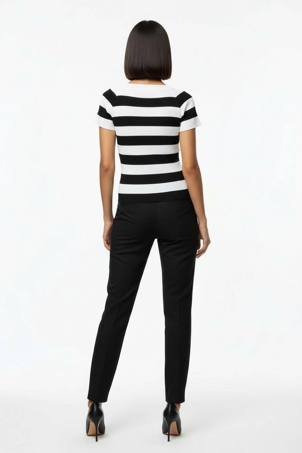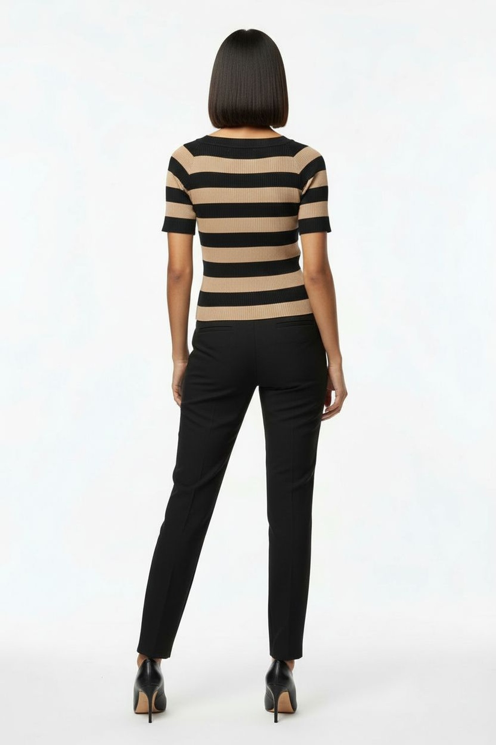 Suéter tejido de manga corta con cuello amplio, textura acanalada, tela flexible, ajuste cómodo, terminados definidos