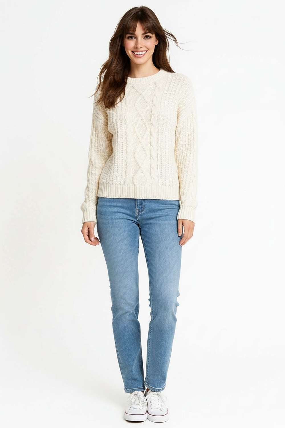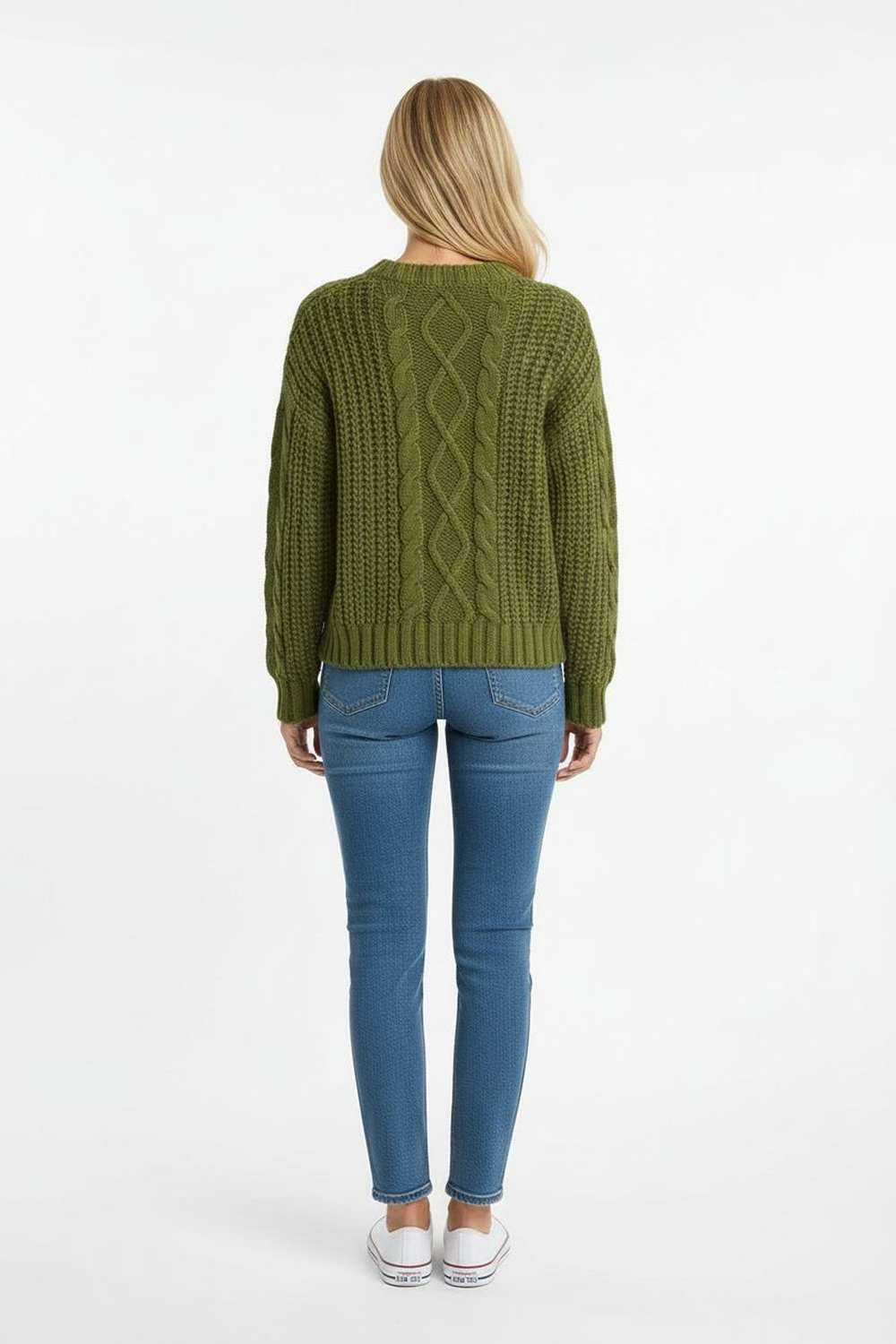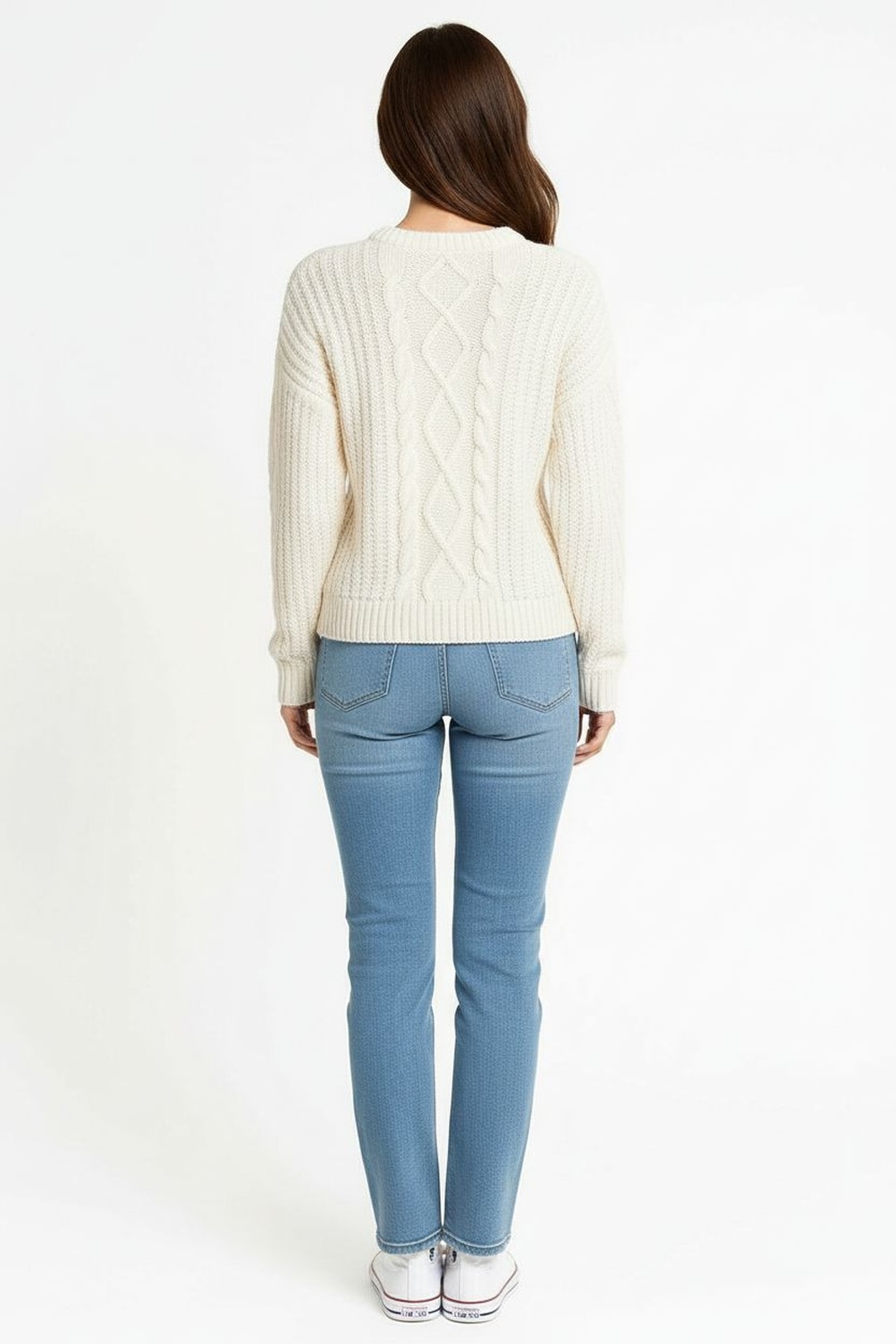 Suéter corto de punto con tejido calado y trenzado al frente que aporta textura y un toque delicado, cuello semi alto acanalado que ofrece estructura y estilo, puños y basta elásticos que aseguran un ajuste cómodo, confección en tejido suave y ligero ideal para las temporadas de clima fresco, diseño moderno que complementa looks casuales con encanto