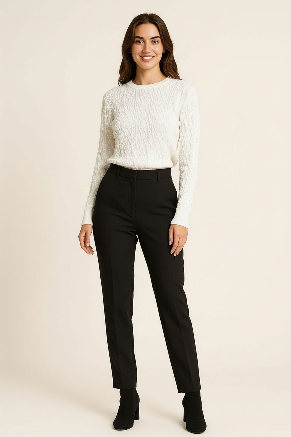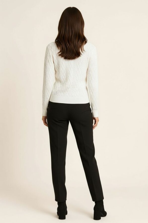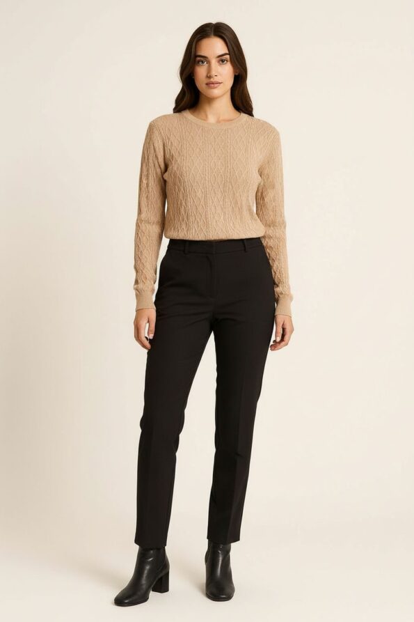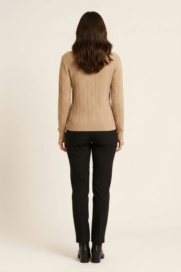 Sueter de manga larga con diseño tejido de rombos y trenzas que aporta textura y un acabado distintivo, cuello redondo con terminación reforzada que mantiene la forma tras cada uso, corte recto a la cadera que ofrece comodidad y ajuste favorecedor, confección en punto elástico que se adapta suavemente al cuerpo y brinda libertad de movimiento, tejido cálido y ligero que asegura confort en todo momento