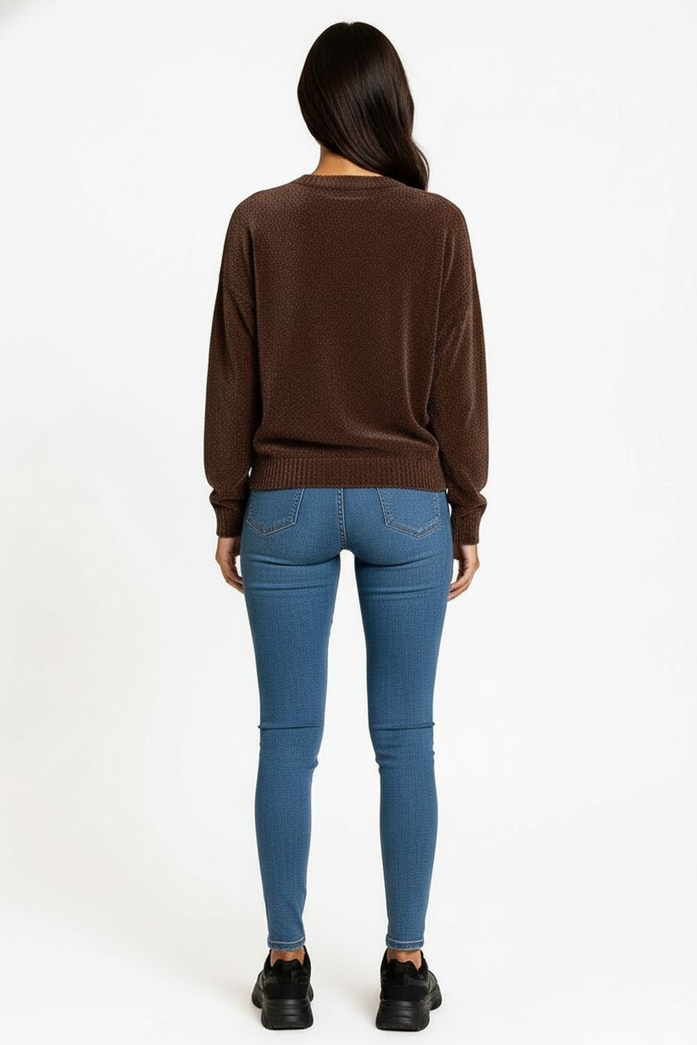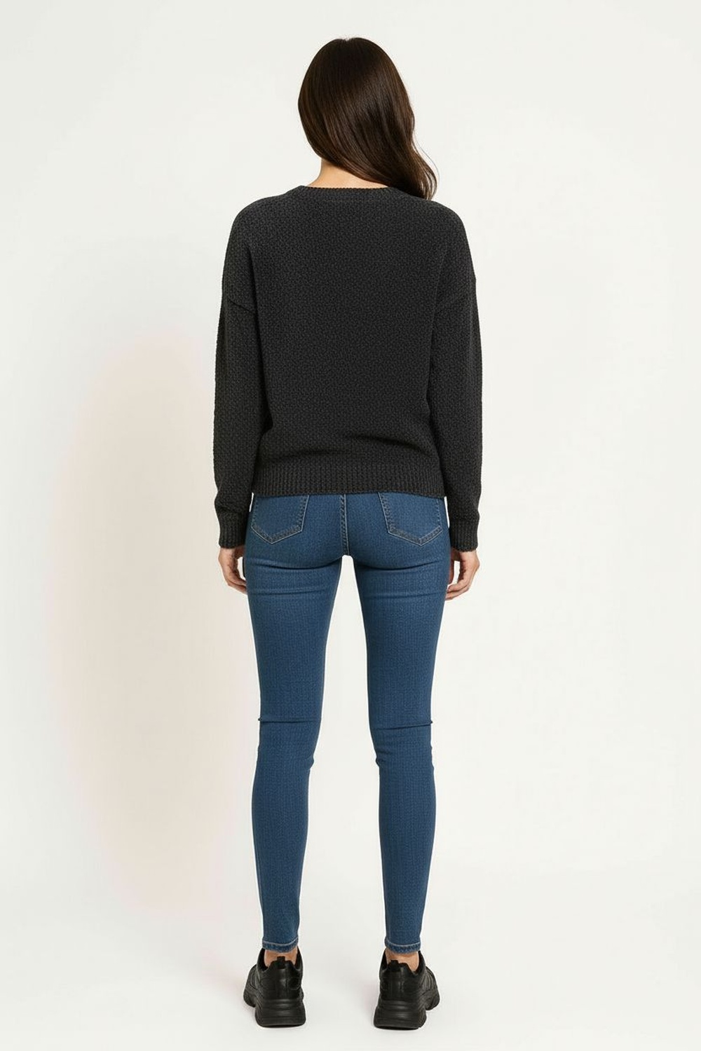 Suéter de cuello redondo con textura tipo canasta que añade relieve al diseño, manga larga con puño elástico que favorece el ajuste, basta con terminación ajustada que define la silueta, confección en tejido suave y resistente que mantiene su forma y tacto confortable