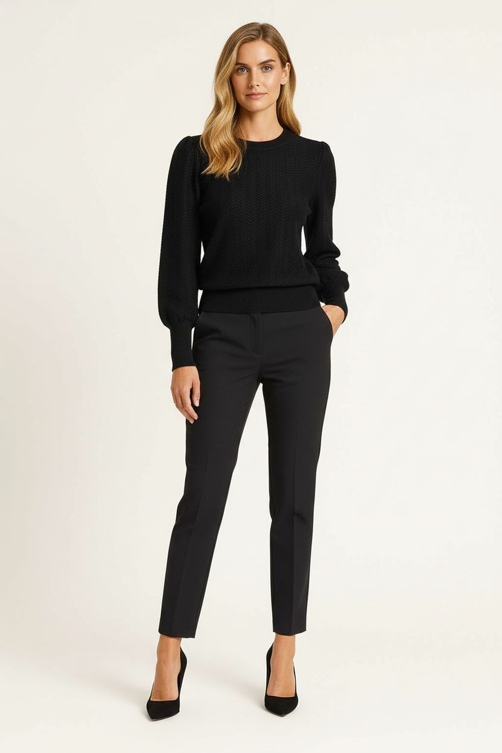 Suéter de manga larga con diseño tejido en ondas que aporta textura y estilo, cuello redondo con acabado acanalado que brinda un ajuste cómodo, confección en punto ligero que permite transpirabilidad sin perder calidez, corte clásico que se adapta a la figura con elegancia y confort
