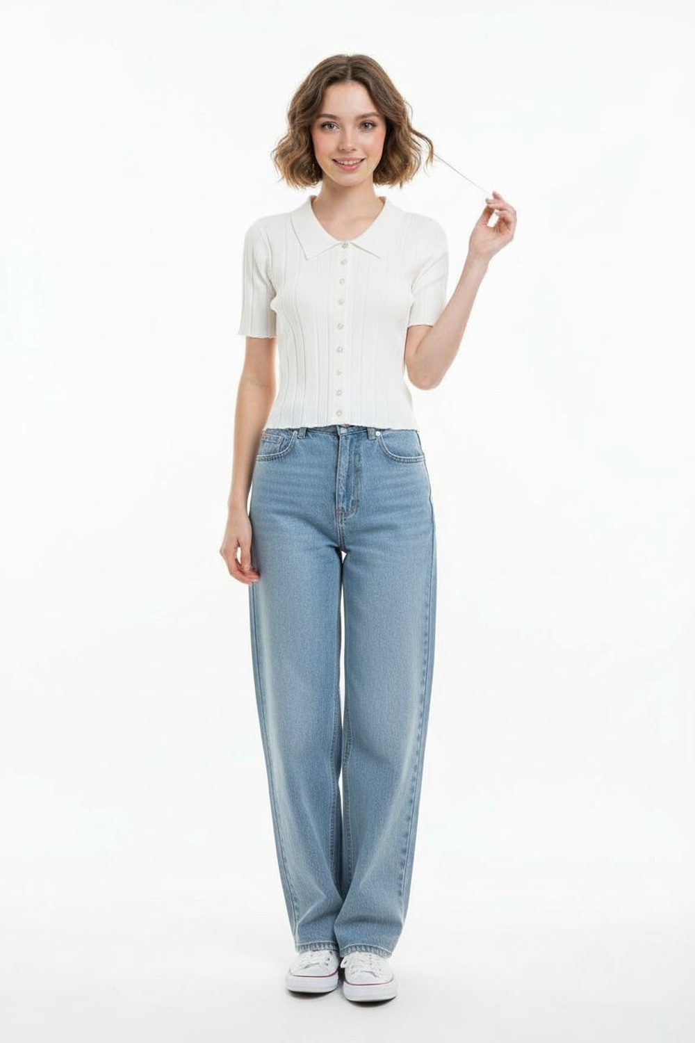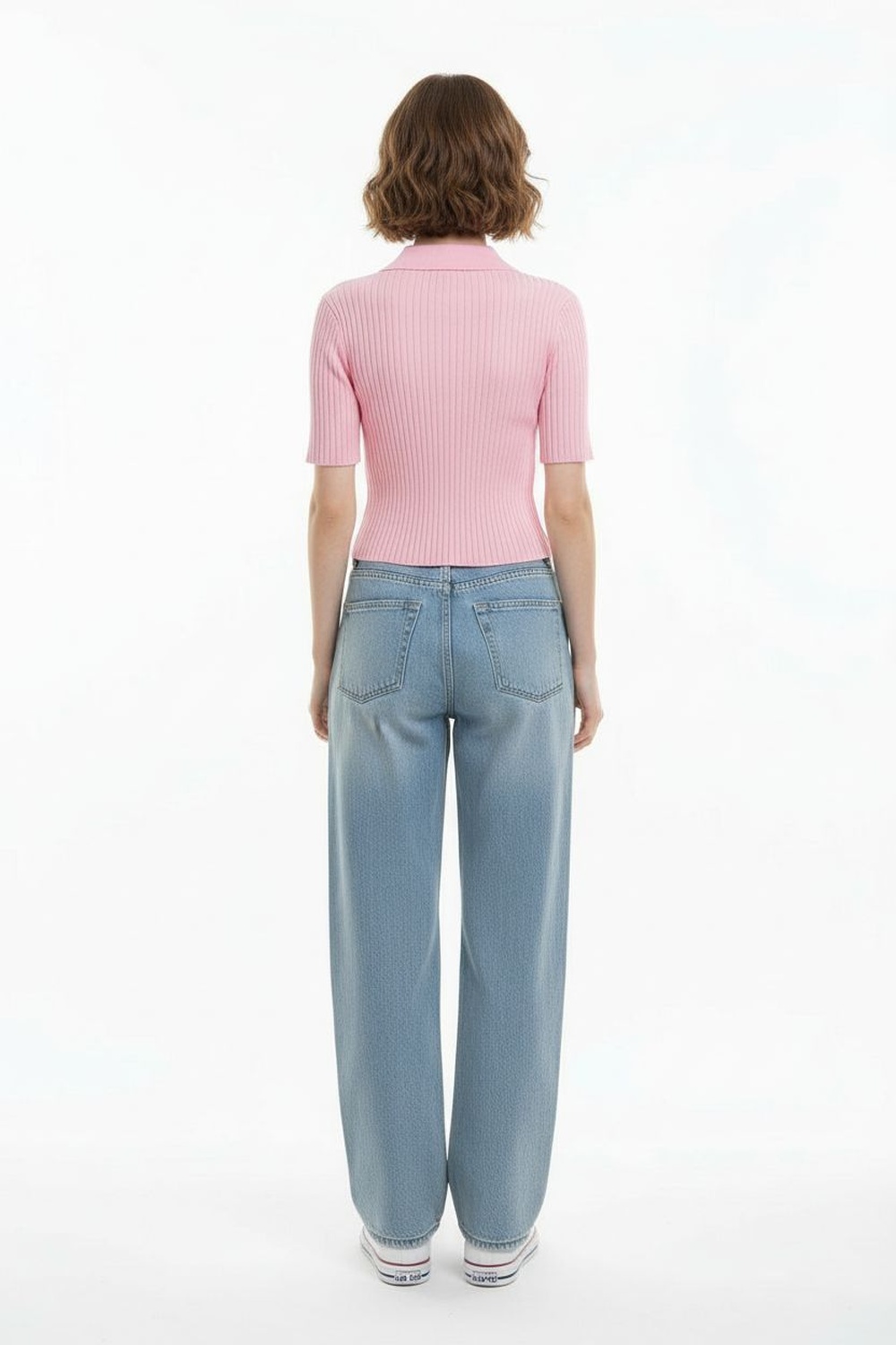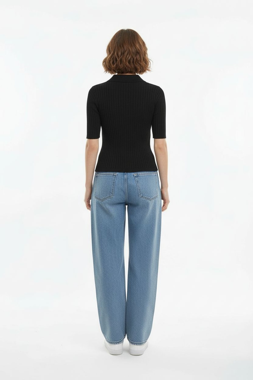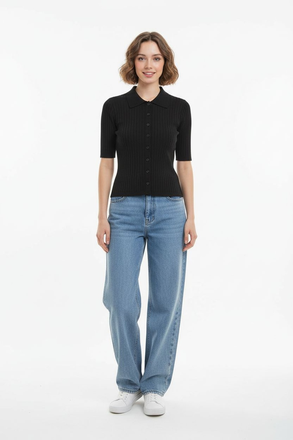 Suéter de manga corta con cuello tipo camisero, botonadura frontal, ajuste al cuerpo, textura acanalada, terminaciones limpias, confección en tejido ligero