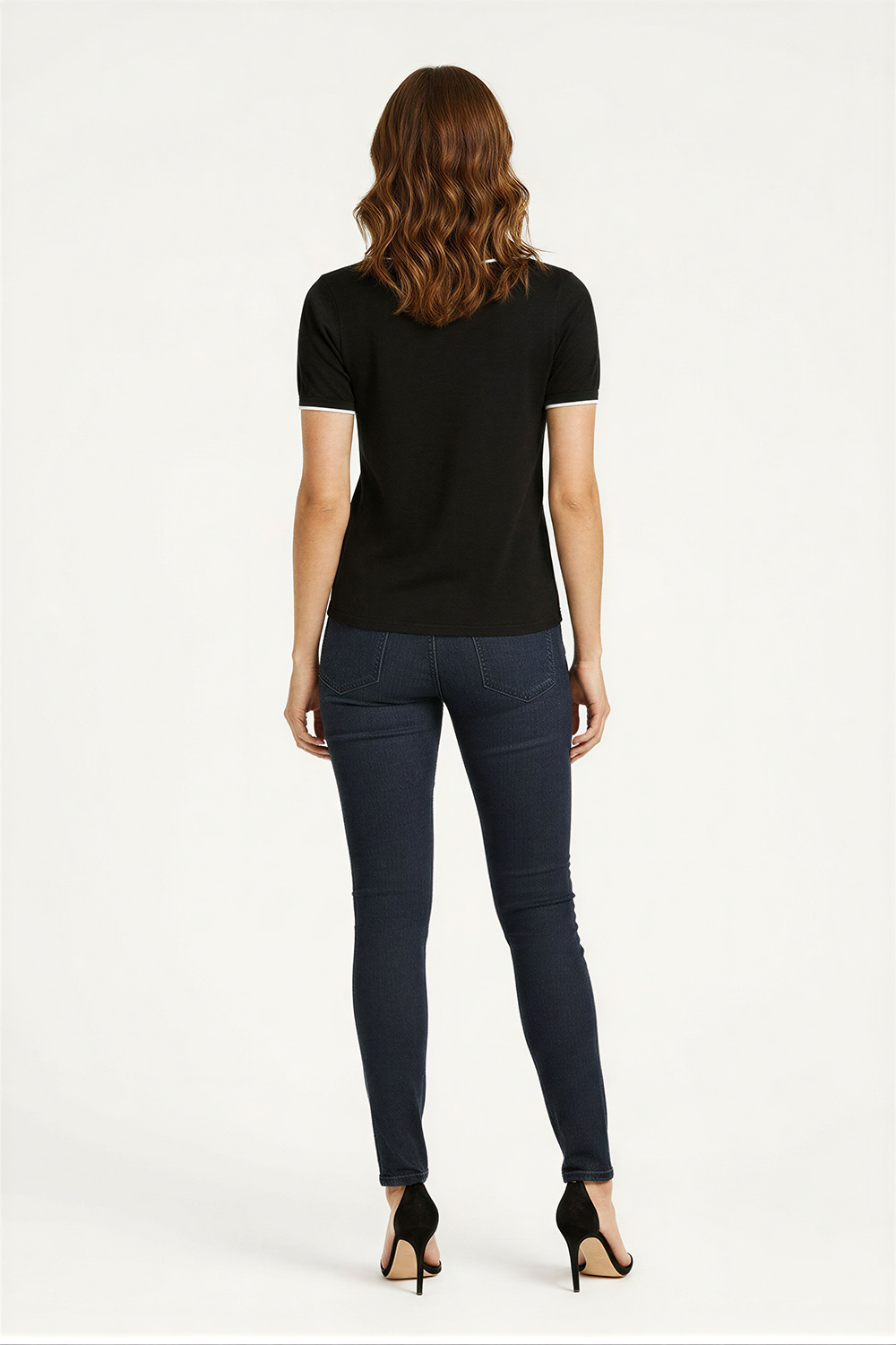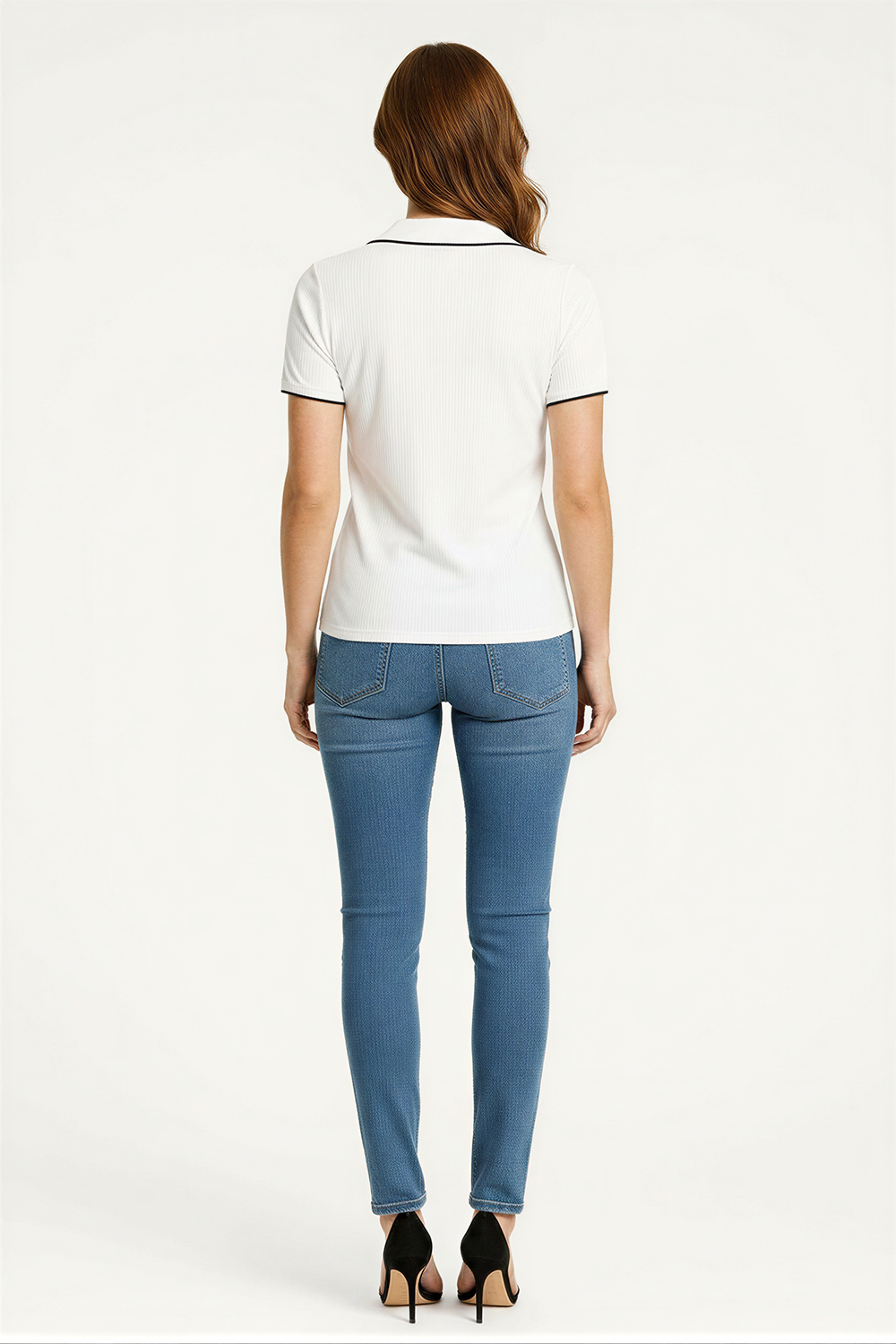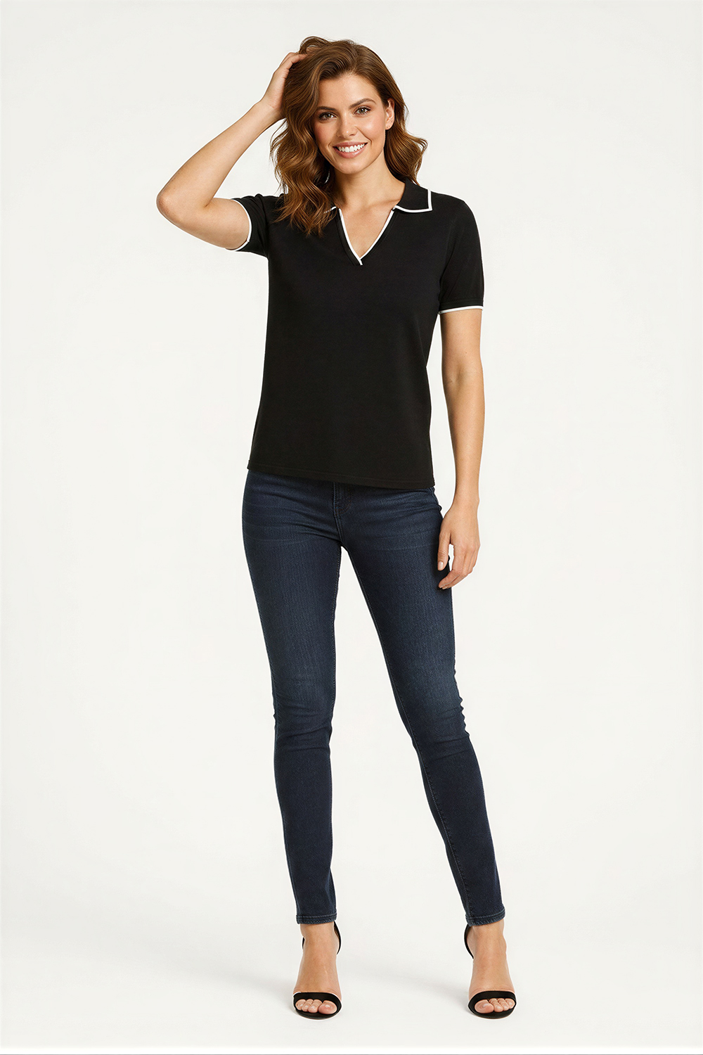 Suéter tipo polo tejido de manga corta con estructura entallada, cuello camisero con acabado definido y escote en V que estiliza el torso, detalles en contraste en cuello mangas y bajo que aportan definición visual, tejido ligero de punto fino con textura uniforme y caída suave al cuerpo