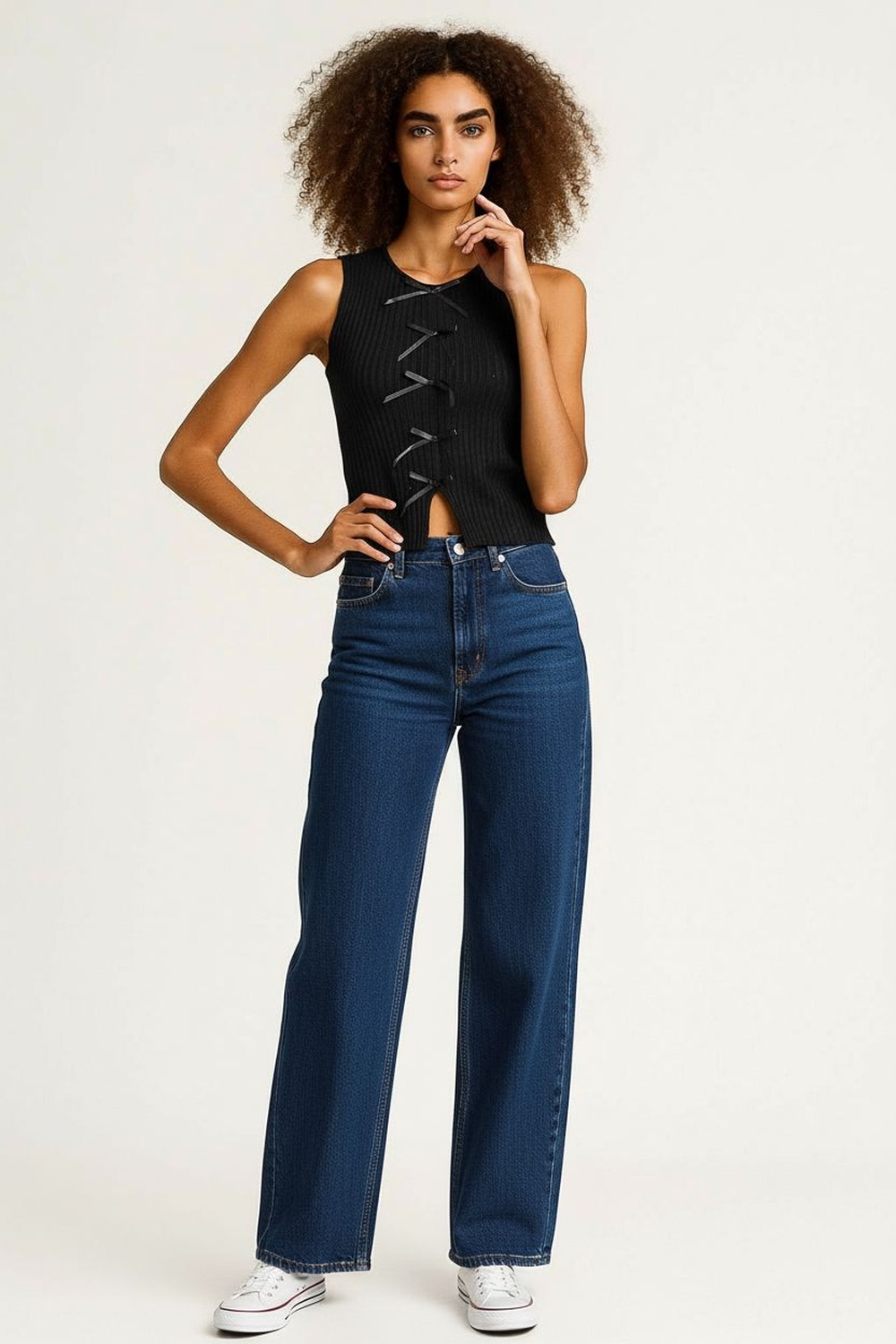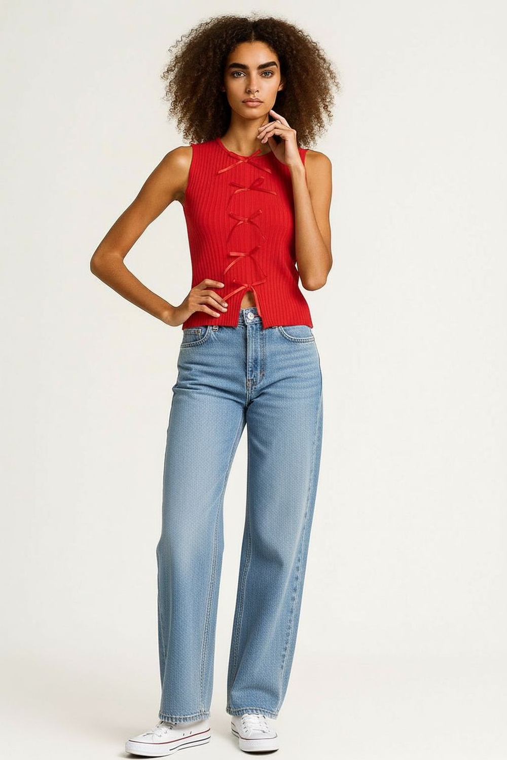 Top tejido, detalle de moños frontales, cuello cerrado, sin mangas, textura acanalada, abertura inferior, ajuste al cuerpo