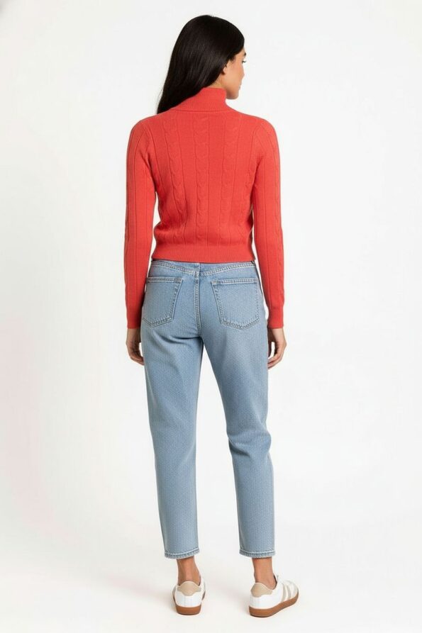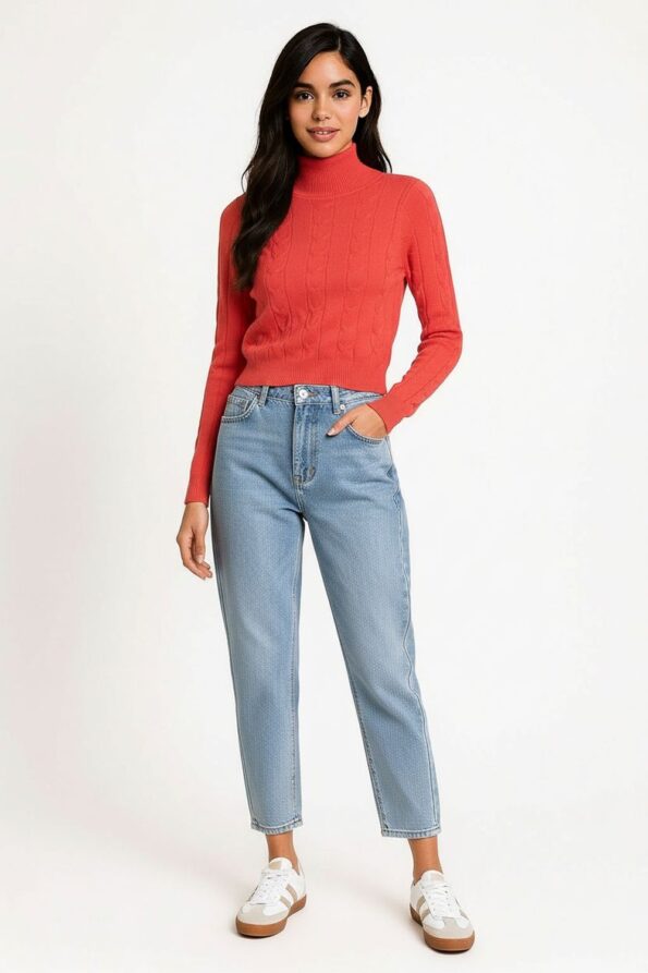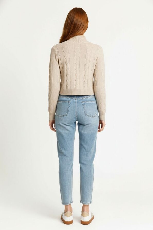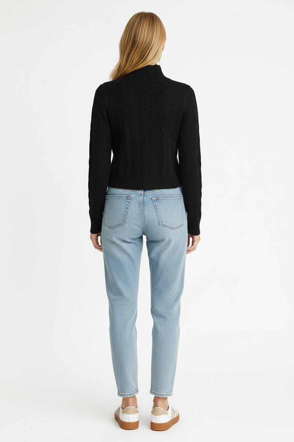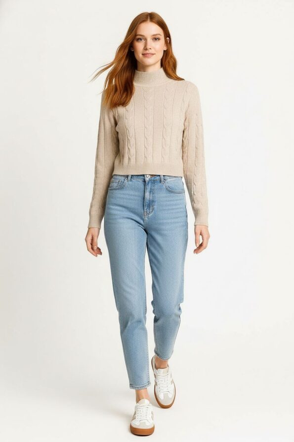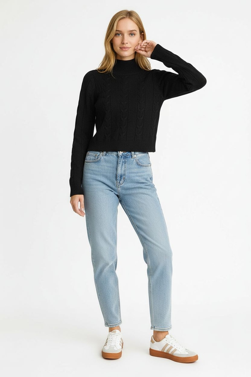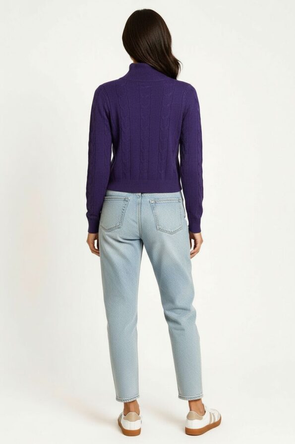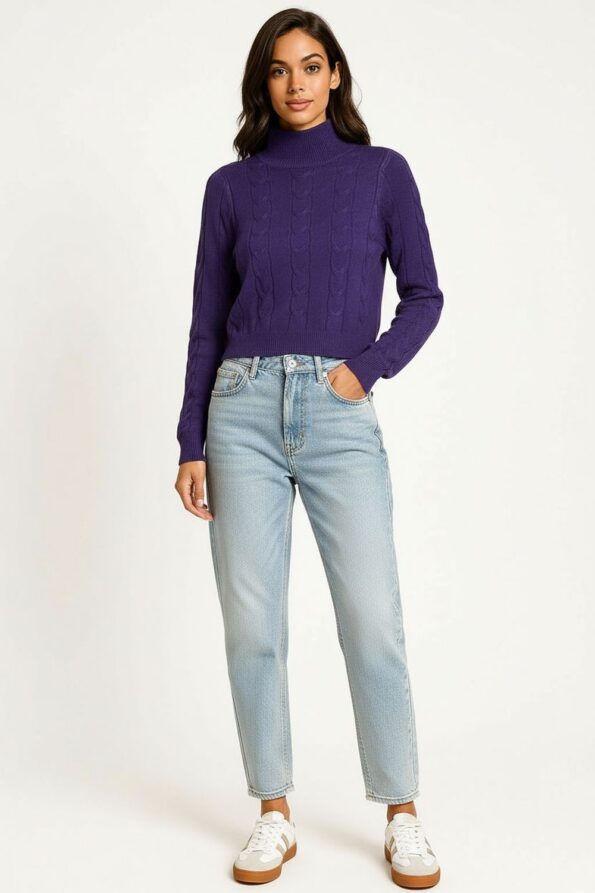 Suéter tejido con diseño de trenzas que aporta textura y estilo clásico, cuello alto que brinda abrigo y un toque sofisticado, manga larga con ajuste cómodo que favorece la movilidad, confección en punto elástico que se adapta suavemente al cuerpo ofreciendo confort y elegancia