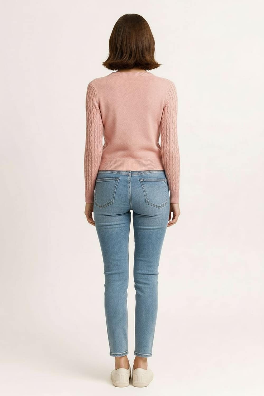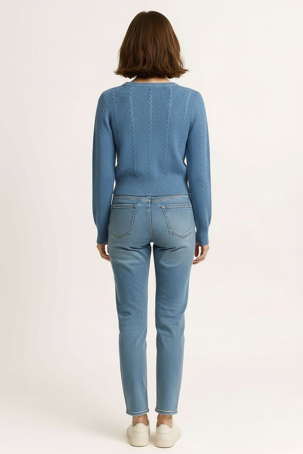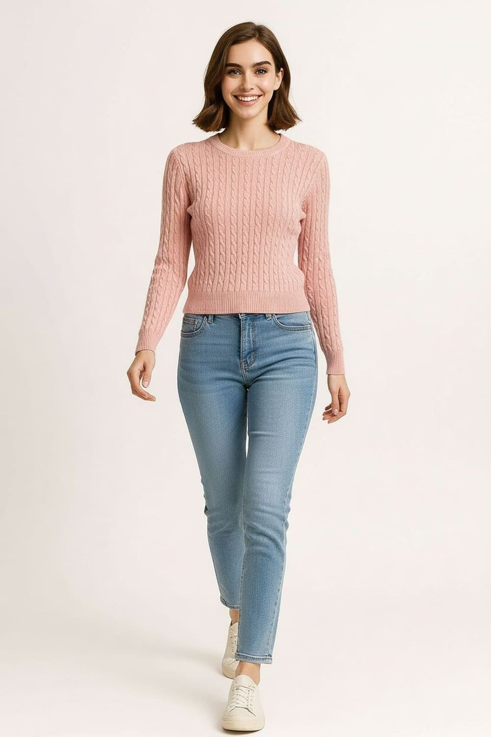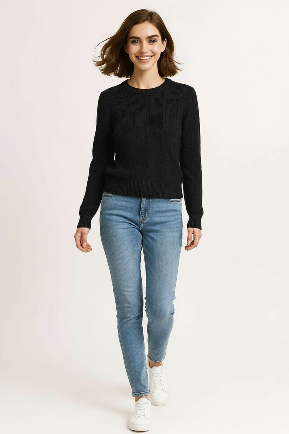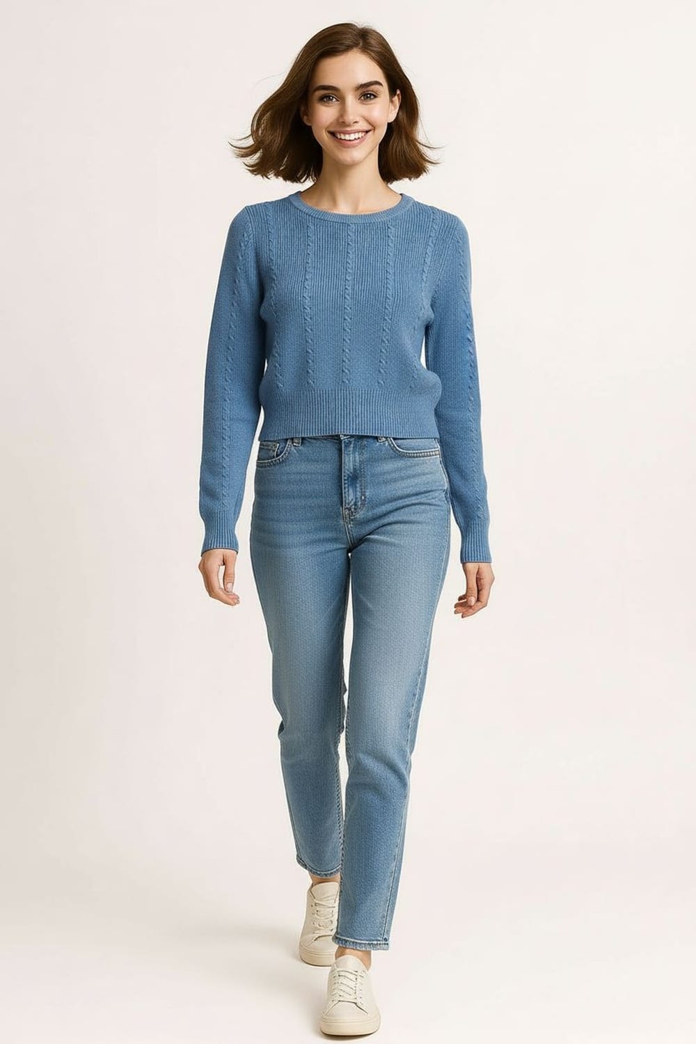 Suéter de manga larga con cuello redondo y ajuste al cuerpo, confección en tejido de viscosa con textura acanalada que aporta suavidad y elasticidad, largo corto que define la silueta, terminaciones en puños y pretina que brindan estructura, diseño cómodo para uso continuo