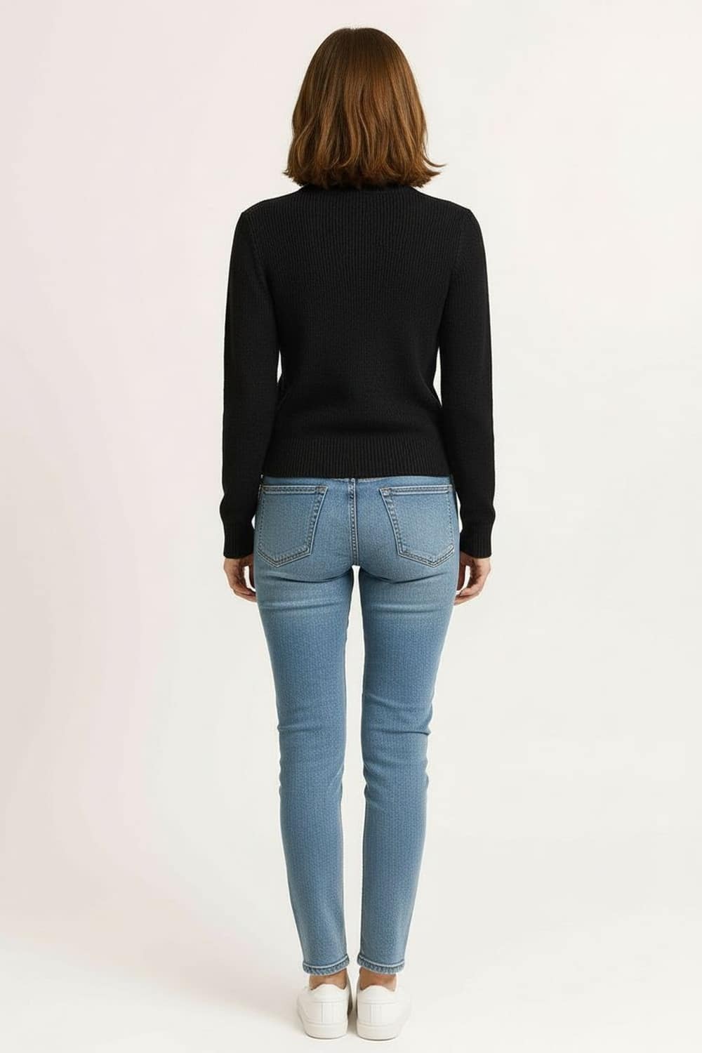 Suéter tejido con construcción acanalada de tacto suave, cuello alto integrado que aporta cobertura estructurada, manga larga de ajuste recto que mantiene proporción equilibrada, largo corto que define la silueta, terminaciones limpias que conservan la forma del tejido