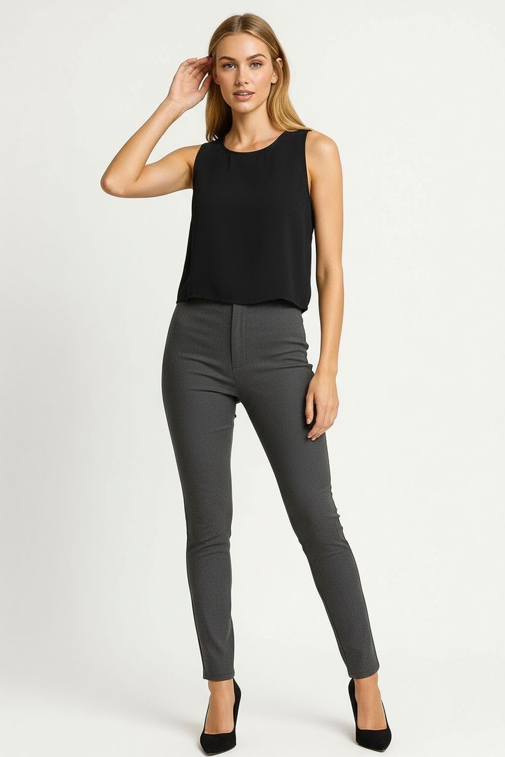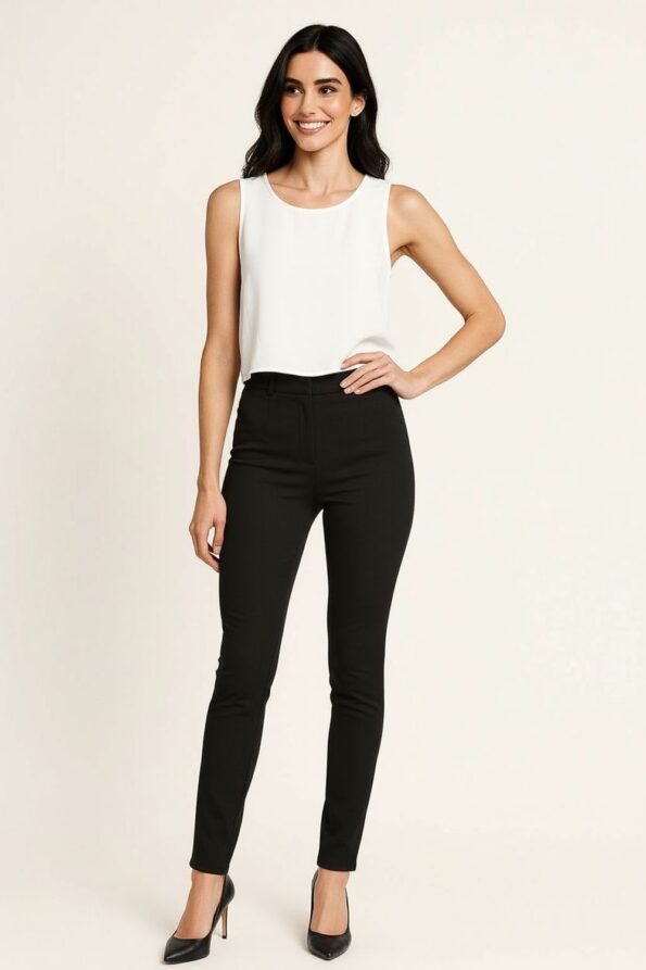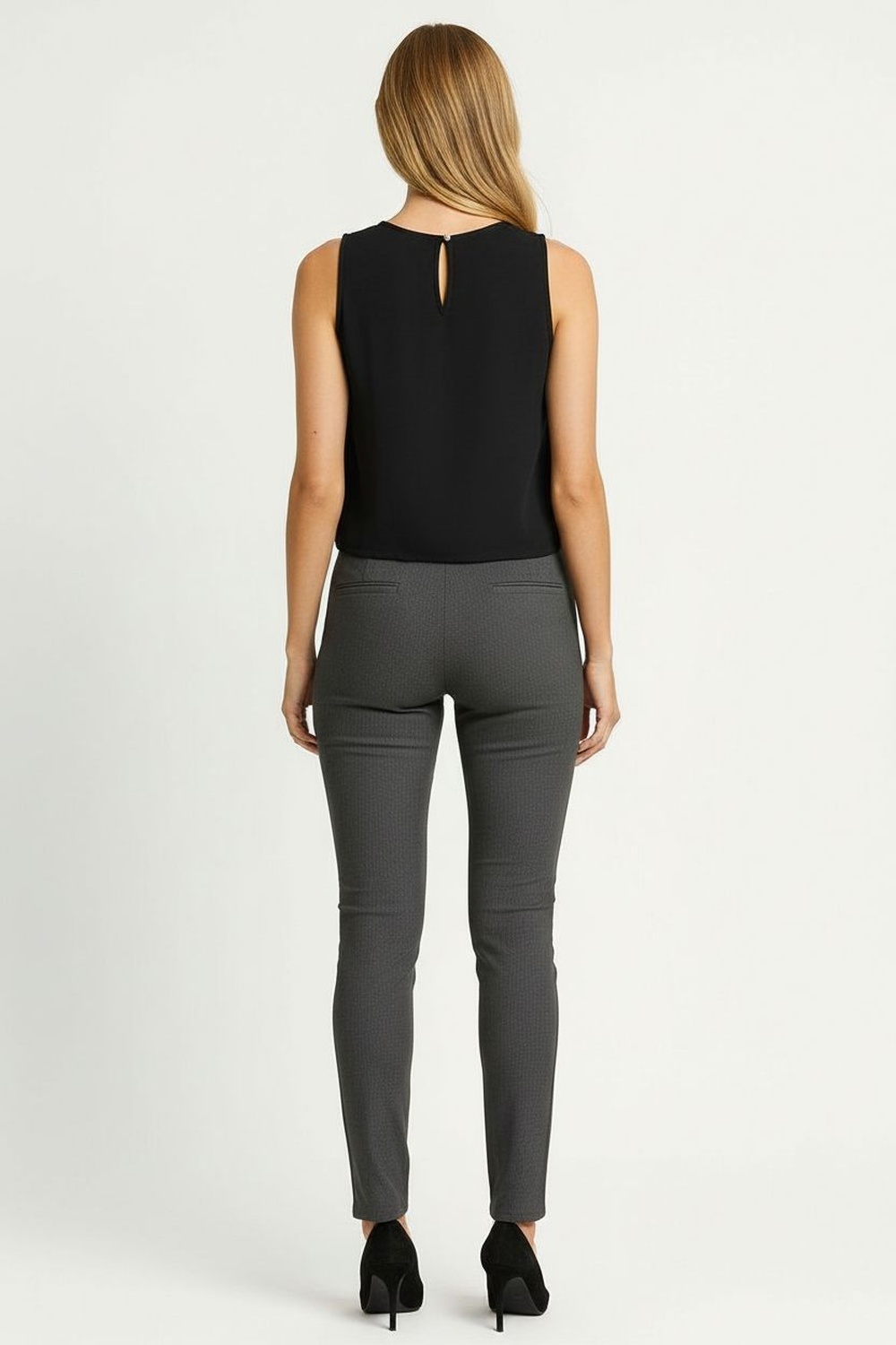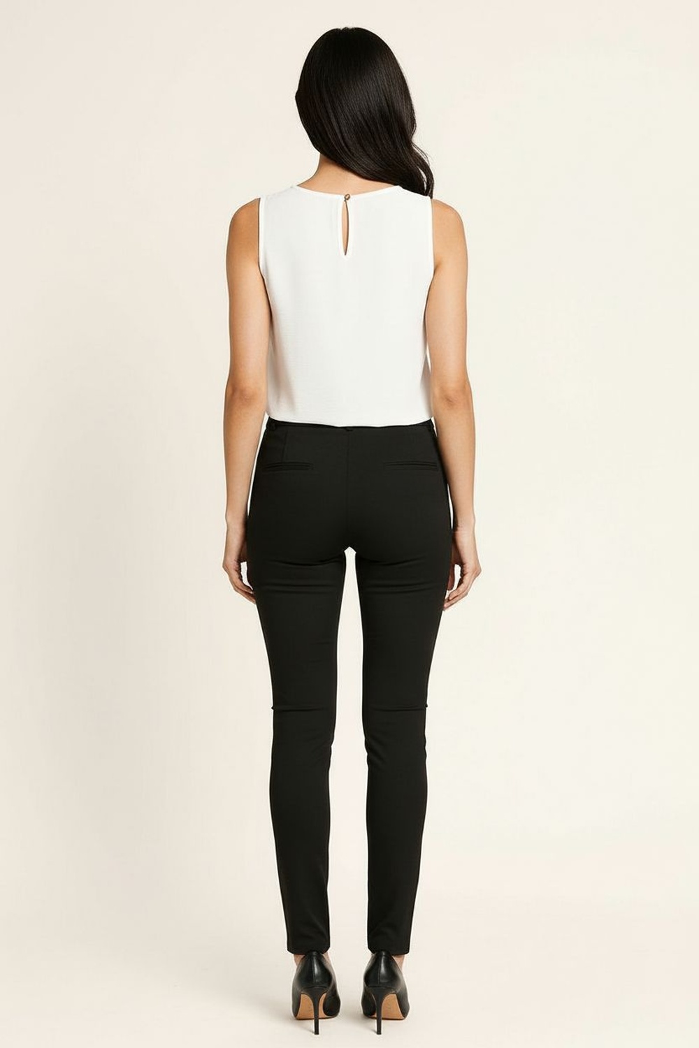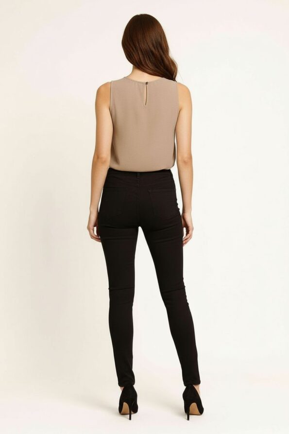 Top sin mangas confeccionado en tela ligera de textura suave que brinda frescura y comodidad, cuello redondo clásico que aporta versatilidad, diseño con abertura en forma de gota en la parte trasera que añade un detalle moderno y distintivo, corte recto que favorece distintas siluetas, dobladillo recto que asegura la estructura definida de la prenda y durabilidad en el uso continuo