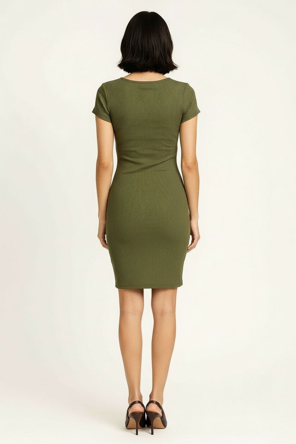 Vestido corto de manga corta con cuello redondo y cuerpo superior ajustado, confección en tejido acanalado que aporta elasticidad, corte en cintura con falda de caída suave, largo arriba de la rodilla que mantiene una silueta equilibrada