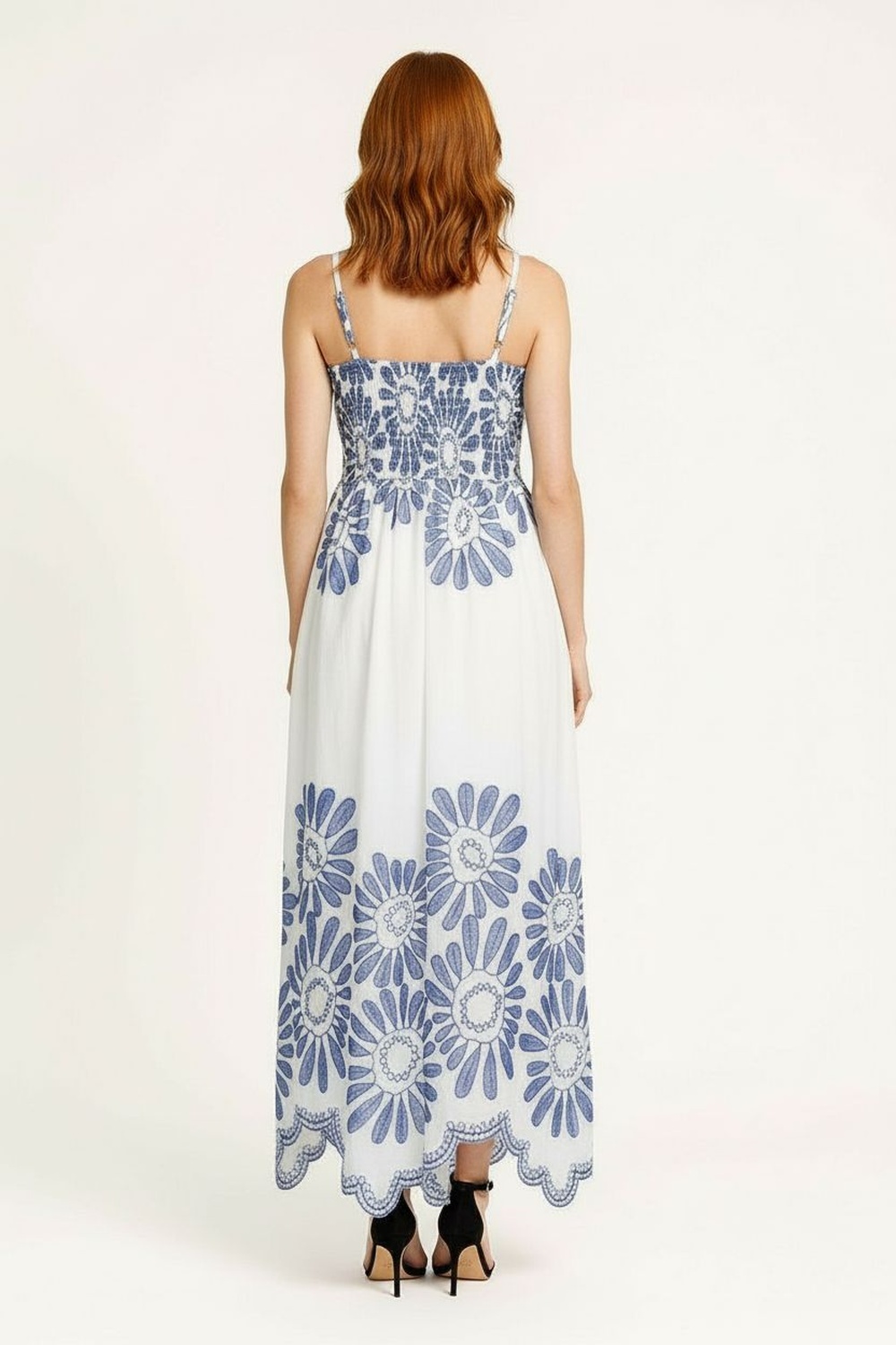 Vestido midi de tirantes delgados con escote en V y estructura ligera, diseño bordado en delantero que aporta textura y detalle artesanal, corte recto que cae con fluidez sobre la silueta, largo debajo de rodilla con terminación ondulada que realza el movimiento, confección en tejido suave al tacto que brinda comodidad y frescura durante el día