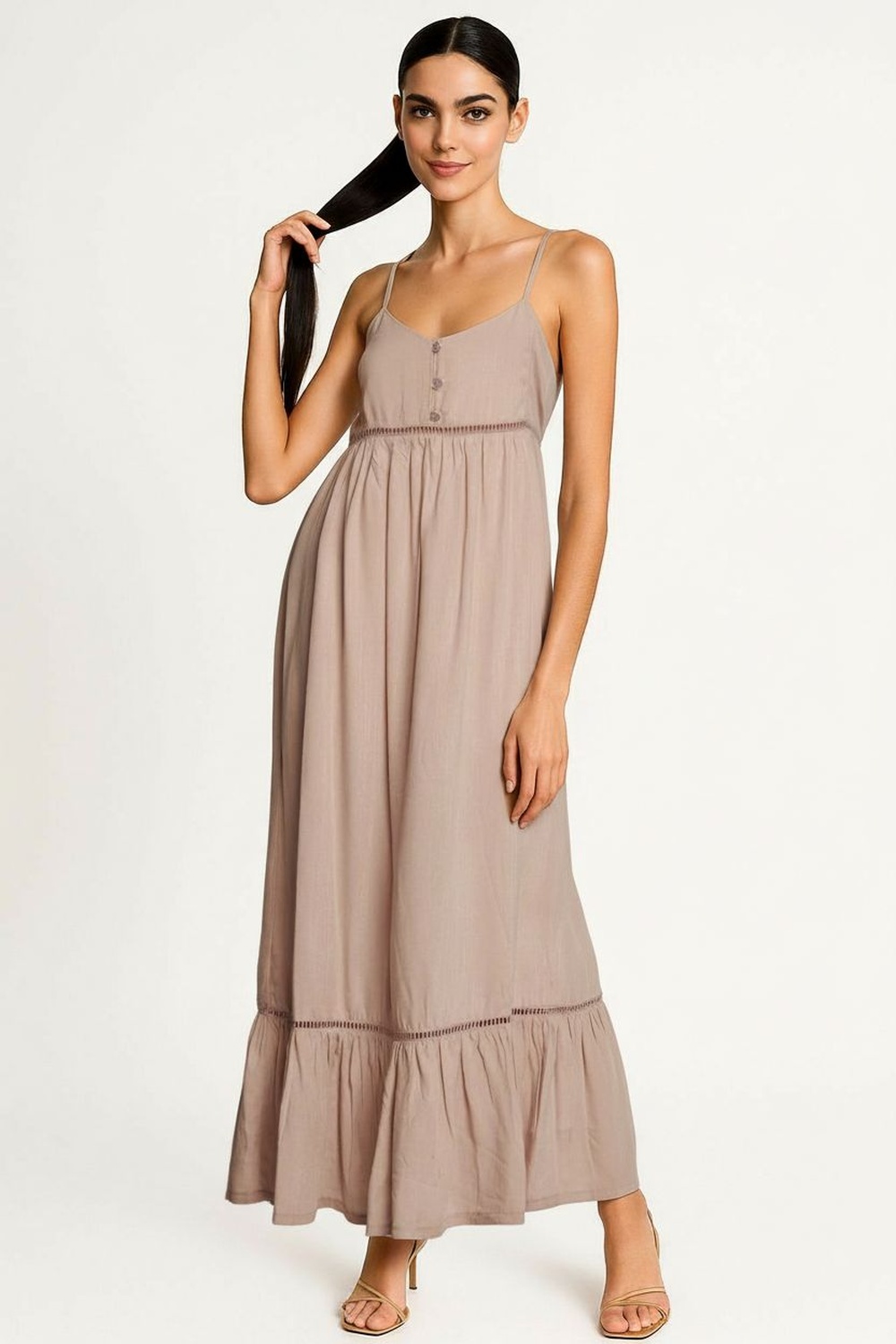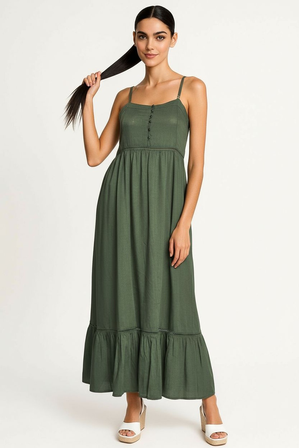 Vestido de tirantes delgados con escote recto y botonadura frontal funcional, corte bajo el busto que define la silueta, falda de largo midi con ligero vuelo que aporta movimiento, terminaciones limpias con acabado delicado, estructura ligera para uso prolongado
