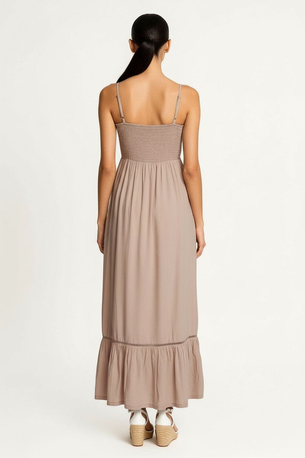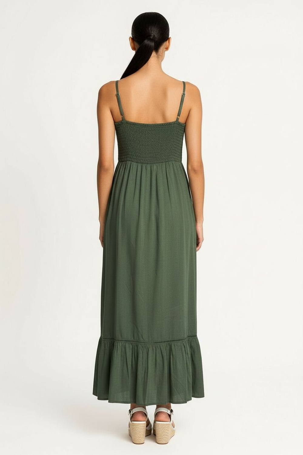 Vestido de largo midi con tirantes delgados ajustables, cuerpo superior con diseño enresortado que aporta ajuste flexible, falda de caída amplia que brinda movimiento natural, confección ligera que mantiene frescura y comodidad, estructura equilibrada que define la silueta sin rigidez