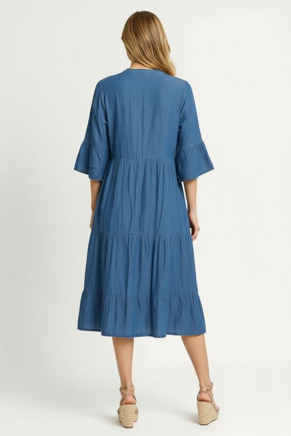 Vestido confeccionado en tela tipo cambray con corte en gajos que aporta movimiento y ligereza, escote redondo con abertura frontal y botonadura visible que añade un toque casual, mangas a media longitud con detalle de olan que suaviza el diseño, silueta amplia con caída fluida que brinda comodidad y frescura