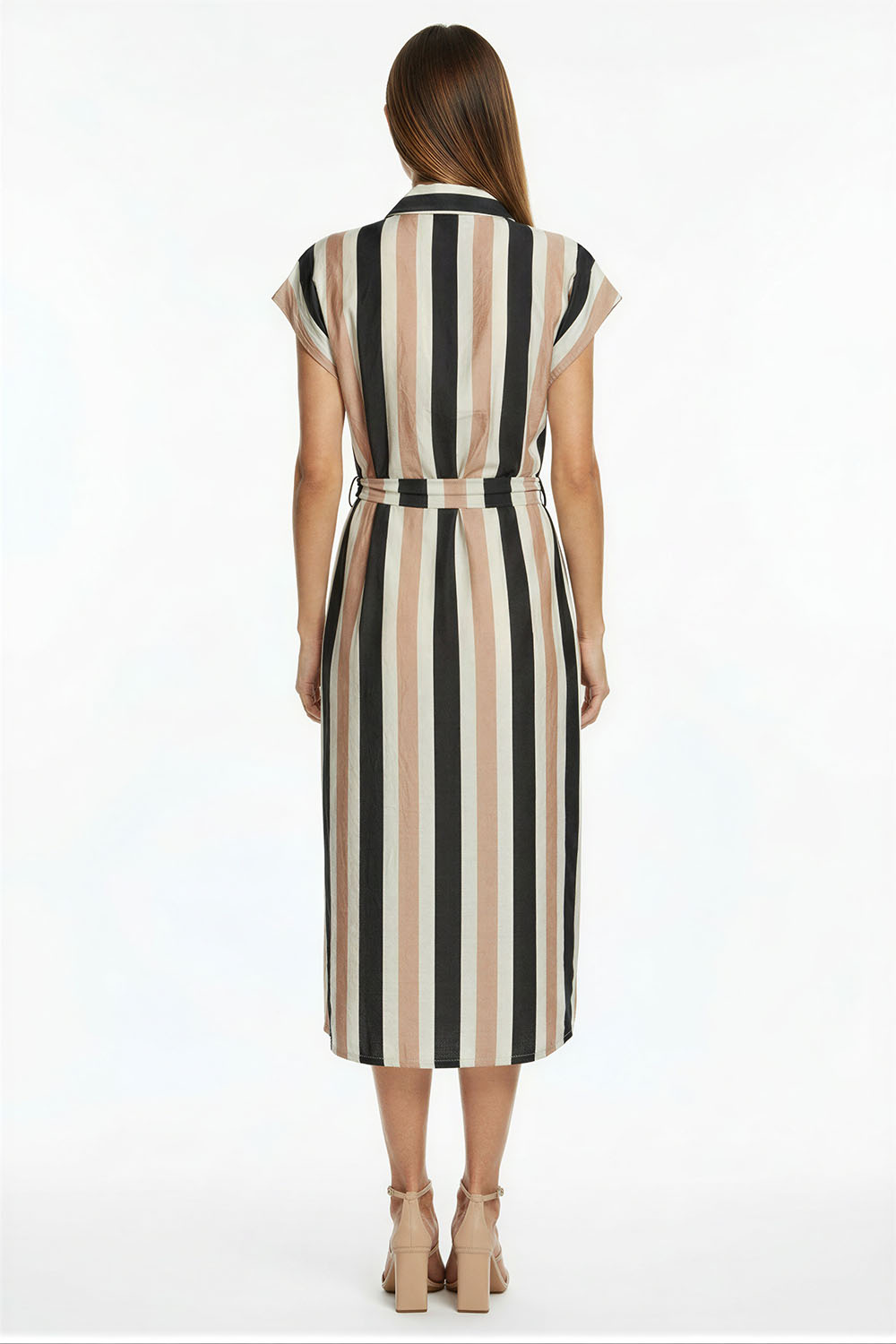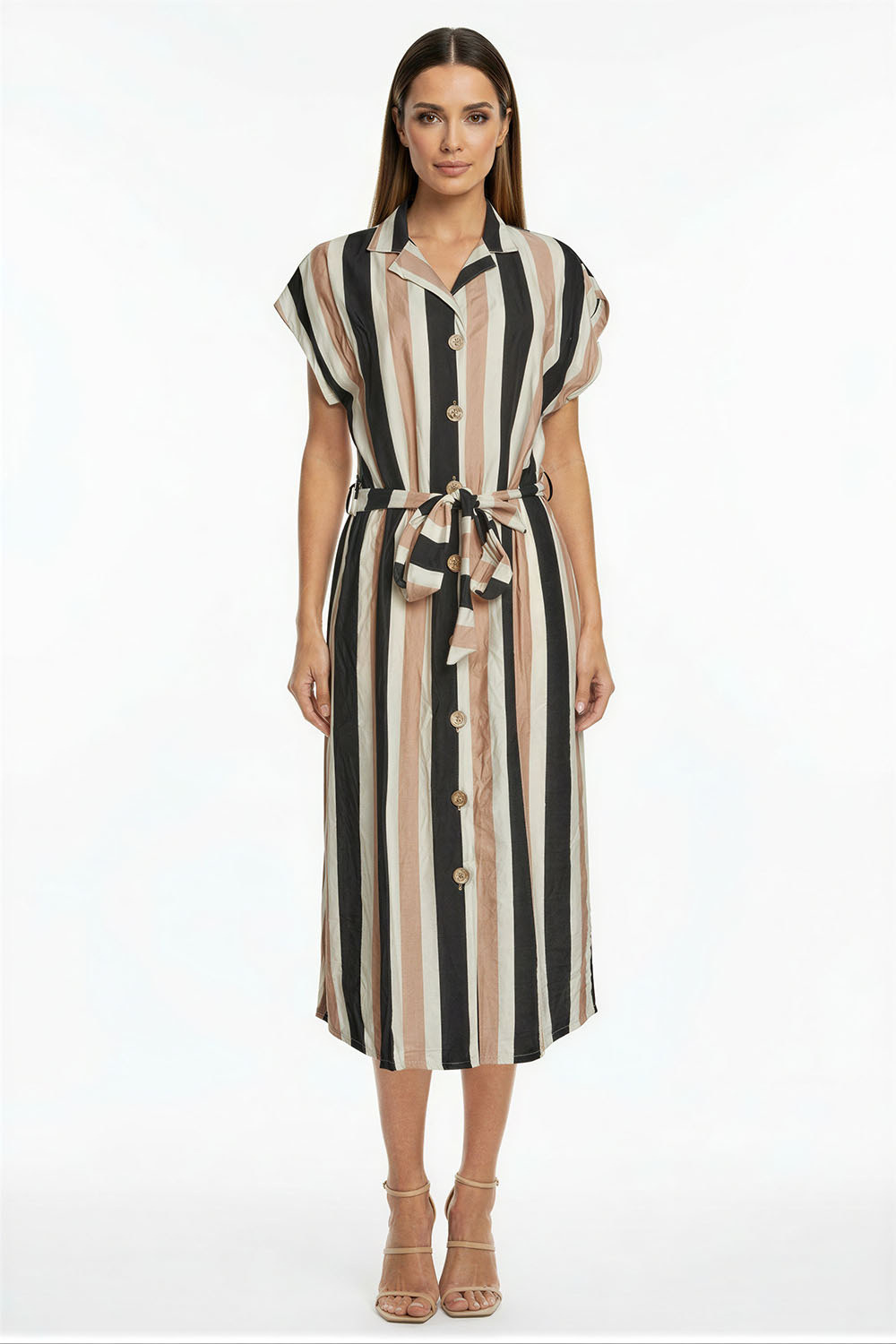 Vestido camisero de largo medio con cierre frontal de botones que facilita el uso, cuello tipo solapa que aporta estructura, manga corta con terminación doblada, cinturón del mismo tejido para ajuste a la cintura, confección ligera que brinda comodidad y libertad de movimiento, caída recta que estiliza la silueta