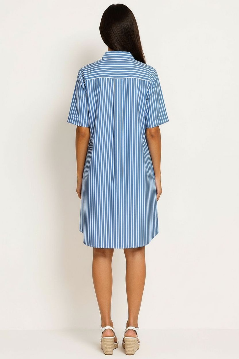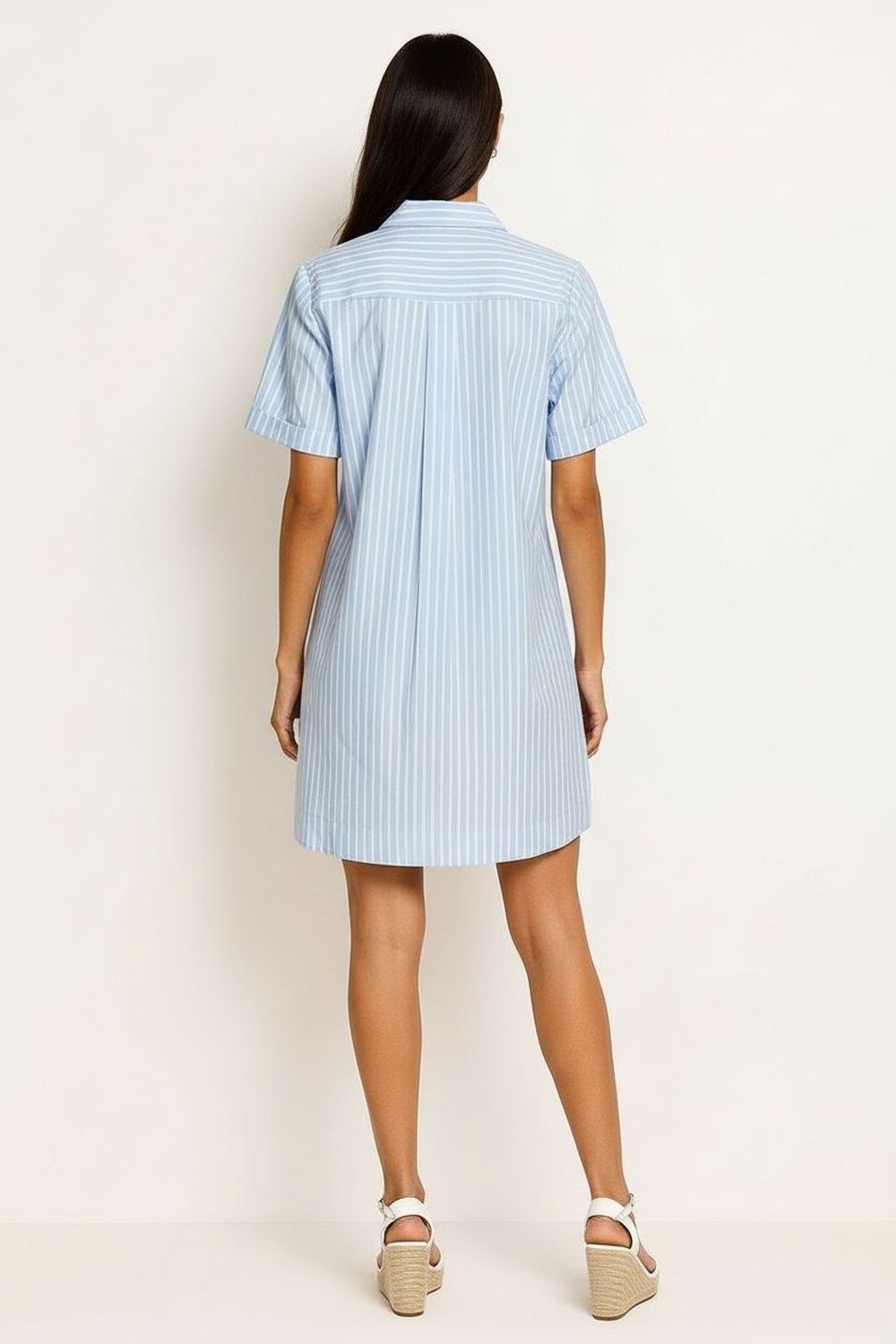 Vestido camisero corto con cuello clásico y botonadura frontal completa que facilita el ajuste, manga corta con dobladillo que aporta estructura, corte recto con largo arriba de la rodilla que brinda comodidad al caminar, confección en tela ligera de tacto suave con acabado definido en bastilla