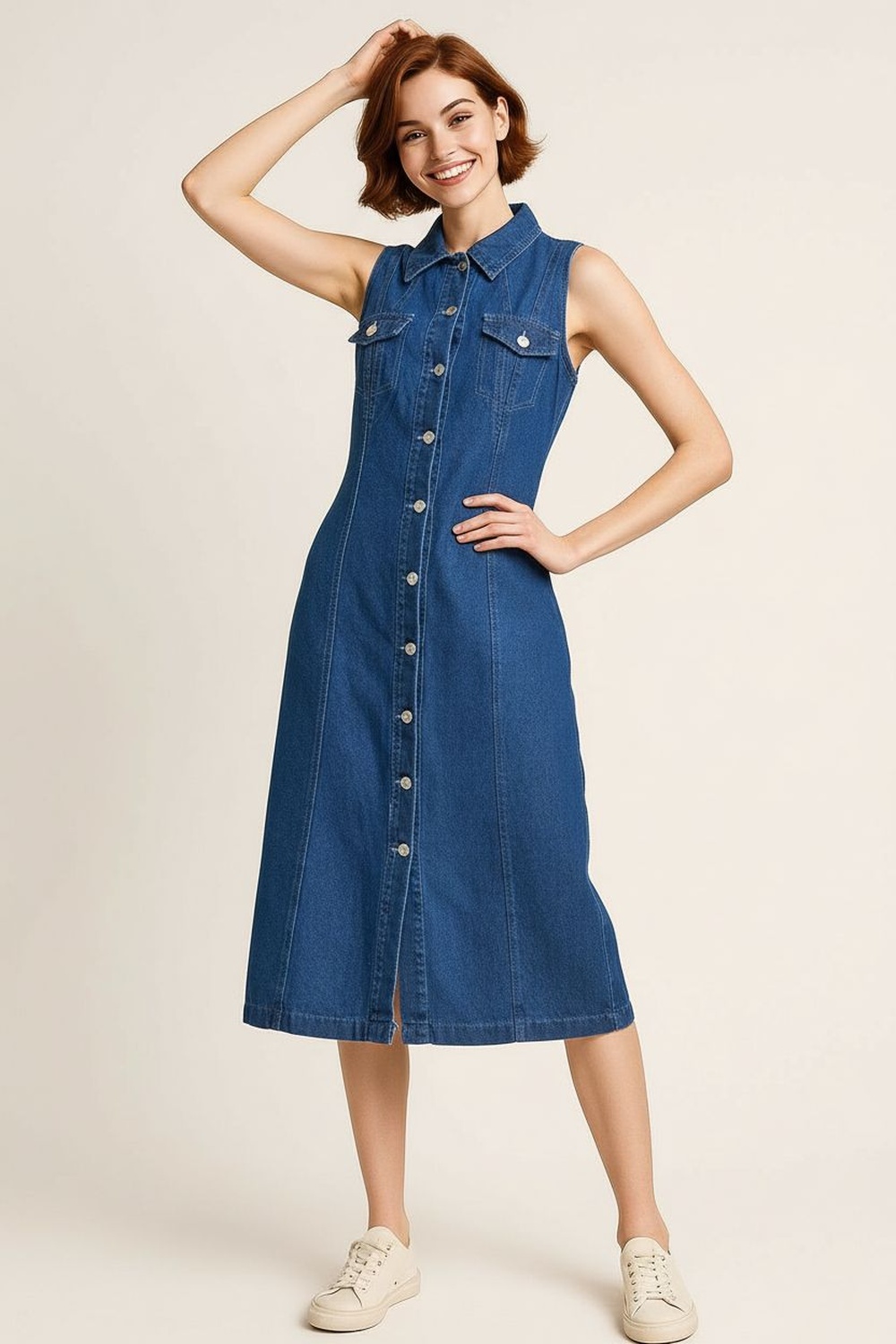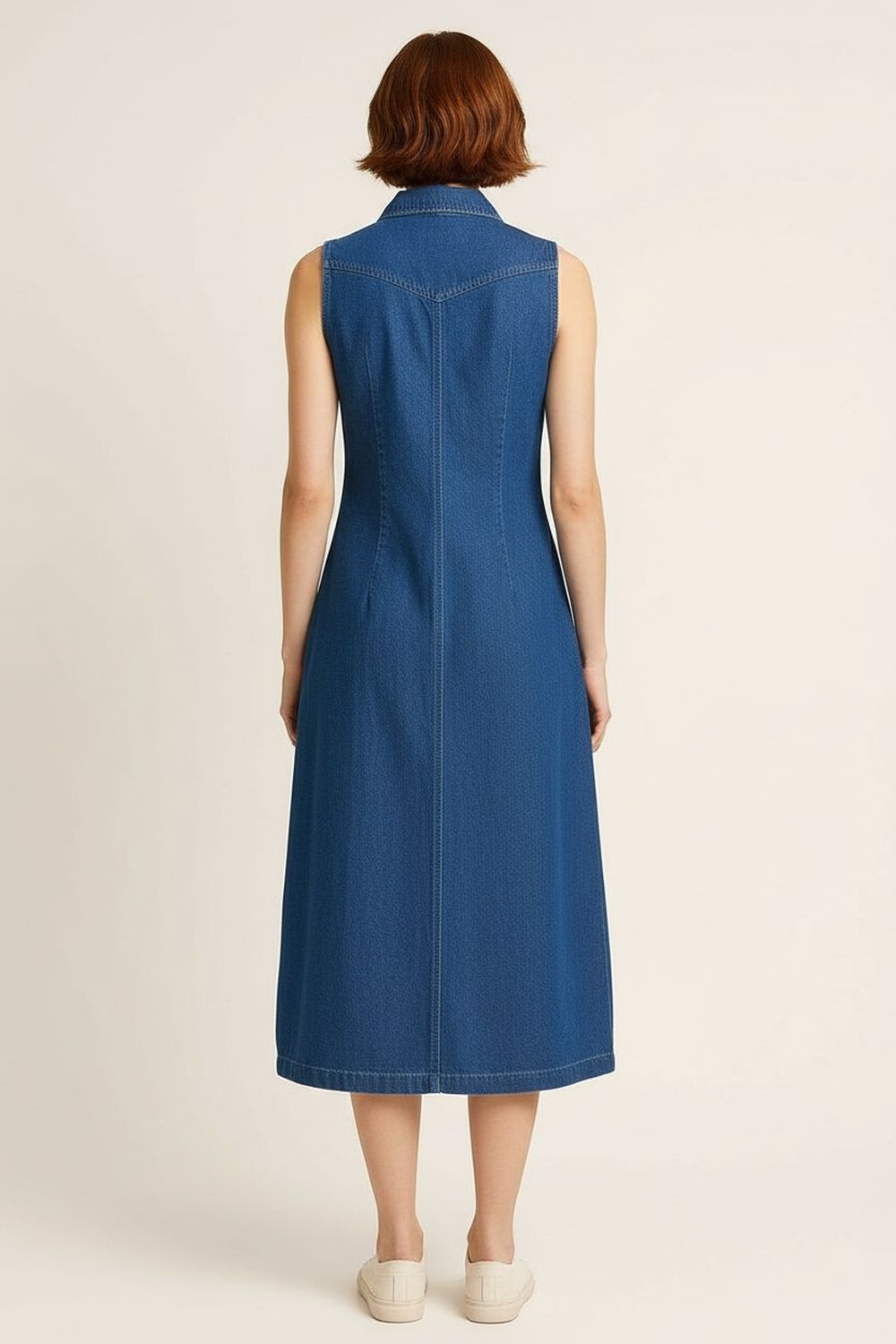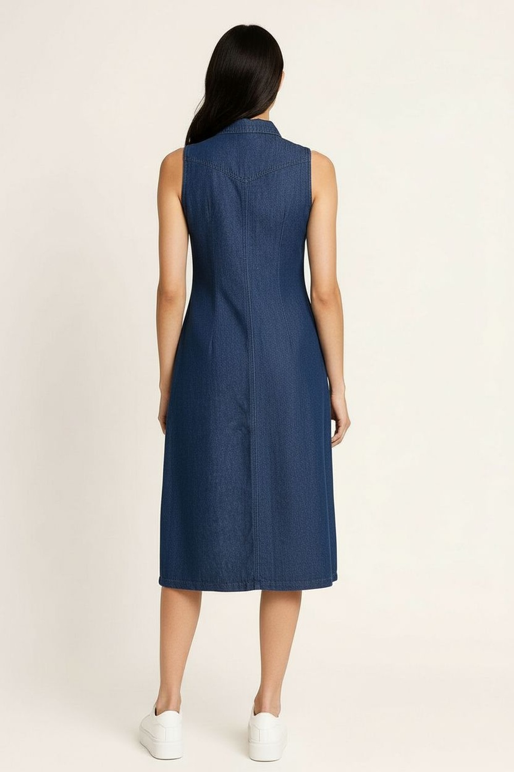 Vestido camisero de largo midi con silueta recta que ofrece caída uniforme, cuello clásico estructurado que aporta presencia visual, botonadura frontal funcional de arriba hacia abajo que facilita el ajuste, sisas amplias que permiten libertad de movimiento, corte limpio en la bastilla que mantiene proporción y equilibrio, confección en mezclilla rígida que aporta cuerpo y resistencia a la prenda