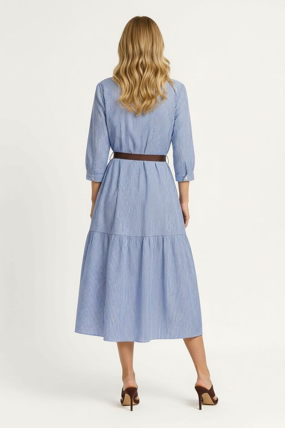 Vestido camisero con manga tres cuartos que aporta cobertura equilibrada, cuello clásico con botonadura frontal funcional, cintura con cinturón integrado que permite ajuste definido, largo midi que ofrece versatilidad, confección en tejido ligero con buena caída
