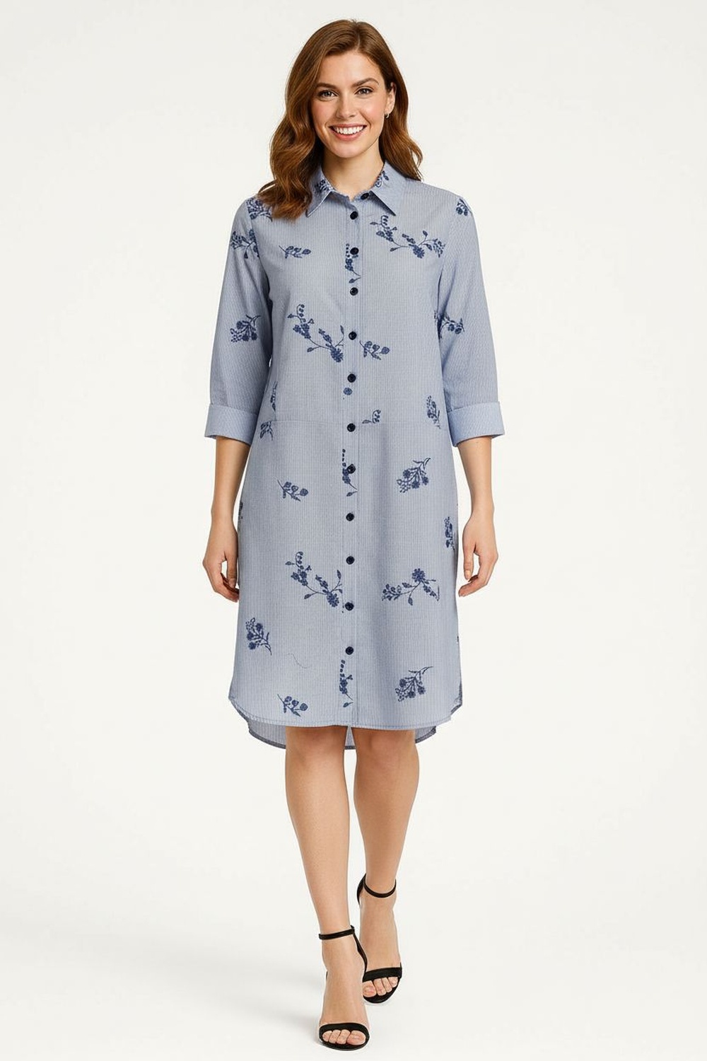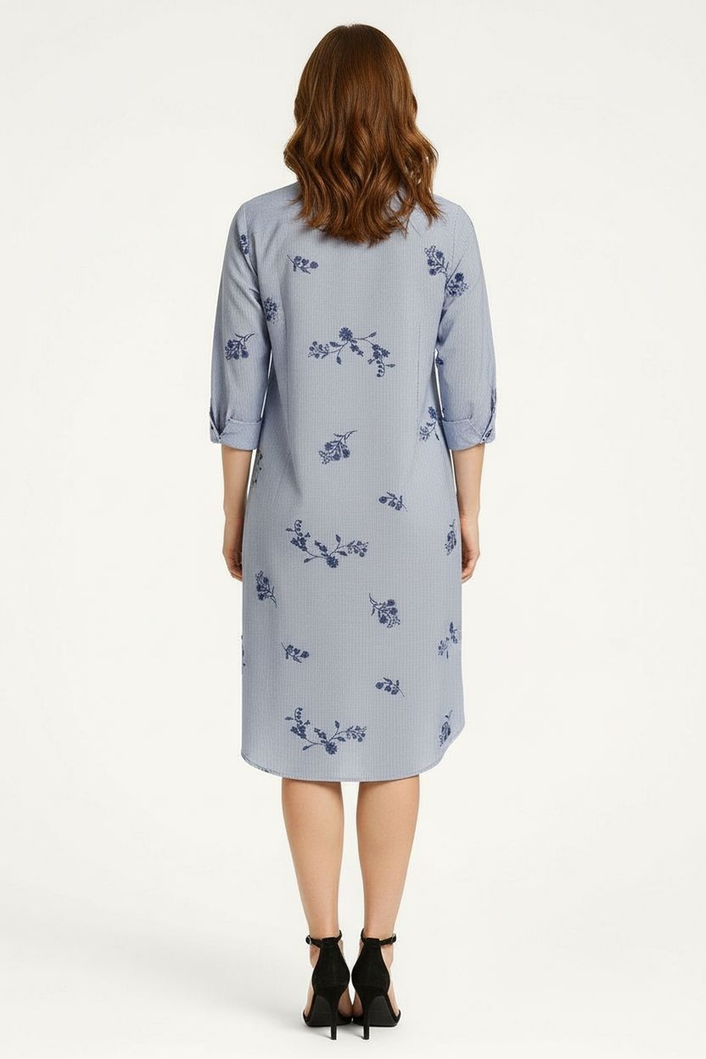 Vestido camisero de manga tres cuartos, cuello con solapa, botonadura frontal, largo medio, caída ligera, estructura fluida