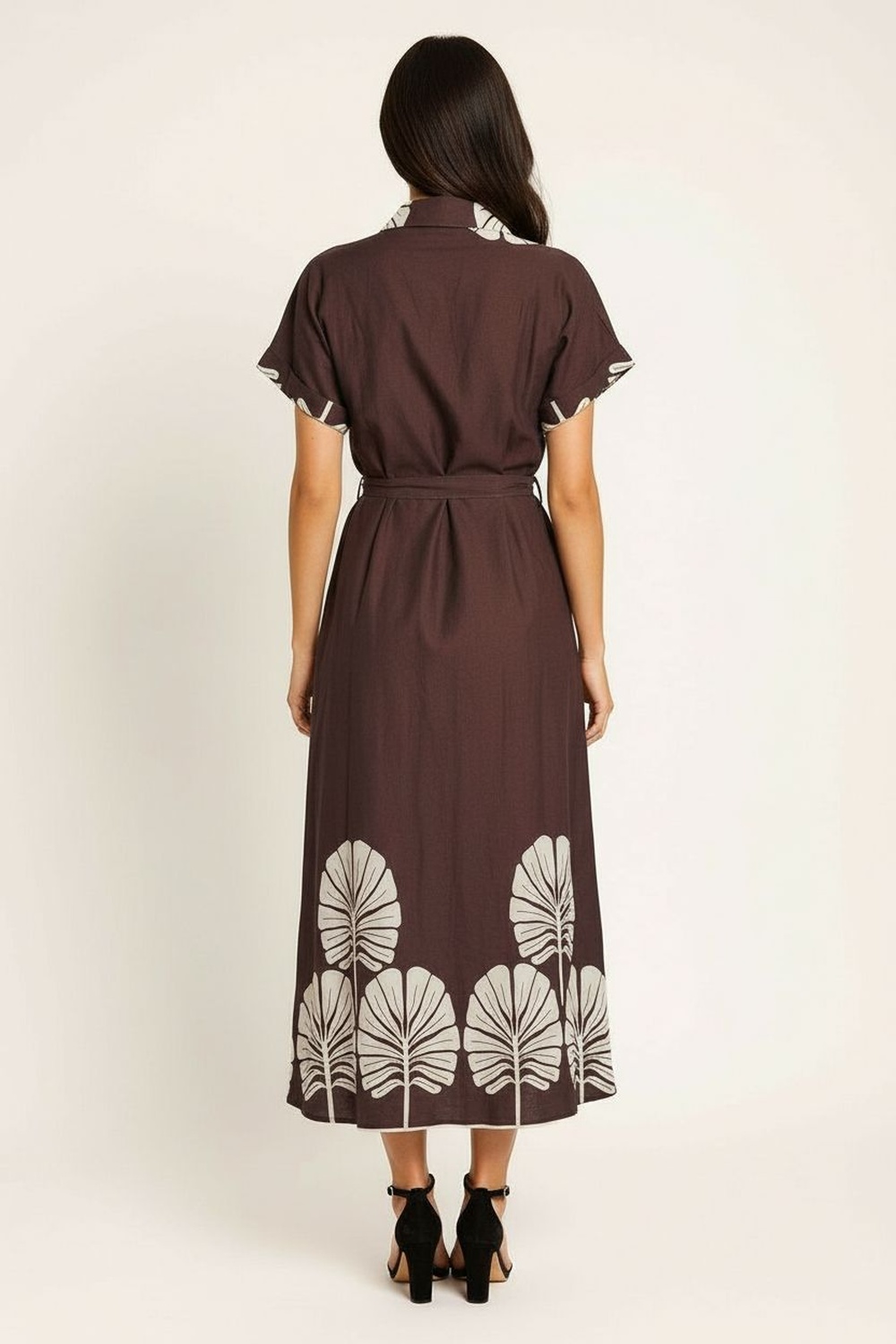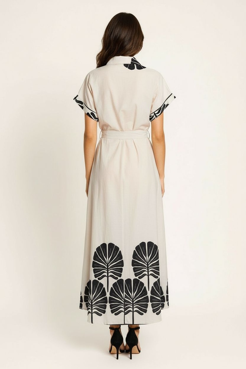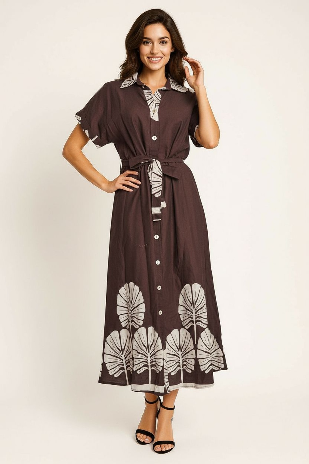 Vestido camisero de largo midi con cuello estructurado y escote en v funcional, botonadura frontal completa que facilita el ajuste y uso diario, manga corta amplia que aporta comodidad y libertad de movimiento, cintura ajustable con cinta integrada que define la silueta, falda de caída fluida con amplitud equilibrada que aporta presencia visual y versatilidad en el uso, confección ligera con acabado suave al tacto y estructura estable